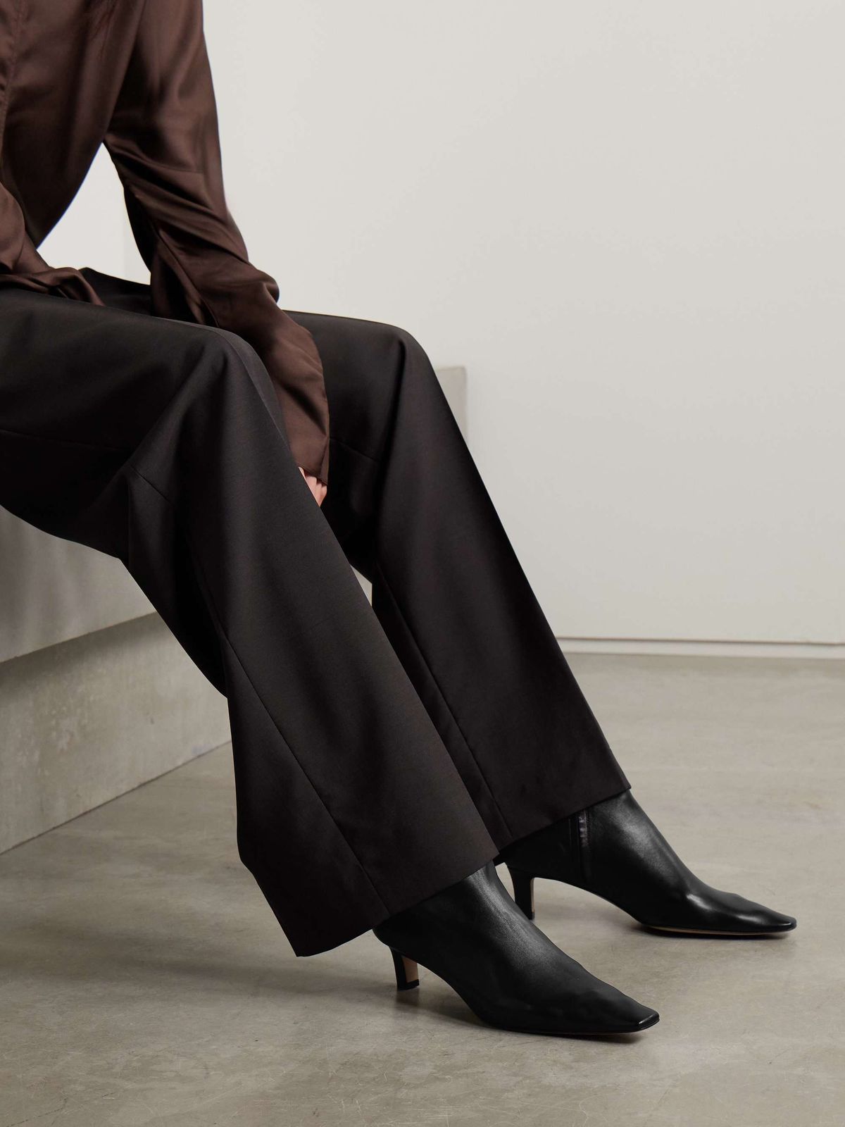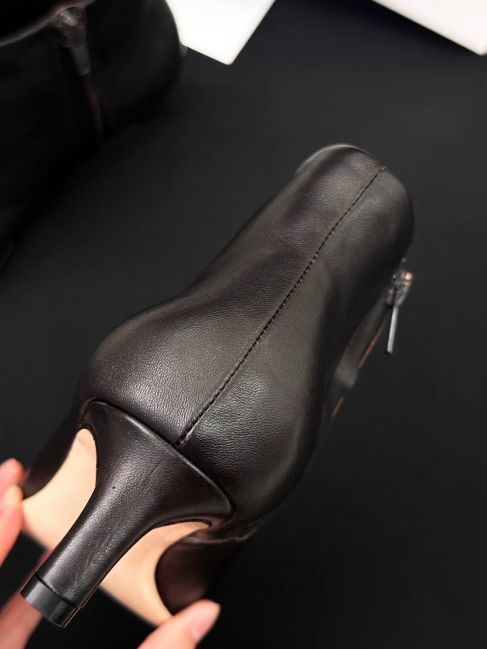 Ботильоны выполнены из высококачественной гладкой кожи премиум-класса, с характерным квадратным носком, который добавляет современный, графичный акцент и визуально удлиняет силуэт. Высота каблука — около 7 см, тонкого и устойчивого, обеспечивающего грациозную походку без ущерба для комфорта. Задник слегка приталенный, с мягкой посадкой на лодыжке, а внутренняя стелька из овчины создает эффект "носок в обуви" — теплая, дышащая и гипоаллергенная.