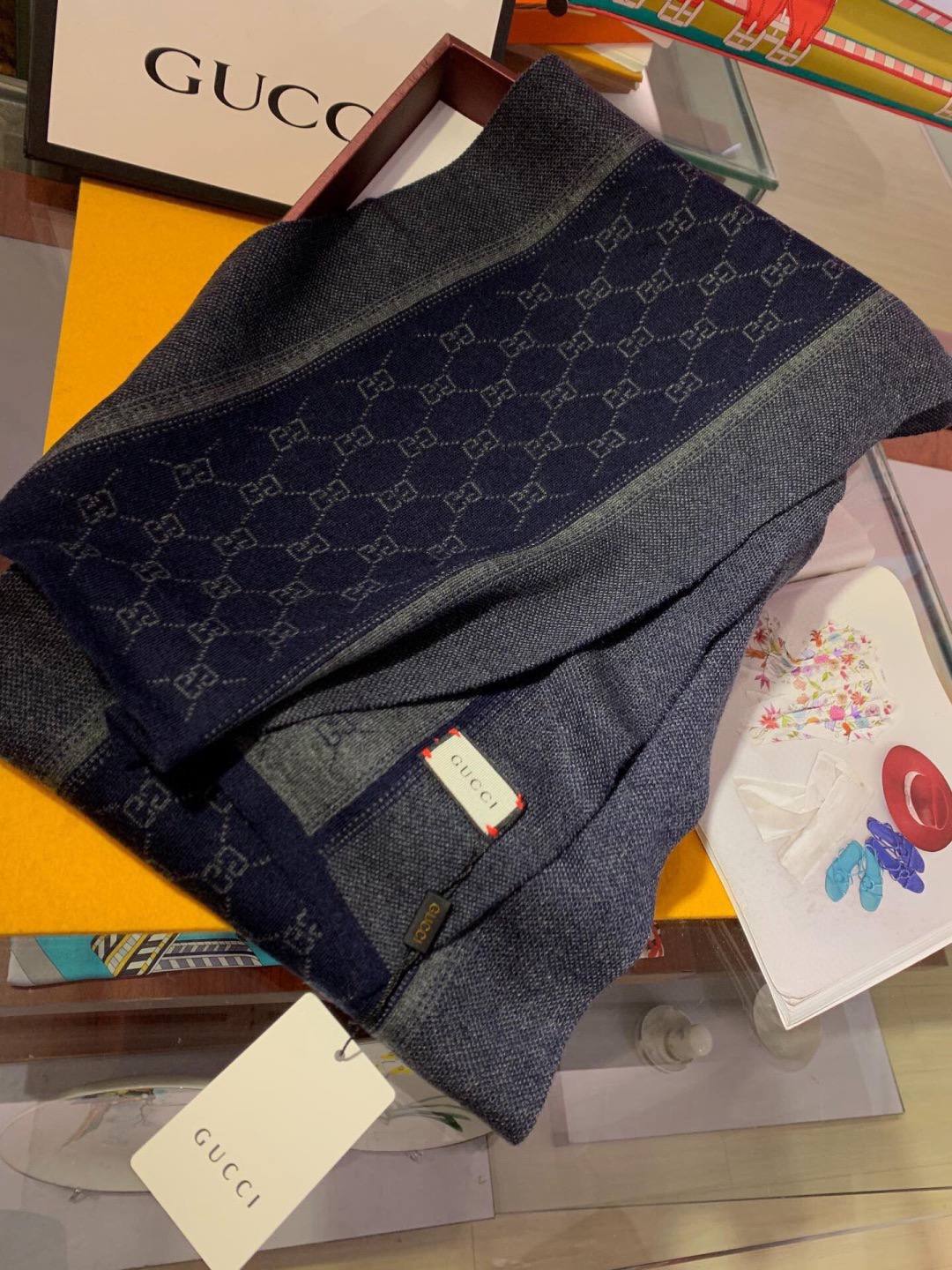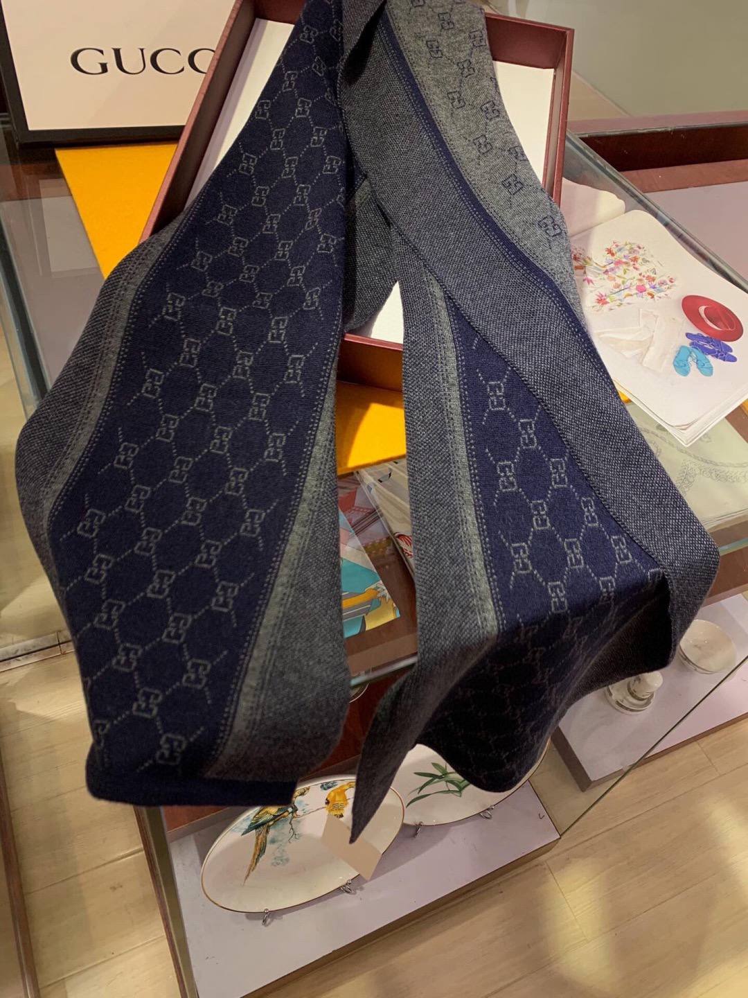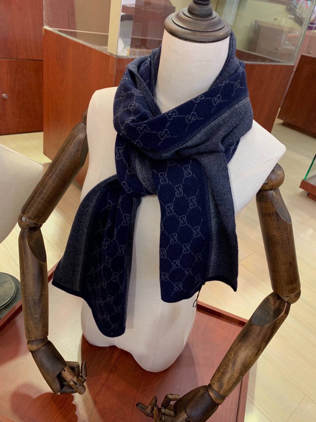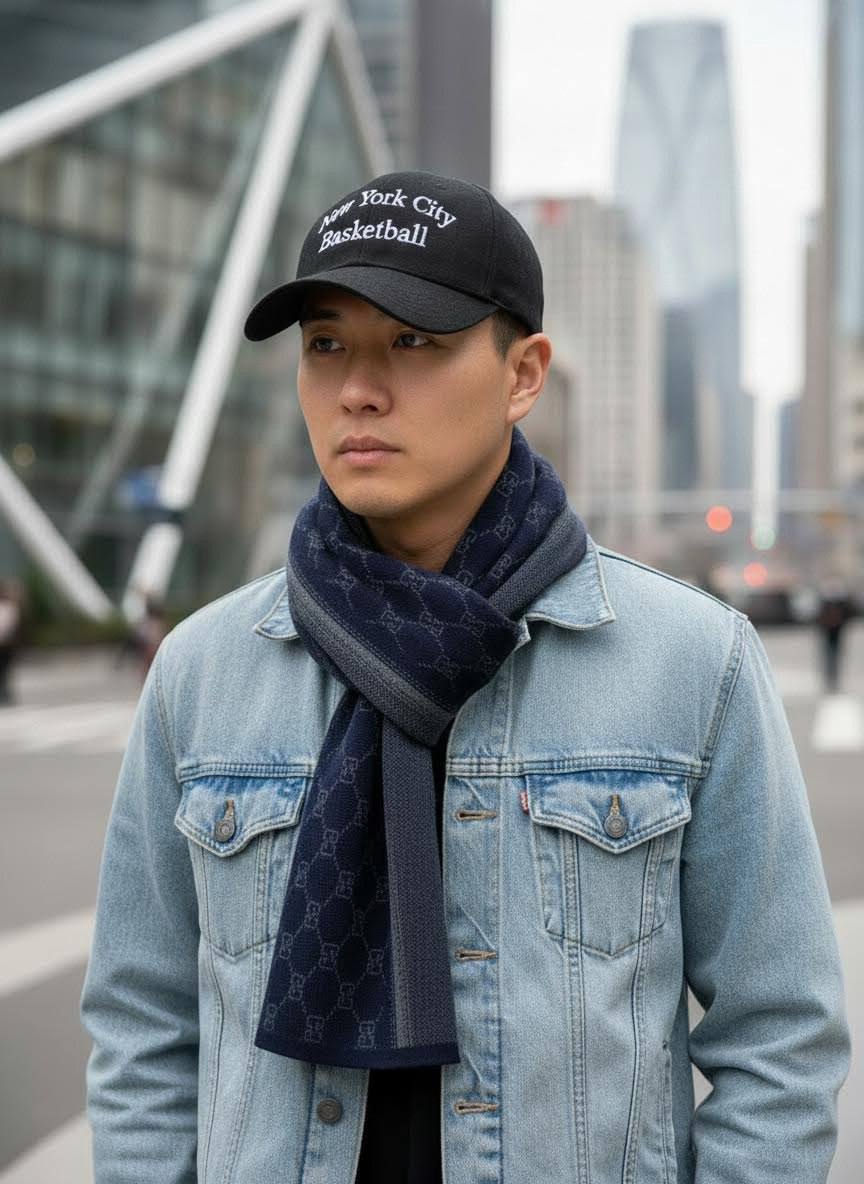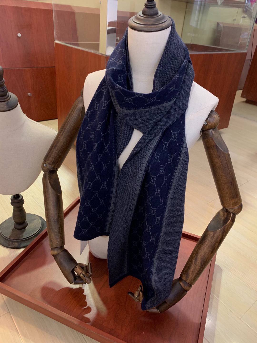Элегантный мужской шарф из мягкого высококачественного кашемира. Глубокий темно‑синий тон с тональным жаккардовым узором «GG» и контрастной фактурной стороной создают двусторонний, утончённый образ, идеально подходящий для повседневного и вечернего гардероба.