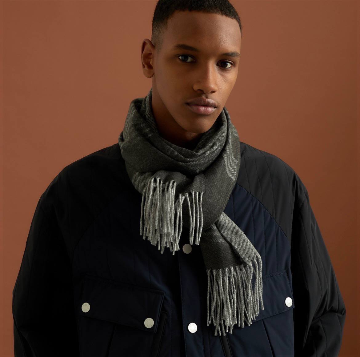 Элегантный и теплый мужской шарф HERMÈS, выполненный из мягкого кашемира. Двухцветная реверсивная модель с изысканным жаккардовым орнаментом и аккуратной бахромой по краям — идеальное сочетание классики и современного стиля.