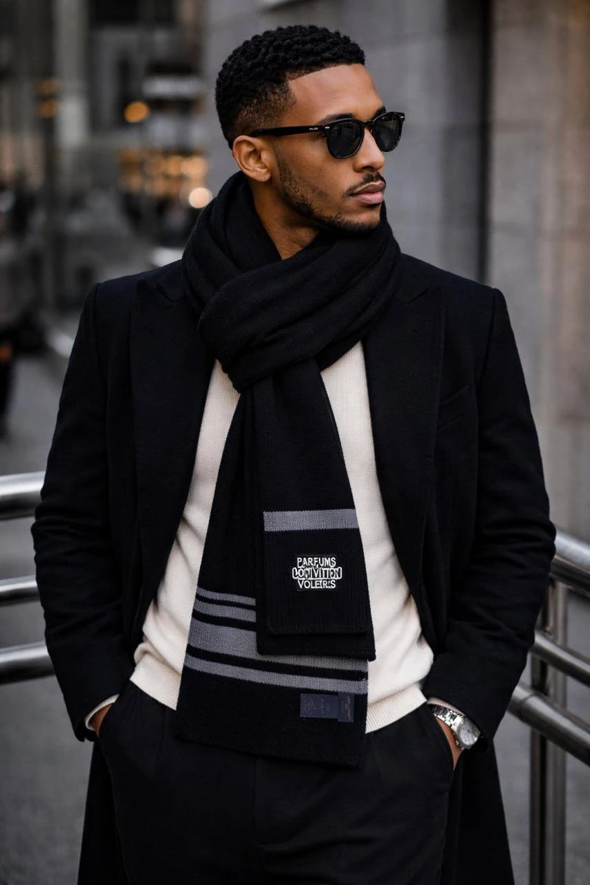 Элегантный мужской шарф LOUIS VUITTON, выполненный из премиального кашемира, сочетает в себе лаконичную роскошь и практичность. Глубокий черный цвет с контрастной серой отделкой делает аксессуар универсальным для городских и деловых образов.