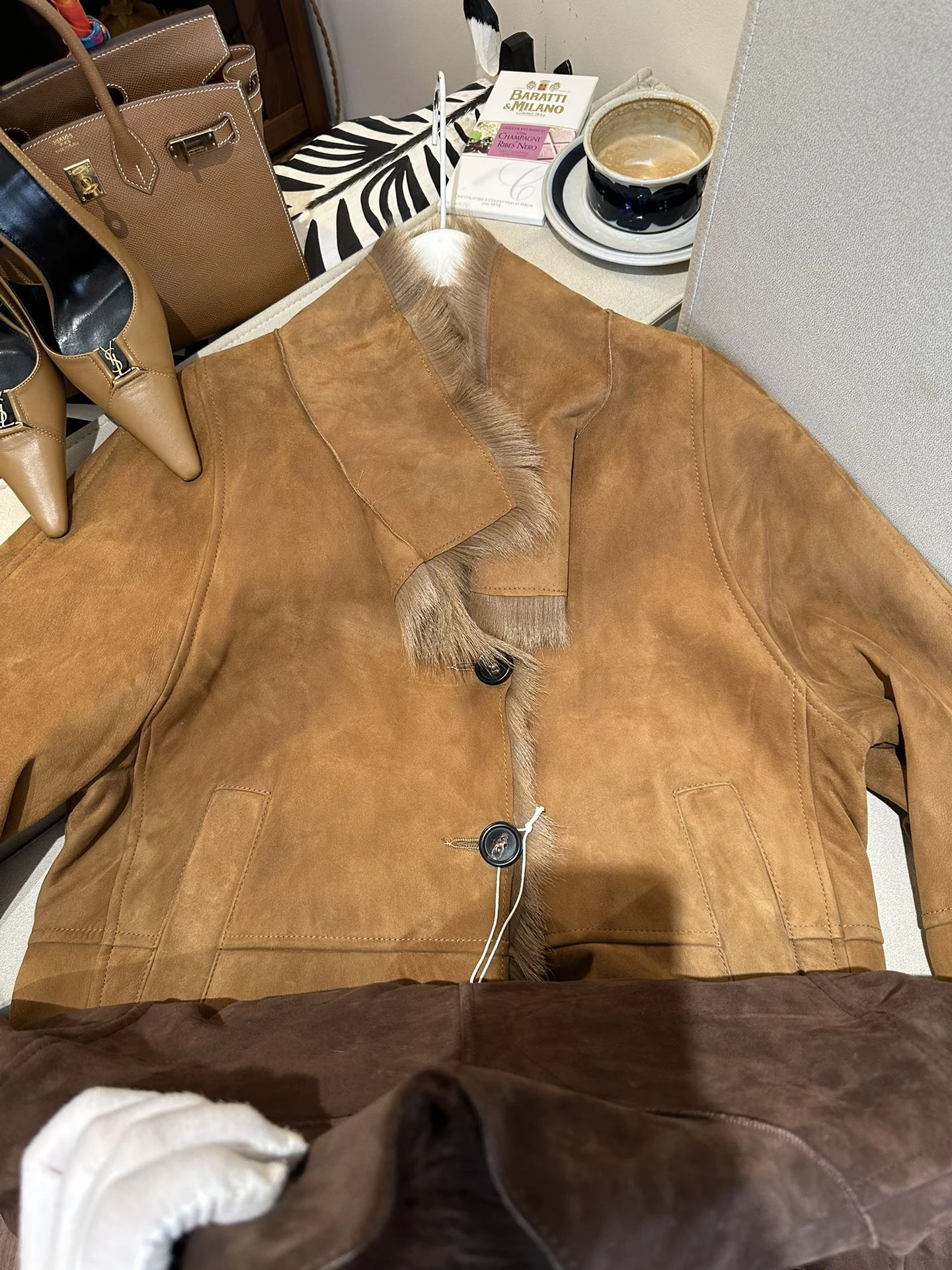 • Мех: Дублёнка выполнена из натурального меха лисы, который славится своей мягкостью и теплотой. Мех обладает характерным блеском и приятной текстурой, что делает каждую вещь уникальной.