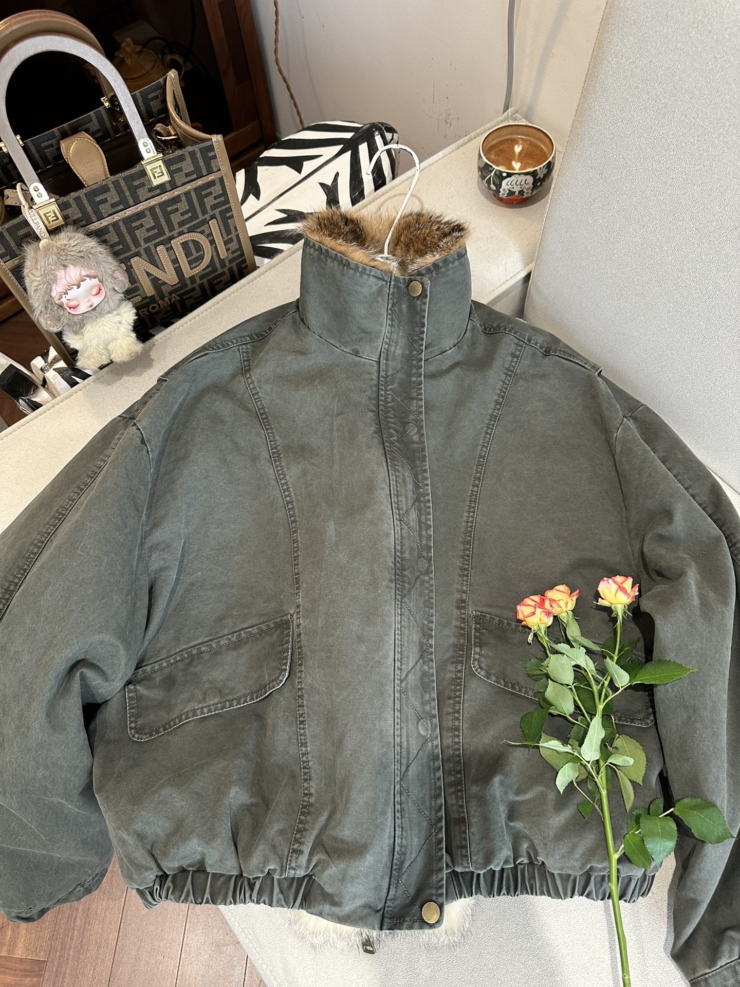 • Меховая отделка: пышный меховой воротник и декоративная меховая планка, обрамляющие линию застёжки, придают модели роскошный, но сдержанный вид.