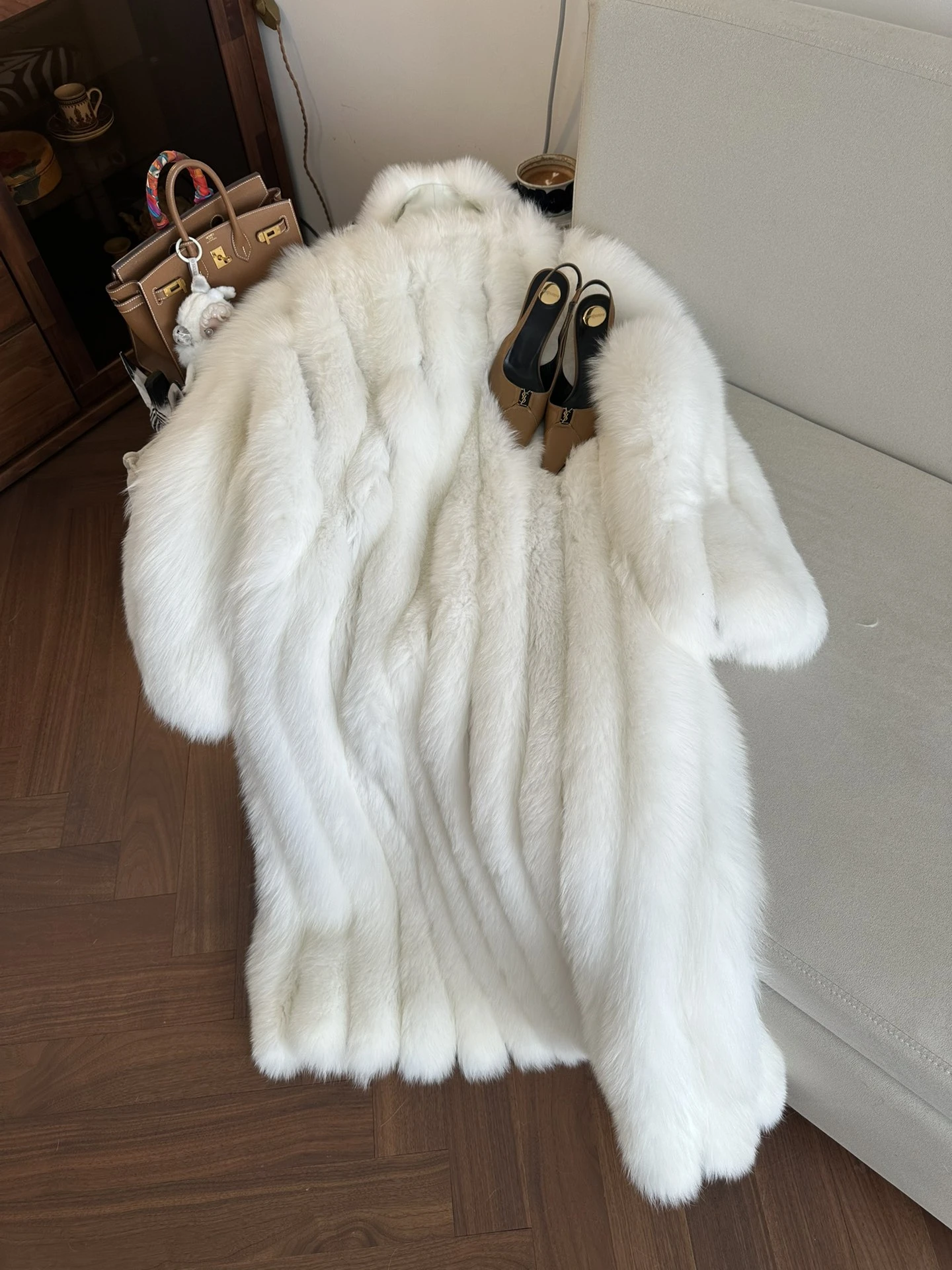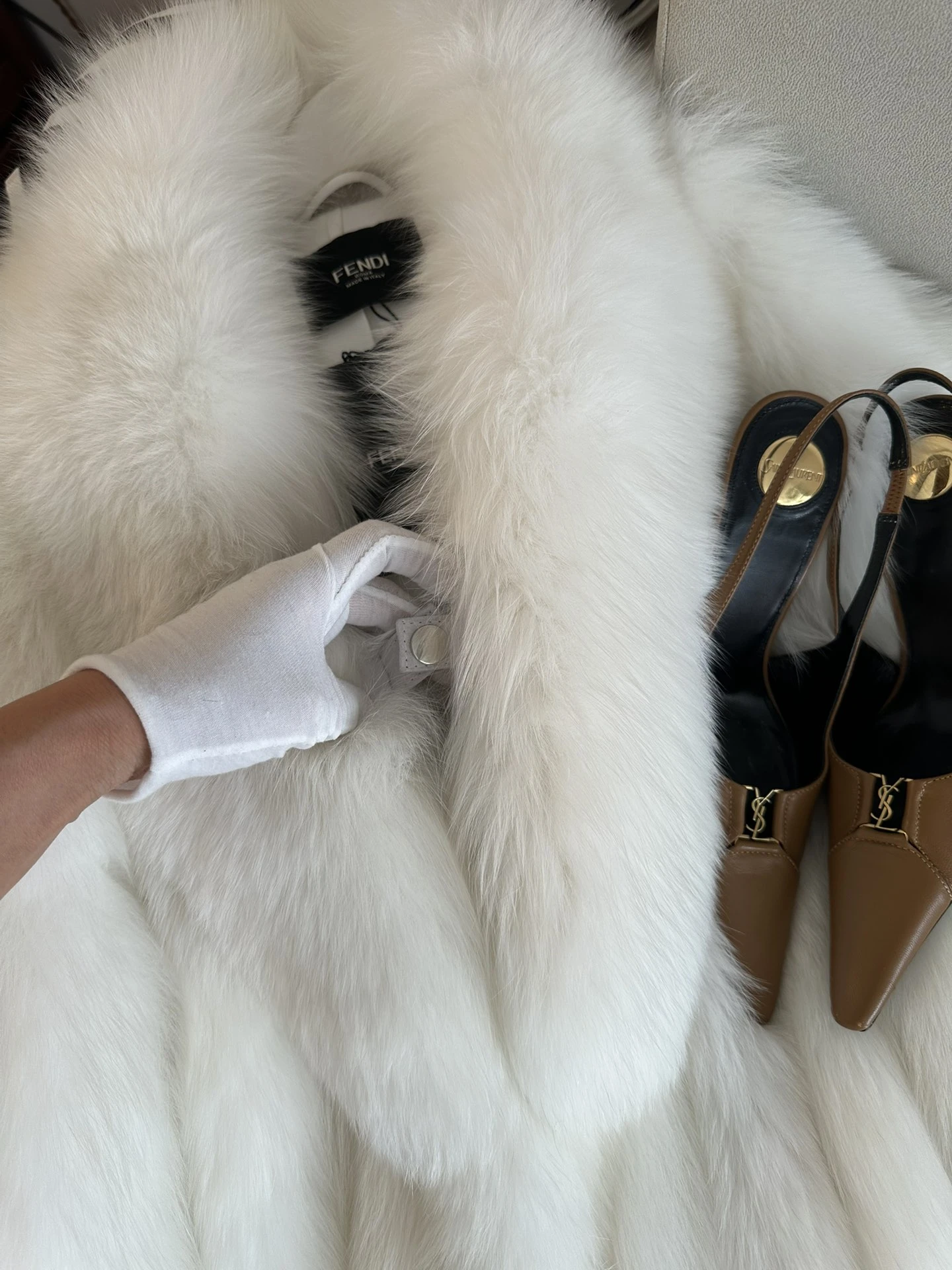 Погрузитесь в мир роскоши и элегантности с женской шубой FENDI, выполненной из натурального меха лисы. Модель представлена в безупречно белом оттенке, который подчеркивает изысканную структуру и объем меха, а также добавляет образу утонченную свежесть.