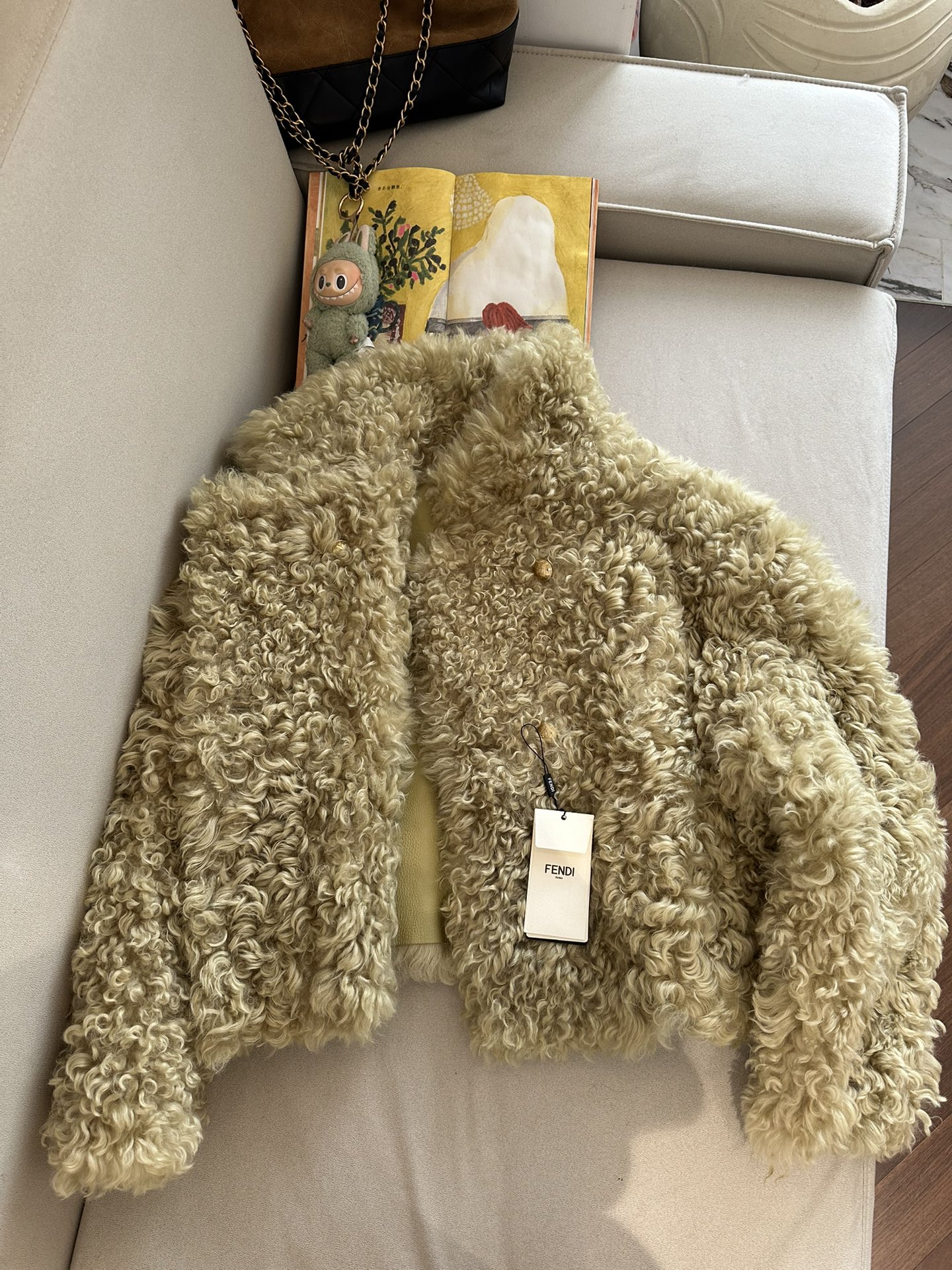 Шуба из овчины FENDI — уютная и стильная интерпретация повседневной элегантности, созданная для суровой зимы и городских прогулок. Модель представлена в нежно-сером оттенке с плотной, пушистой текстурой, которая выглядит как мягкий «тедди» и гарантирует комфорт и тепло даже при низких температурах.