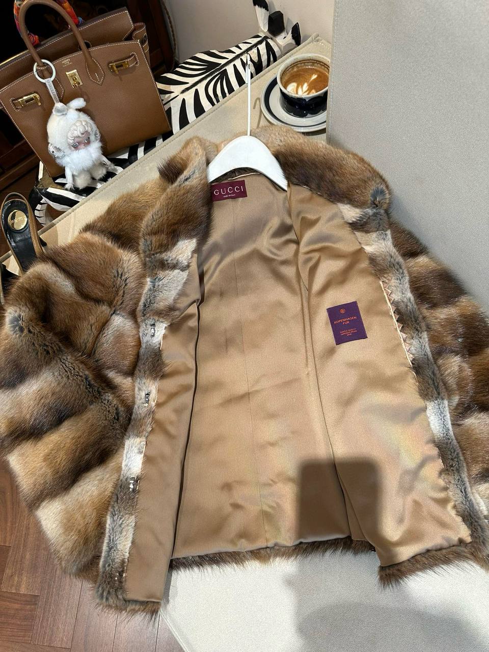 Детали: Каждая деталь шубы продумана до мелочей: от изящной застежки до подкладки премиального качества. Внутренняя отделка выполнена из шелка, что добавляет дополнительный комфорт и роскошь. Фирменный логотип GUCCI деликатно вышит на подкладке, подтверждая подлинность и эксклюзивность изделия.