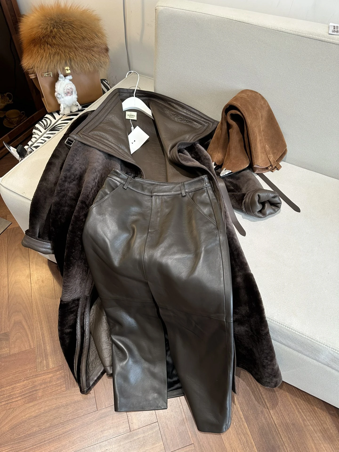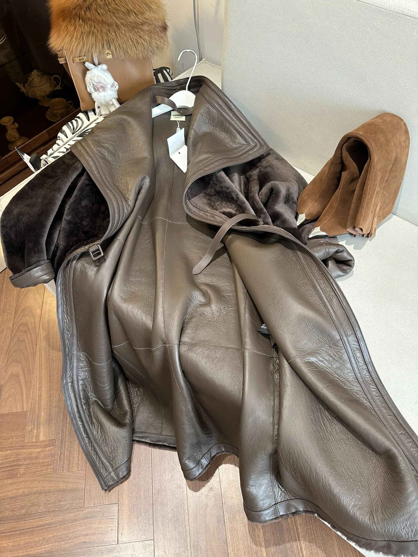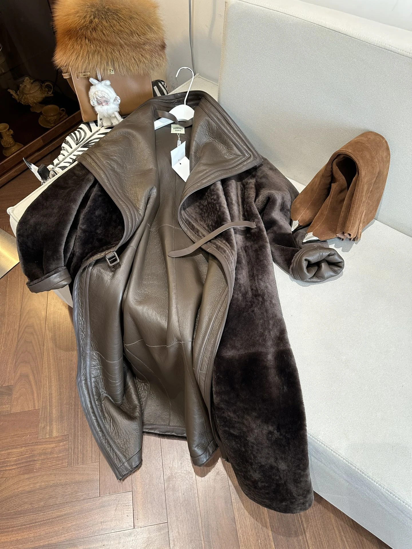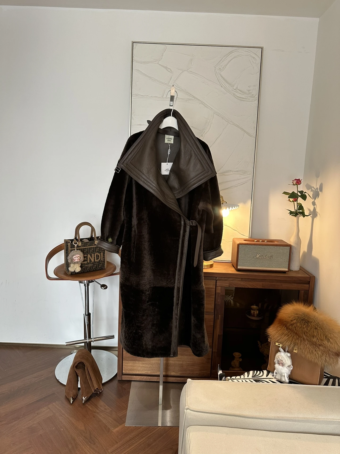 Современная и в то же время вечная шуба из натуральной овчины от HERMÈS — идеальное сочетание роскошного комфорта и строгой элегантности. Глубокий тёмно‑шоколадный оттенок, бархатистый ворс и контрастная кожаная отделка воротника и планок создают выразительный, премиальный образ.