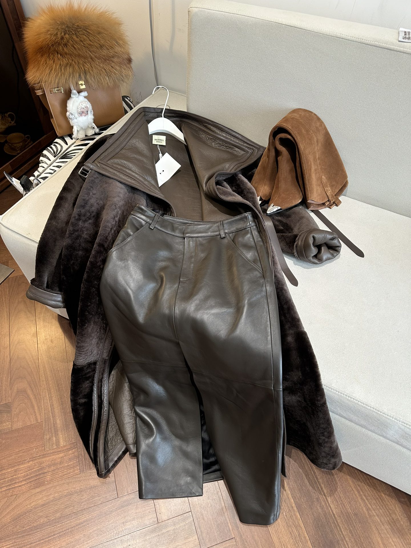• Застёжка: скрытая планка и кожаный пояс‑ремень для фиксации талии; возможна также внутренняя пуговица/крючок (в зависимости от модели).