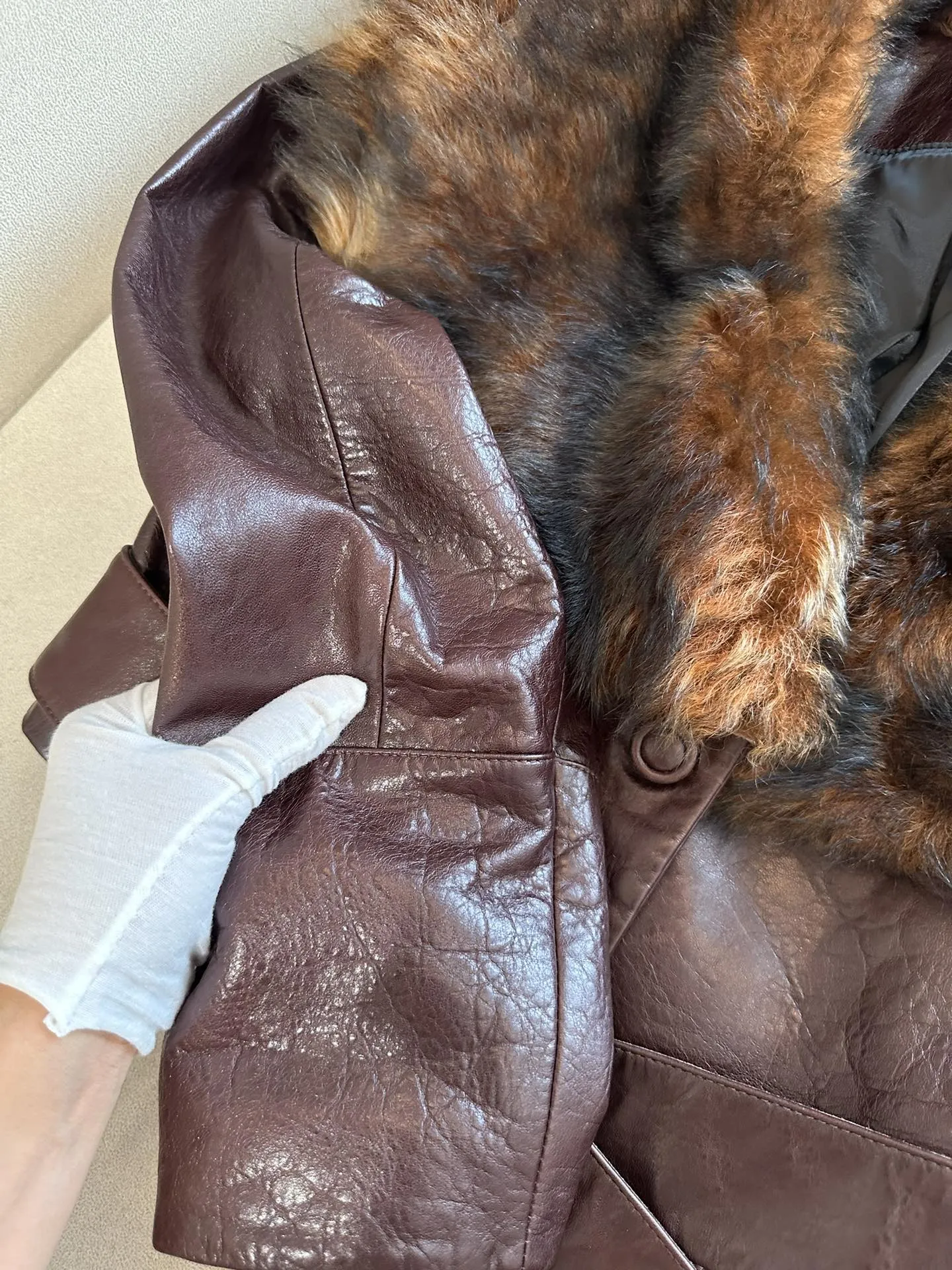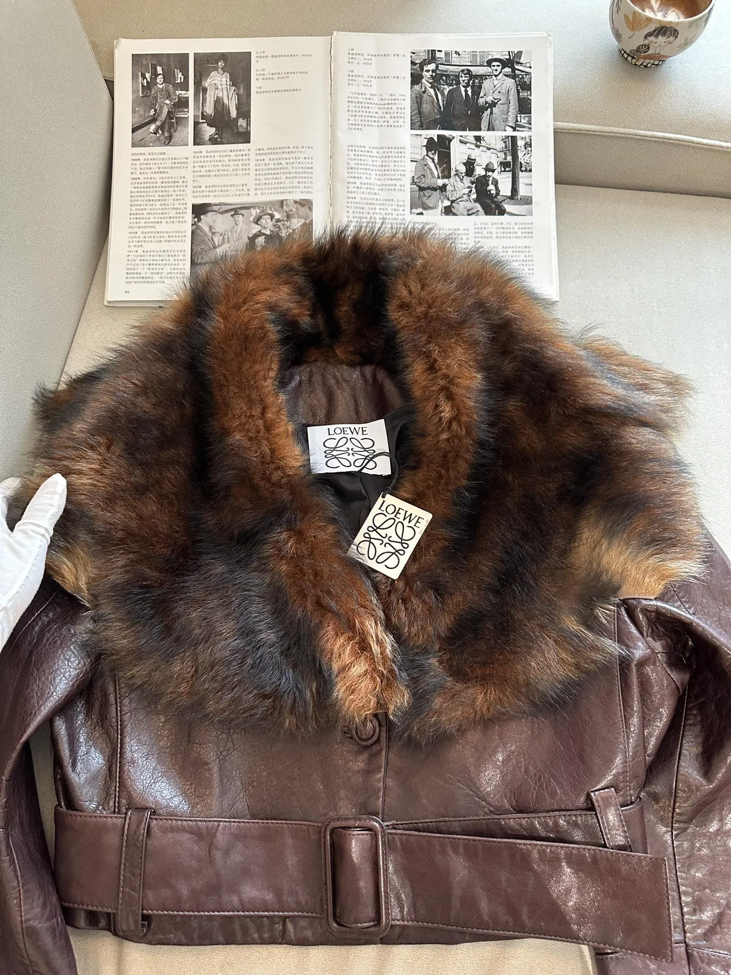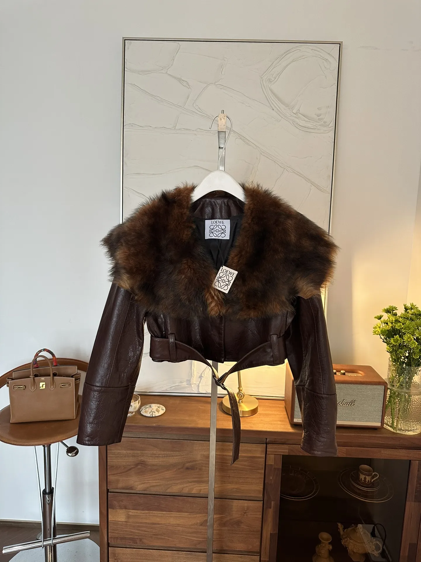 Особое внимание привлекает роскошный воротник из натурального меха лисы, который добавляет образу элегантности и тепла. Укороченный крой, пояс с пряжкой на талии и продуманная посадка подчёркивают женственность силуэта.