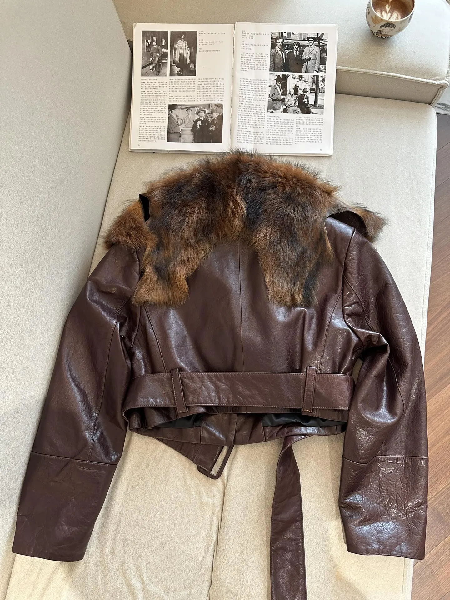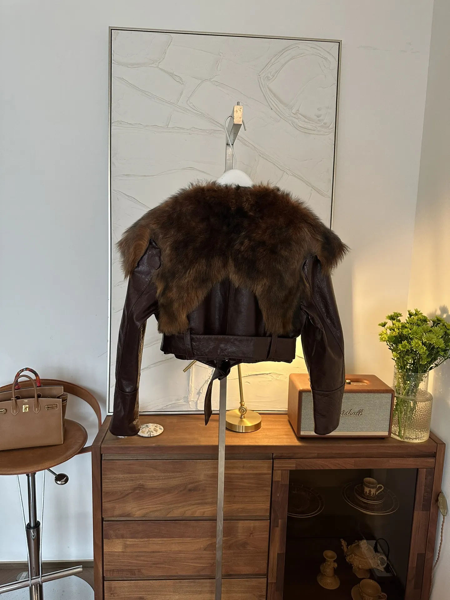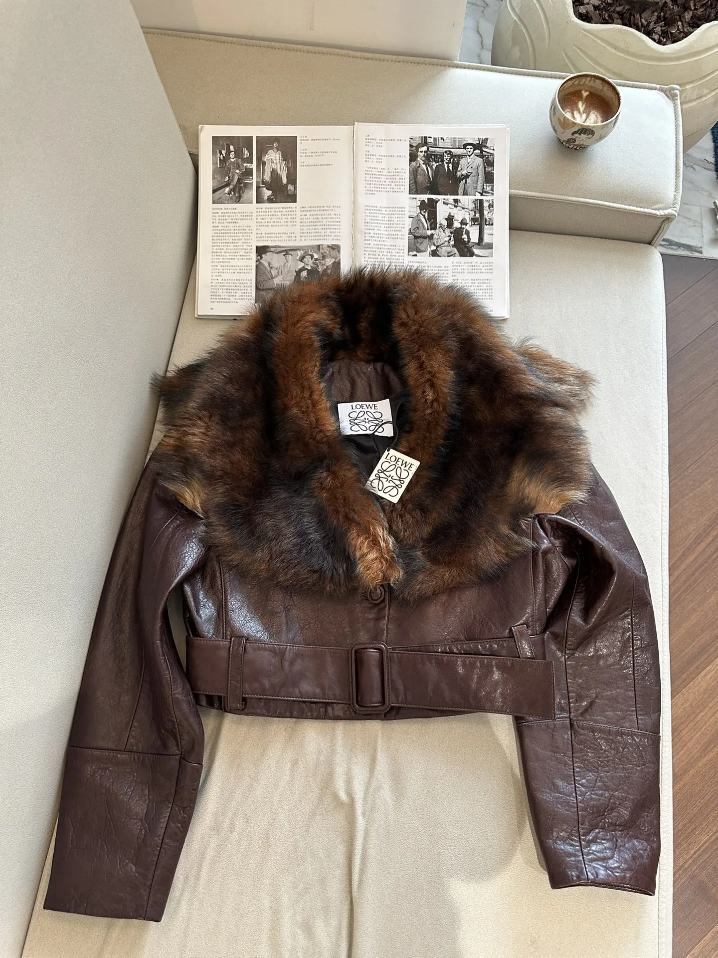 Особое внимание привлекает роскошный воротник из натурального меха лисы, который добавляет образу элегантности и тепла. Укороченный крой, пояс с пряжкой на талии и продуманная посадка подчёркивают женственность силуэта.