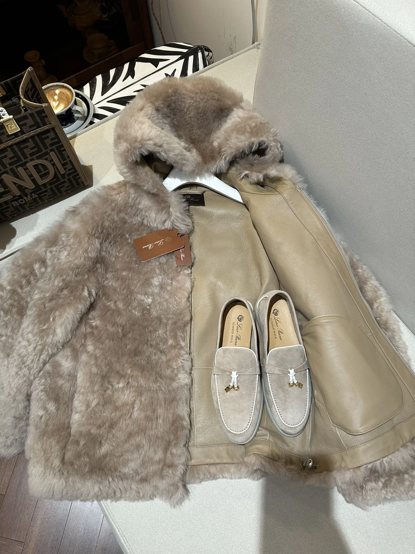 Элегантная женская шуба Loro Piana из натуральной овчины в тёплой бежево-песочной гамме. Модель сочетает объёмный, мягкий мех с гладкой кожаной отделкой внутри и функциональным капюшоном — идеальный выбор для холодного сезона, когда важны и комфорт, и безукоризненный стиль.