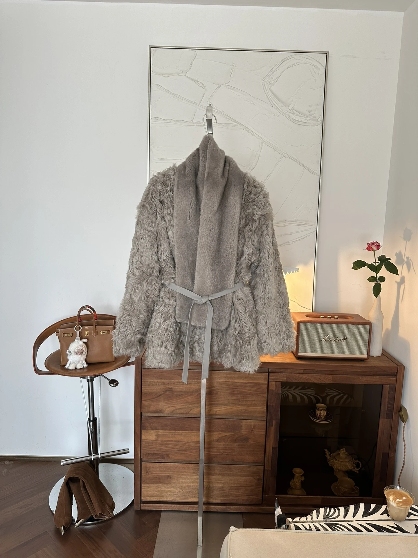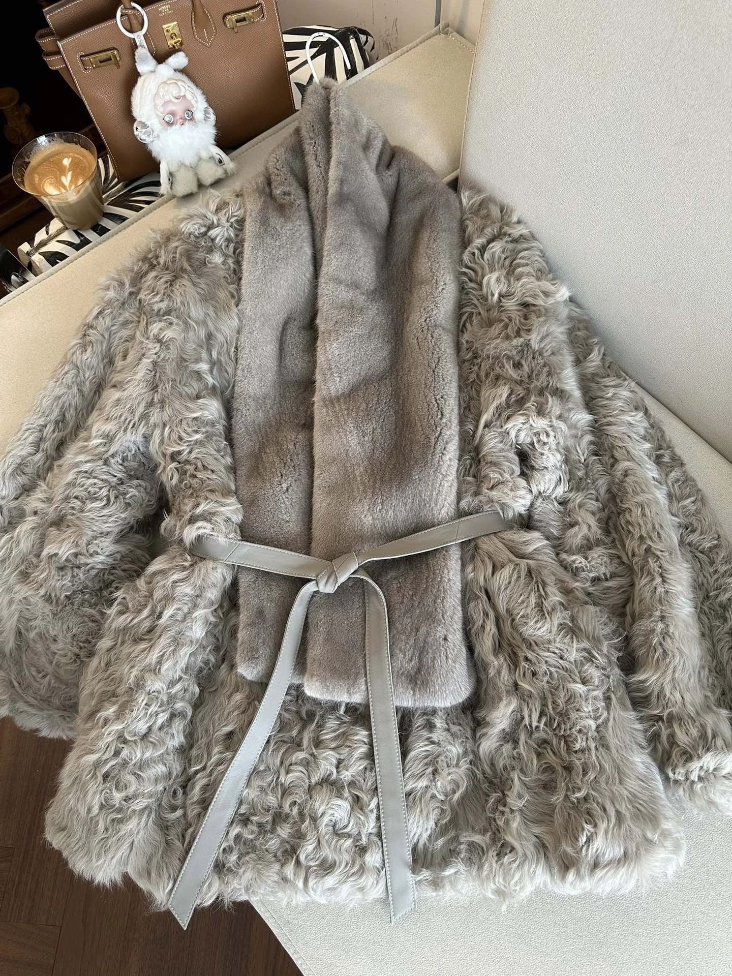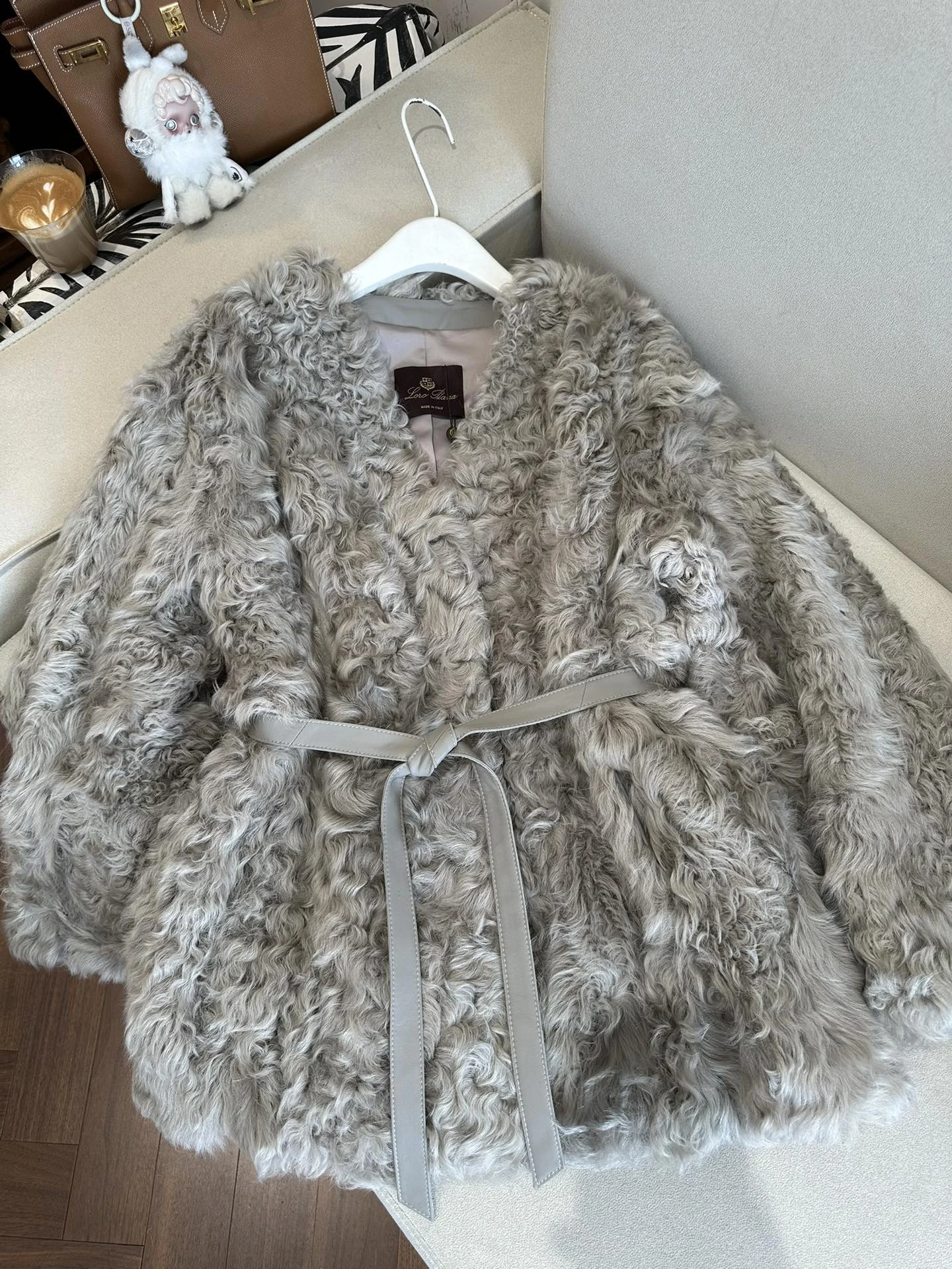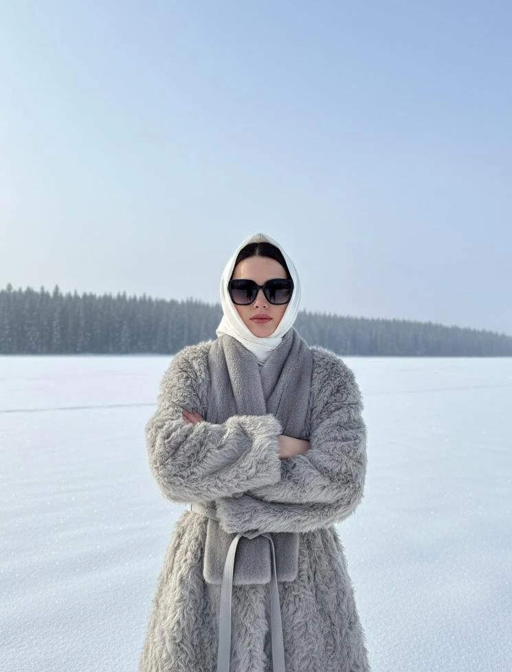 Шуба выполнена из высококачественной овчины с выраженным кудрявым ворсом — фактура придаёт изделию динамику и игру света, сохраняя при этом мягкость и упругость. Модель имеет лаконичную линию без громоздкого воротника, что делает образ современным и женственным. Пояс из гладкой кожи позволяет регулировать силуэт: носите расстёгнутой для свободного объёма или завязанной для молодого, подчеркнутого силуэта.