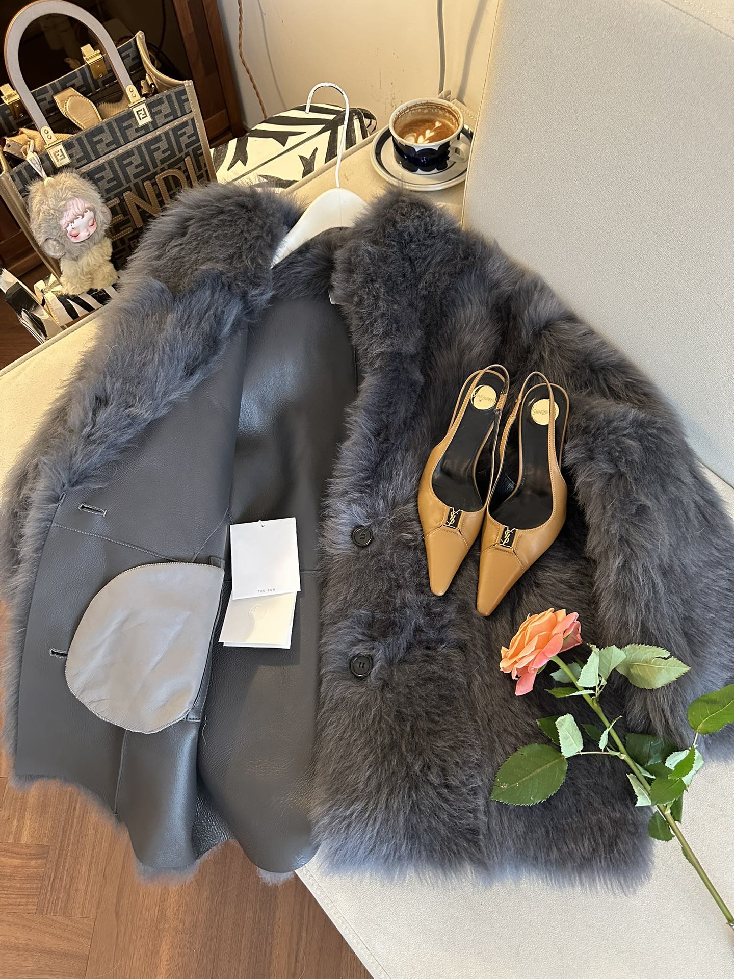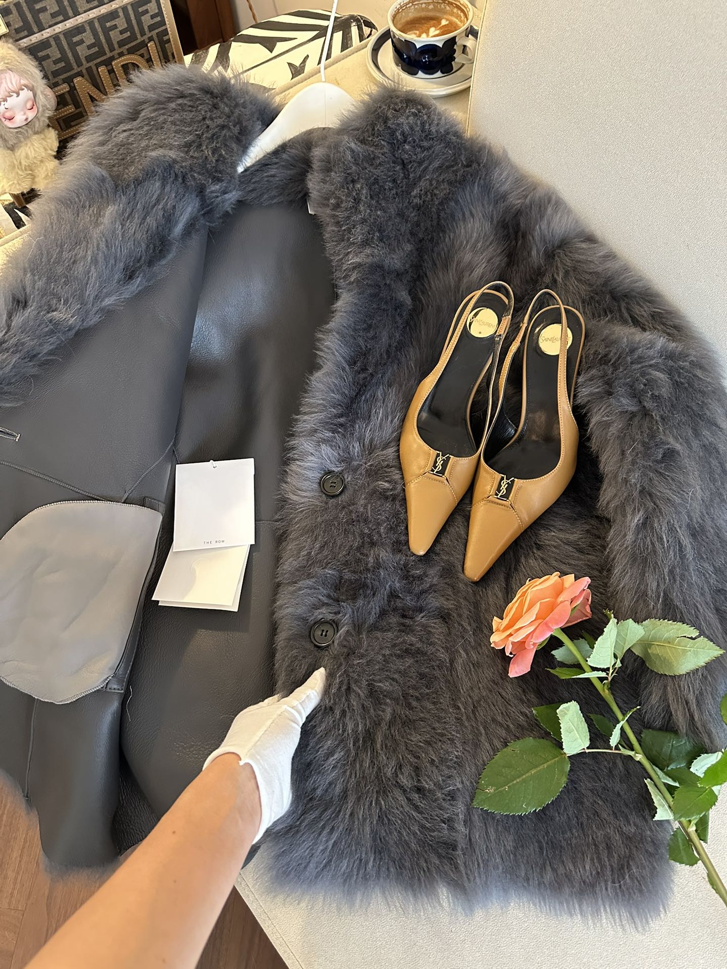 Минималистичная шуба THE ROW из мягкой натуральной овчины. Актуальный, слегка укороченный силуэт с округлым вырезом и незаметной застёжкой — элегантная вещь для городского образа в прохладное время года.