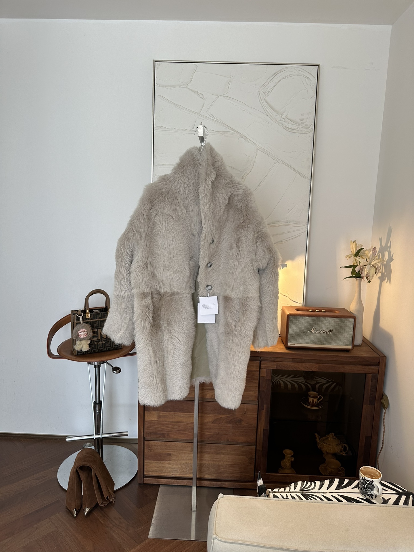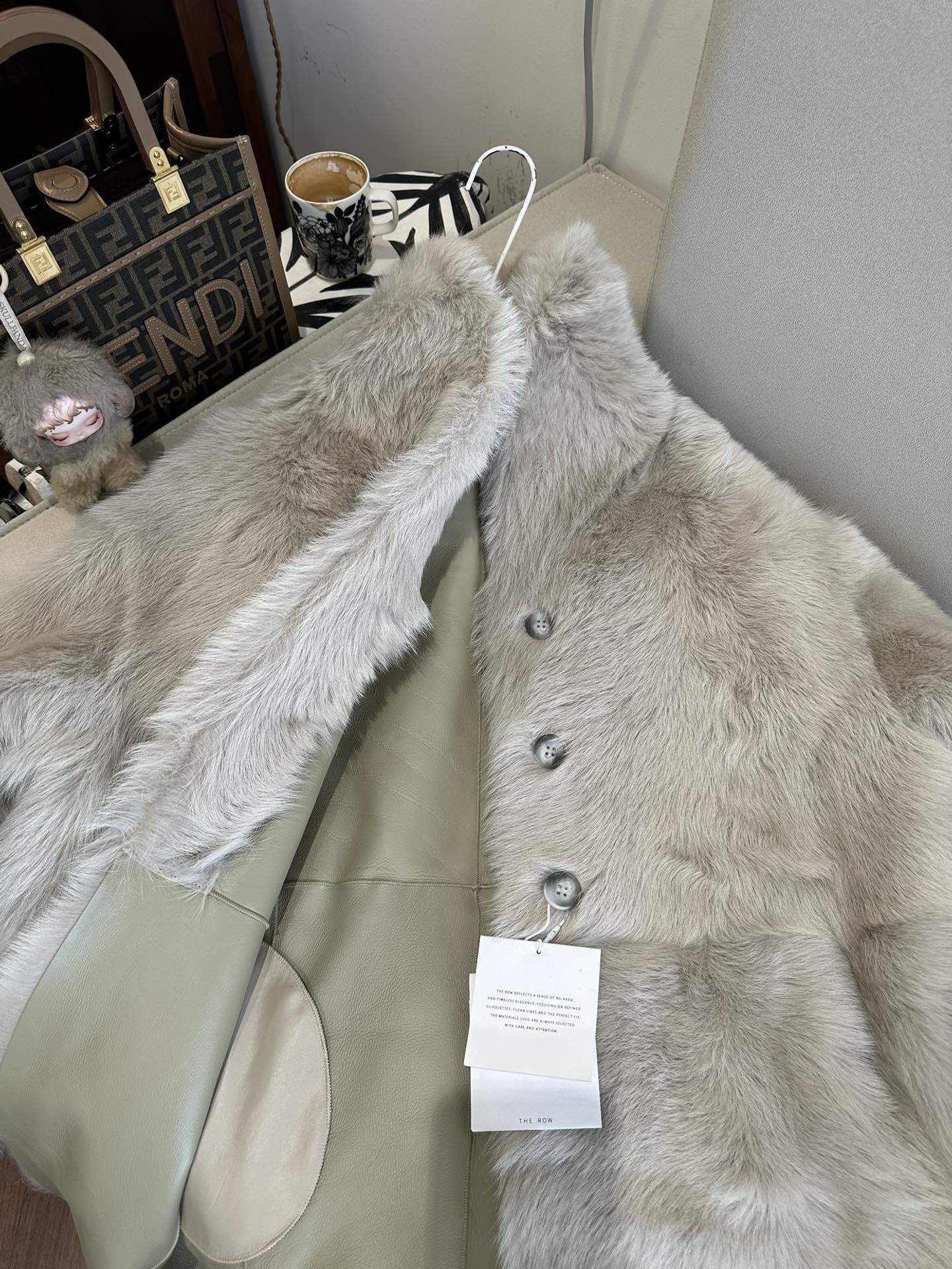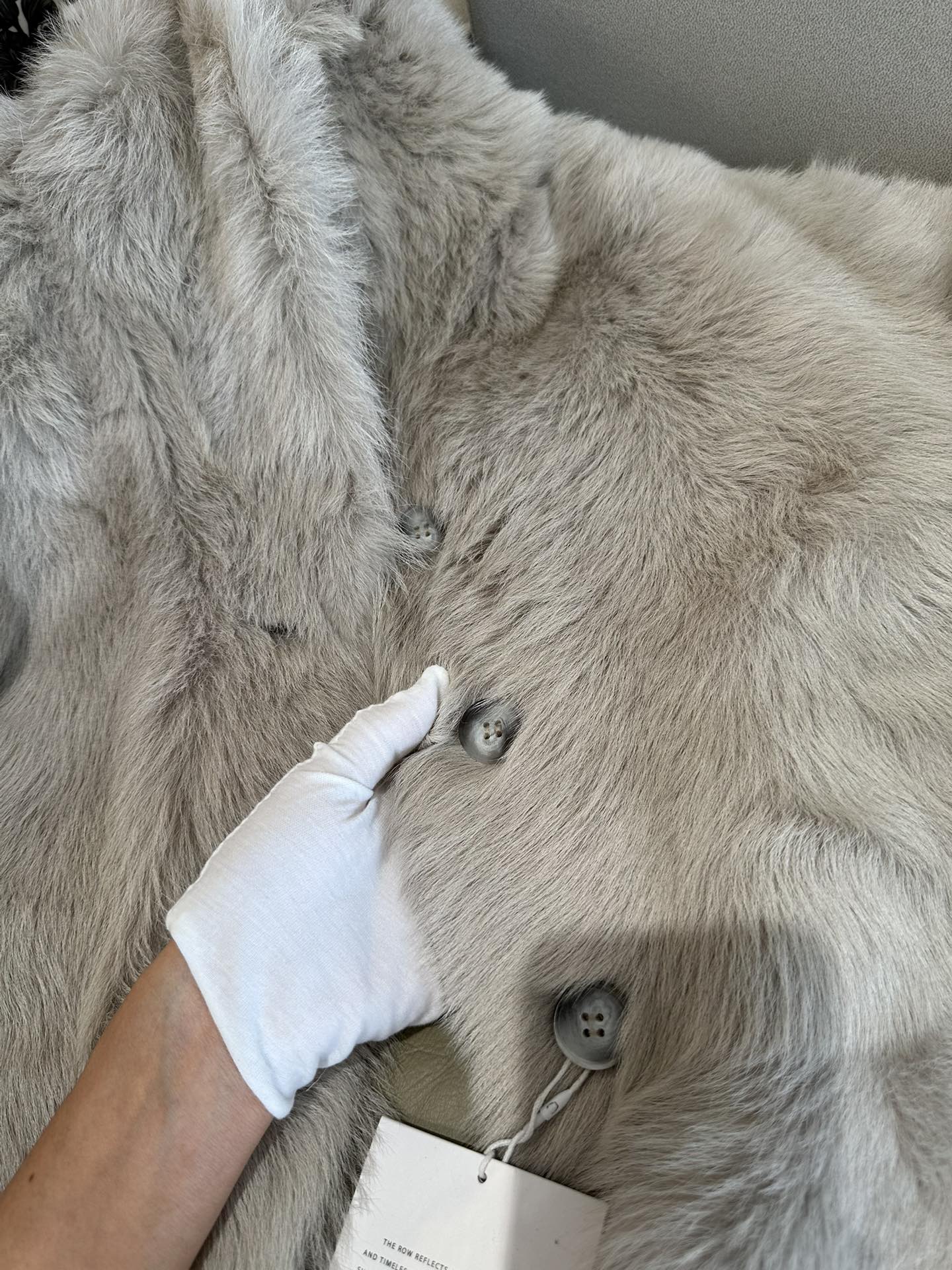 Изысканная шуба из натуральной овчины в сдержанном пыльно‑сером оттенке. Минималистичная, в духе THE ROW, вещь сосредоточена на безупречной фактуре и чистых линиях: объемный, немного оверсайз‑силуэт, мягкий воротник и аккуратная застежка создают элегантный, вневременной образ.