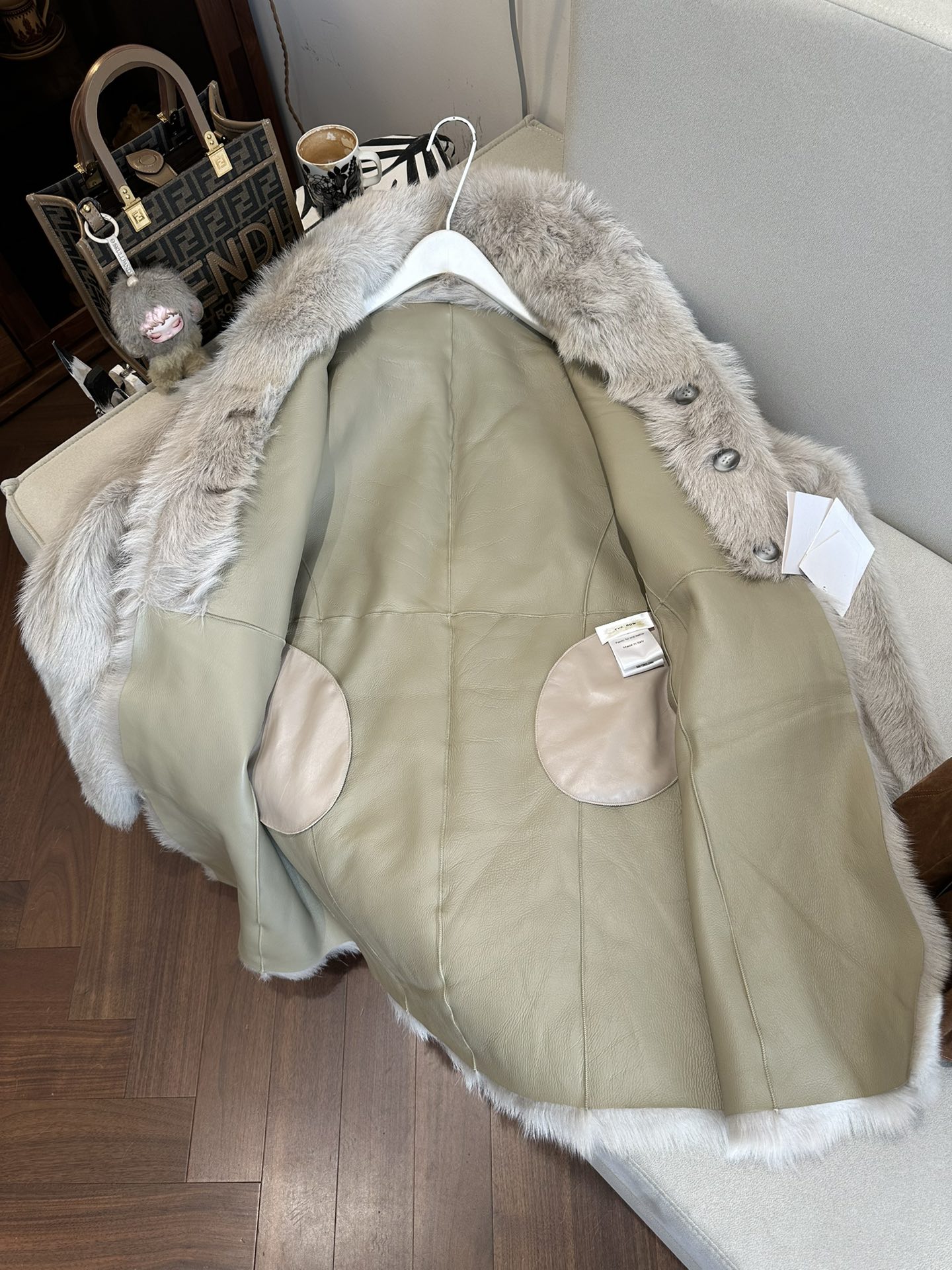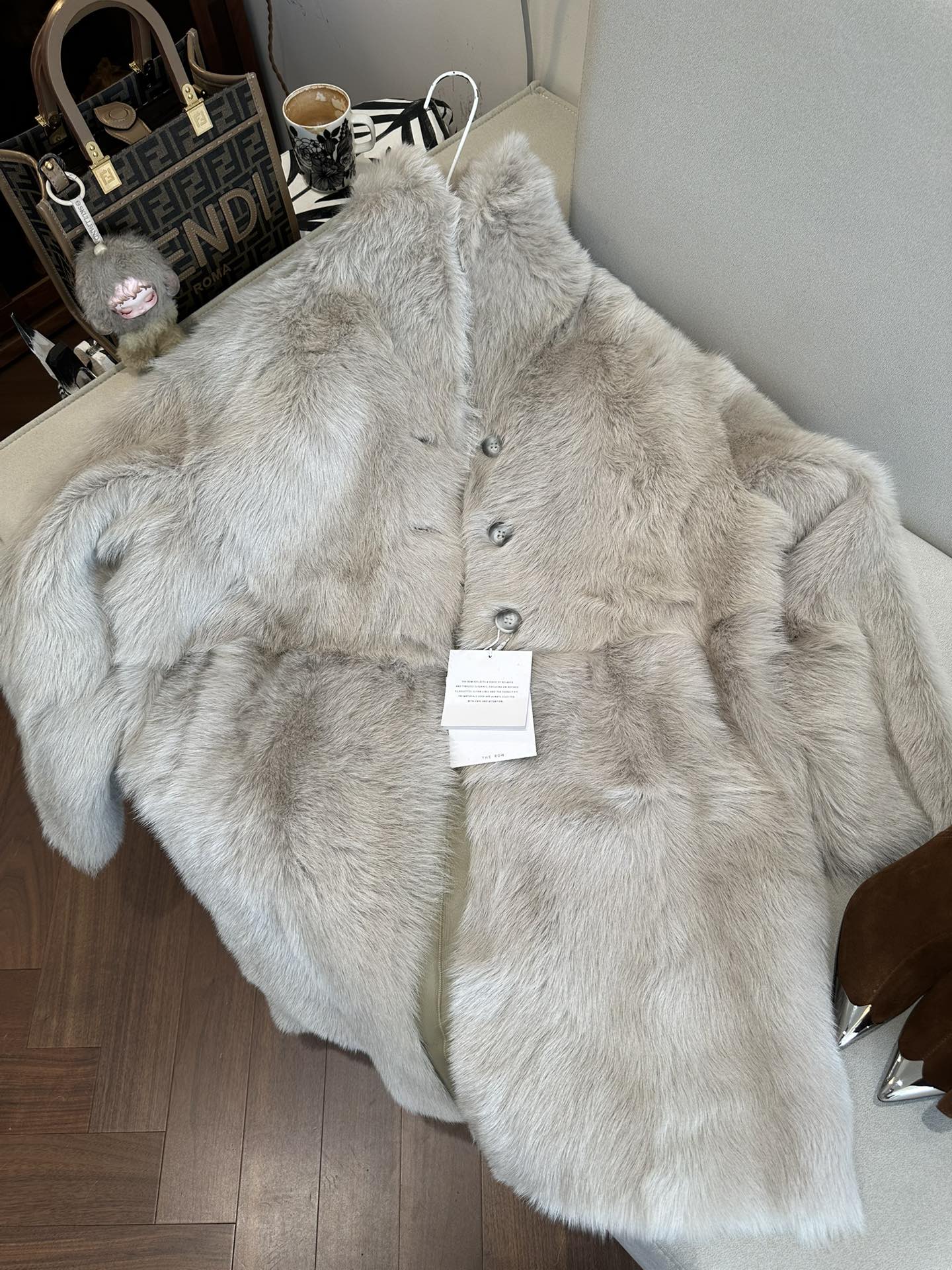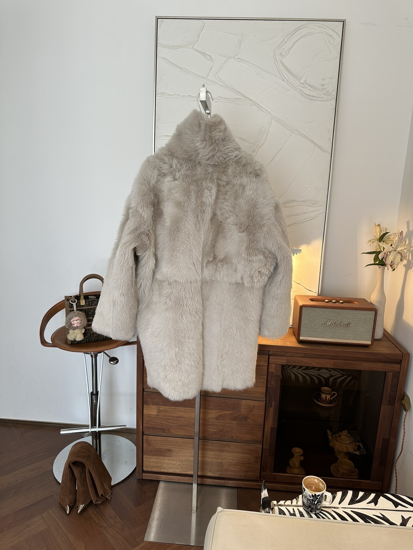 Изысканная шуба из натуральной овчины в сдержанном пыльно‑сером оттенке. Минималистичная, в духе THE ROW, вещь сосредоточена на безупречной фактуре и чистых линиях: объемный, немного оверсайз‑силуэт, мягкий воротник и аккуратная застежка создают элегантный, вневременной образ.