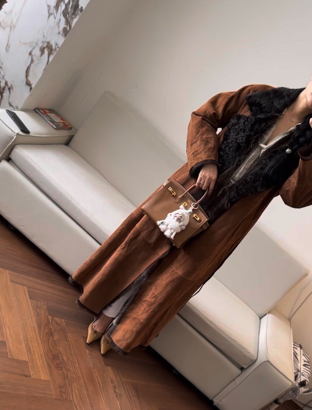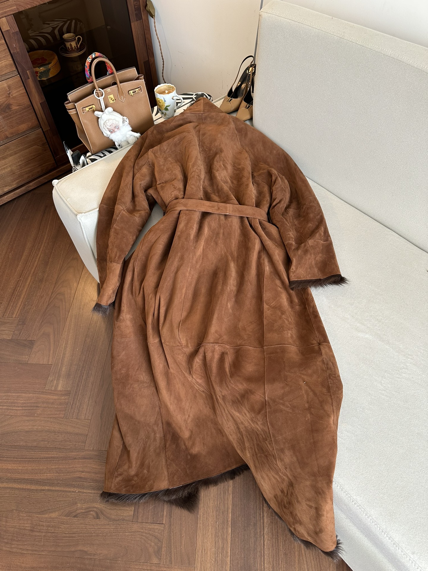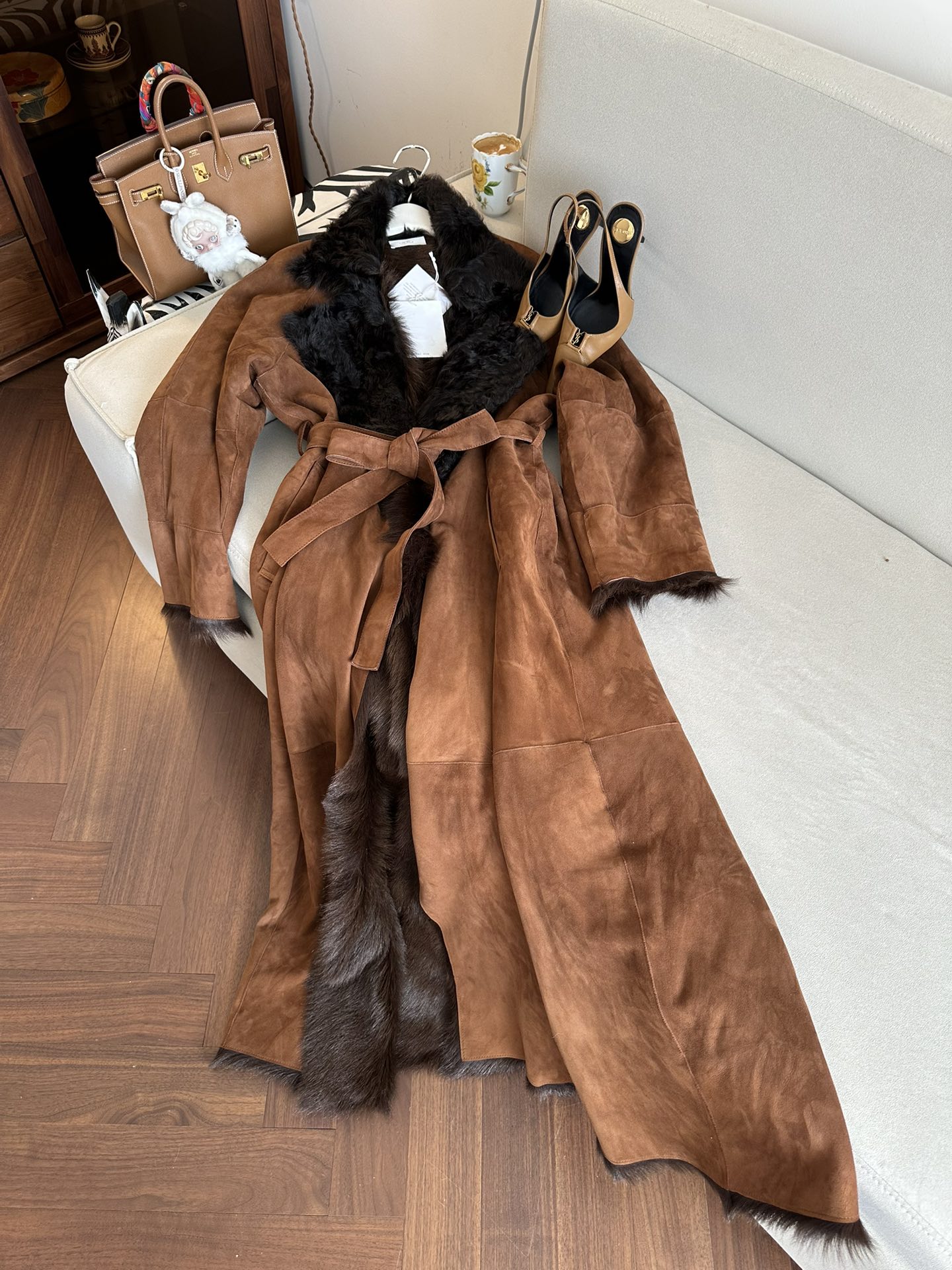 Особое внимание в дизайне уделено роскошной отделке: воротник, внутренняя часть, а также манжеты и подол декорированы натуральным мехом лисы глубокого шоколадного цвета. Мягкий мех не только придаёт изделию изысканность, но и обеспечивает дополнительный комфорт в прохладное время года.