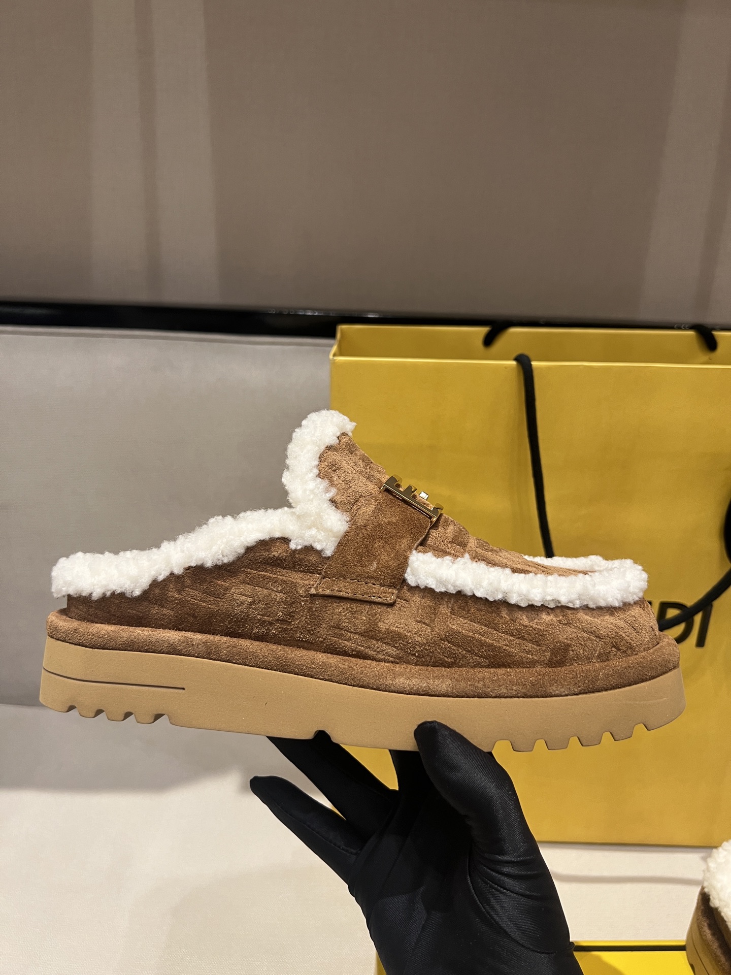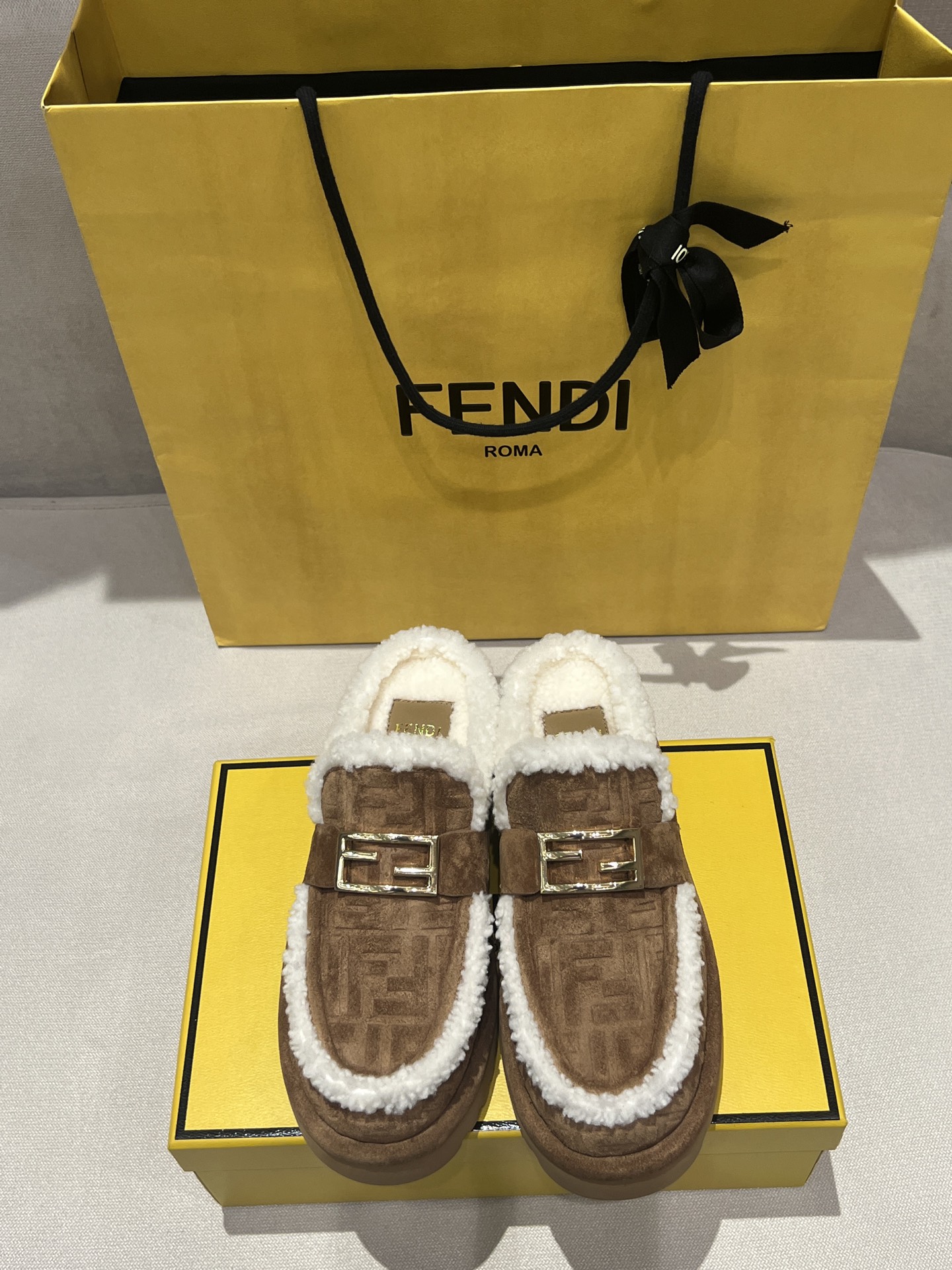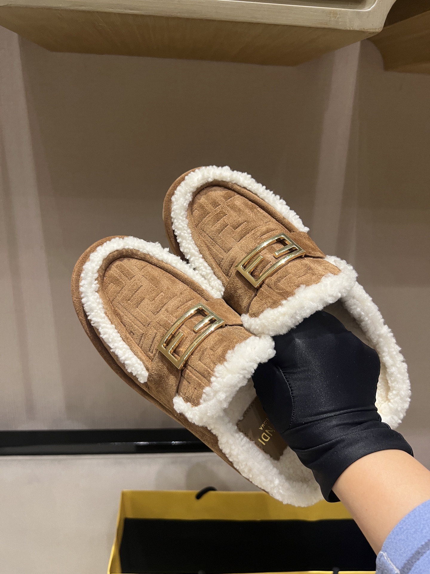 Элегантные тёплые лоферы‑мюли Fendi в спокойном цвете — сочетание мягкой шерстяной (меховой) подкладки и бархатистой замши с фирменным тиснением FF. Модель оформлена золотистой декоративной пряжкой на верхней части, имеет плотную рельефную подошву для удобства и стабильности. Идеальны как для домашнего комфорта, так и для уютных городских образов в холодное время года.