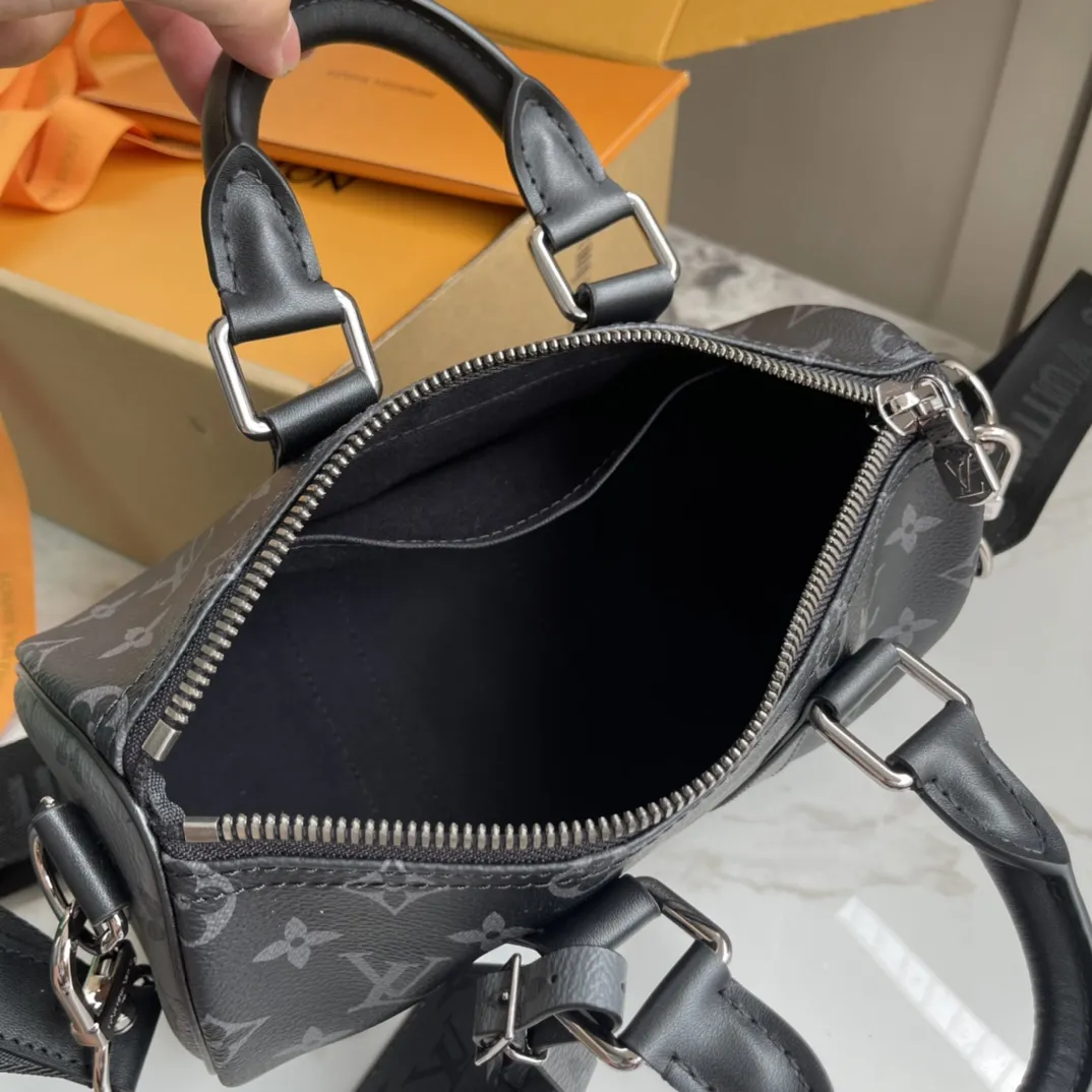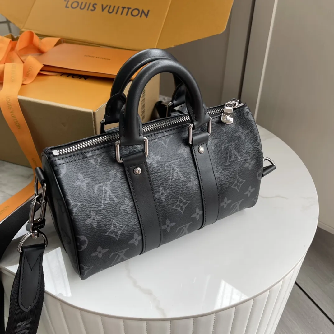 Элегантная и компактная мужская сумка Louis Vuitton Keepall Bandouliere 25 — идеальный выбор для современных мужчин, ценящих стиль, качество и удобство. Изготовленная из фирменной монограммной кожи Monogram Eclipse, сумка отличается сдержанным дизайном в черно-серых тонах с культовым логотипом LV.