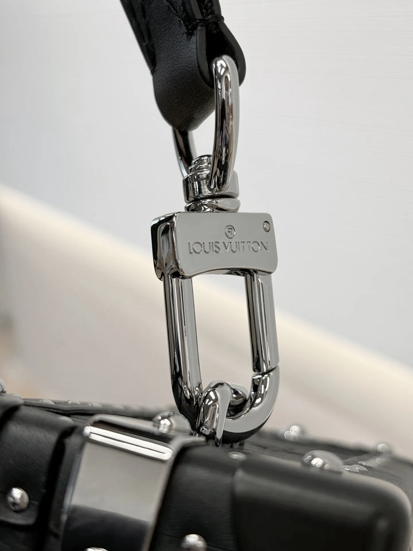 Жёсткая конструкция обеспечивает надежную защиту содержимого, а съёмный регулируемый текстильный ремень позволяет удобно носить клатч на плече или через плечо, что добавляет практичности в его использование. Чёрная кожаная отделка придаёт клатчу стильный и универсальный вид, а серебристые заклёпки и S-образный замок добавляют современный акцент.