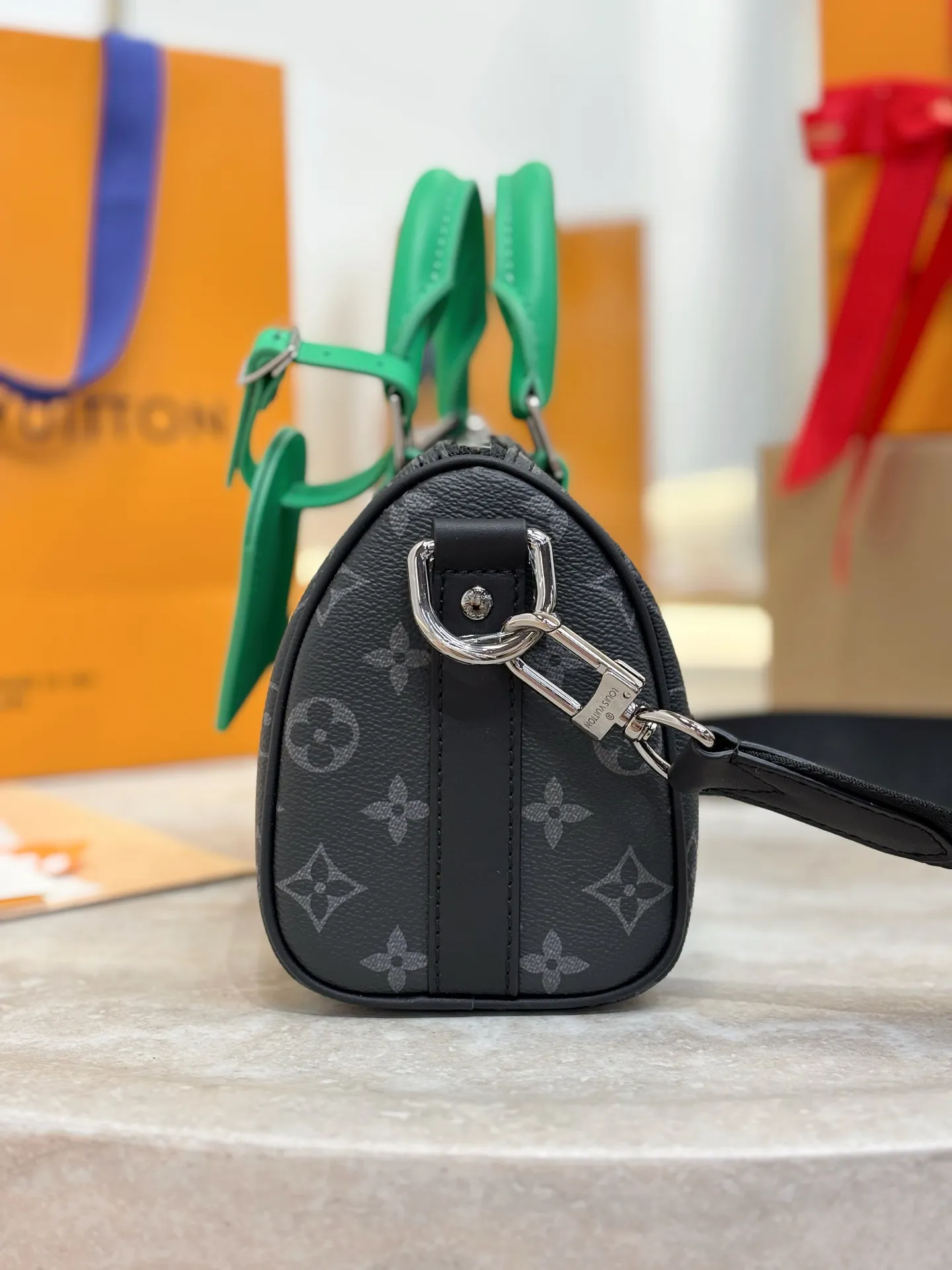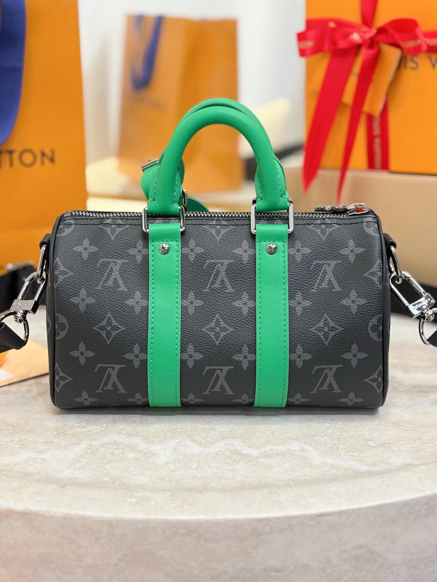 Сумка Keepall Bandoulière 25 от Louis Vuitton является стильным аксессуаром. Выполненная из канвы Monogram Eclipse, она сочетает в себе современный дизайн и классические элементы бренда. Фурнитура цвета состаренного серебра добавляет элегантности, а цветные кожаные детали на боковых полосах и ручках придают сумке уникальность.