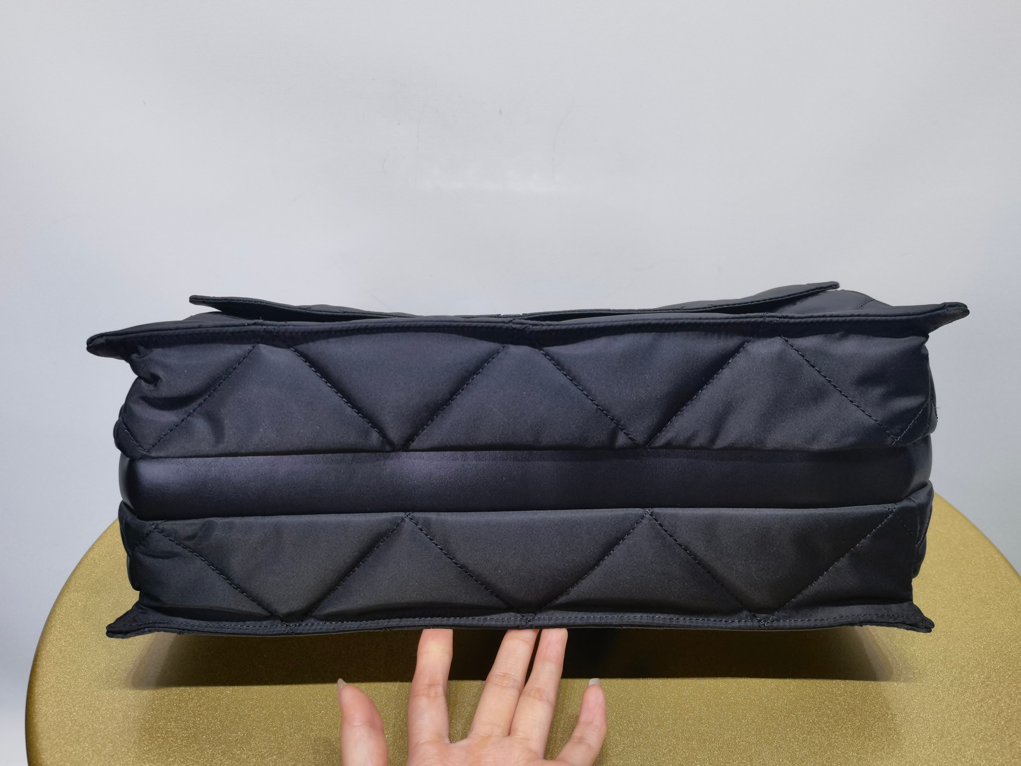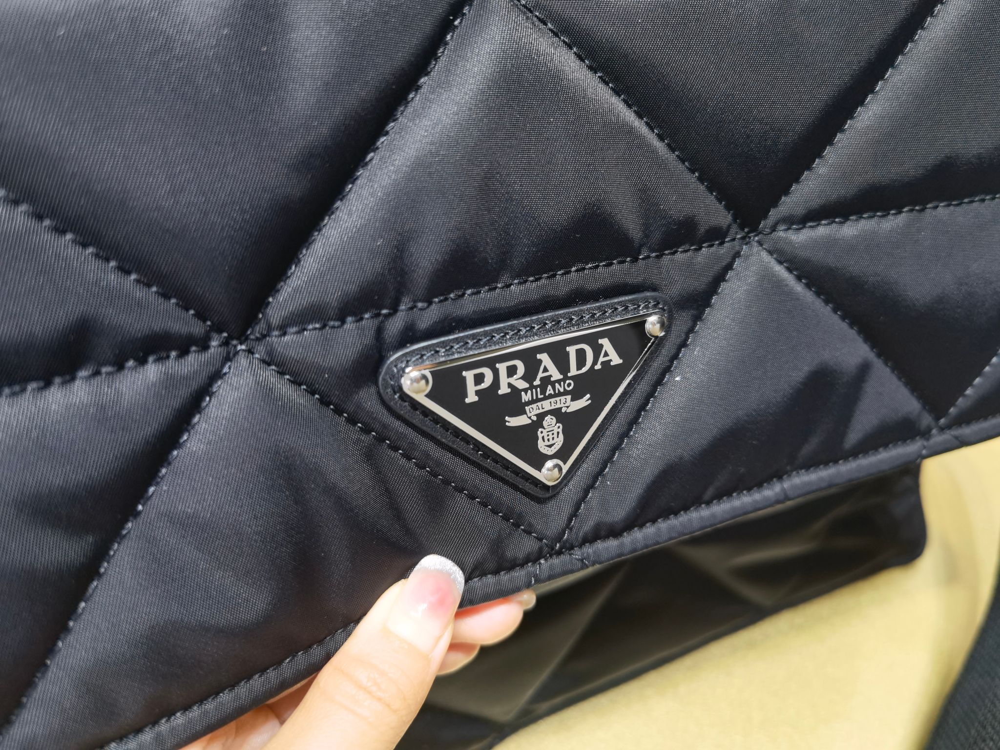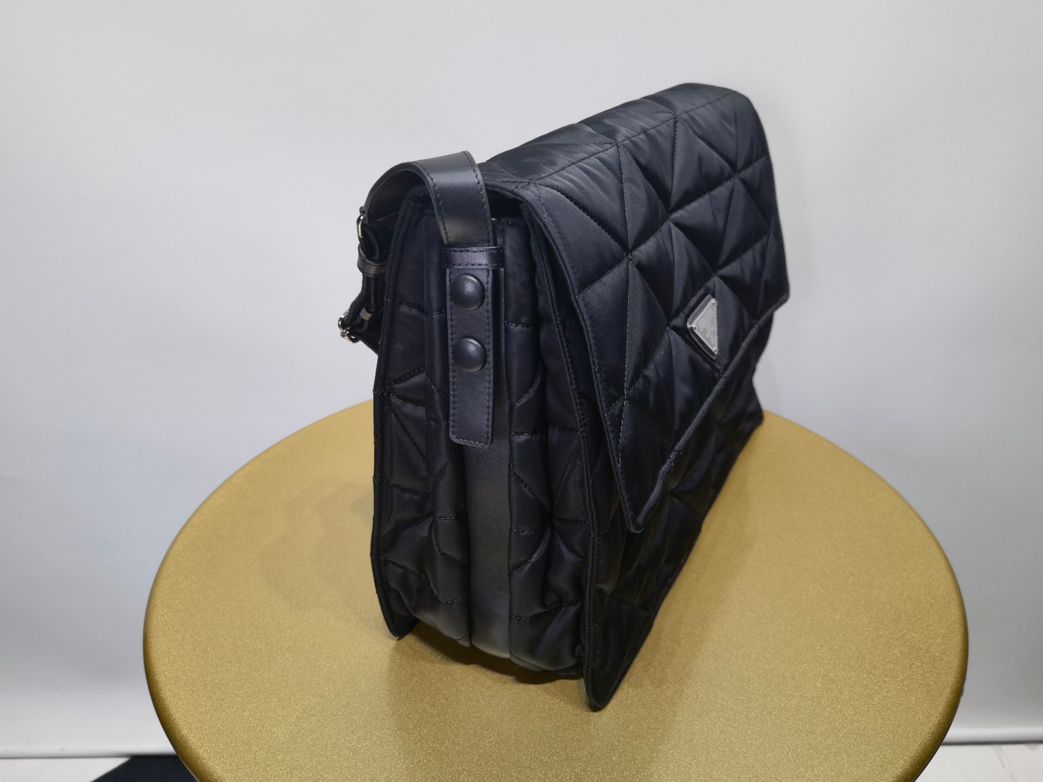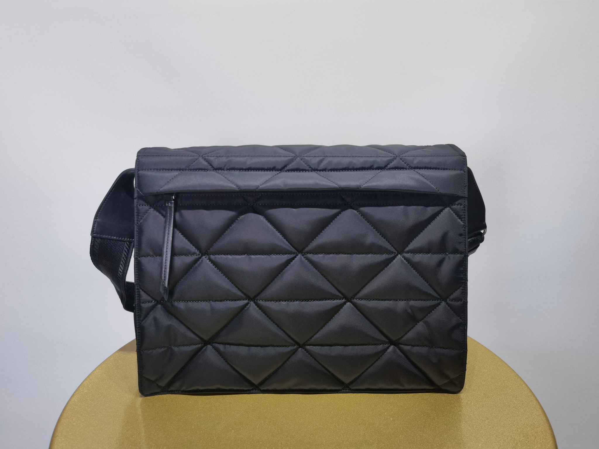Сумка Messenger Prada на нейлоновой подкладке имеет геометрический дизайн со стеганой треугольной графикой и изготовлена из переработанного нейлона Re-Nylon. Он включает в себя металлический треугольный логотип спереди, магнитную застежку, задний карман на молнии и три внутренних отделения с карманами на молнии. Сумка также имеет подкладку из переработанного нейлона и регулируемые лямки с вышитым тканевым логотипом.