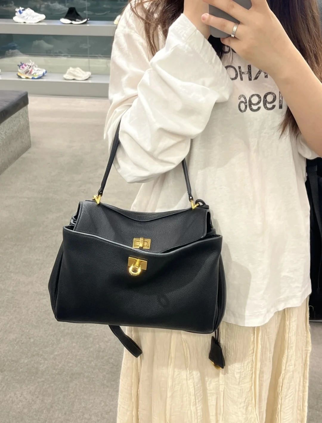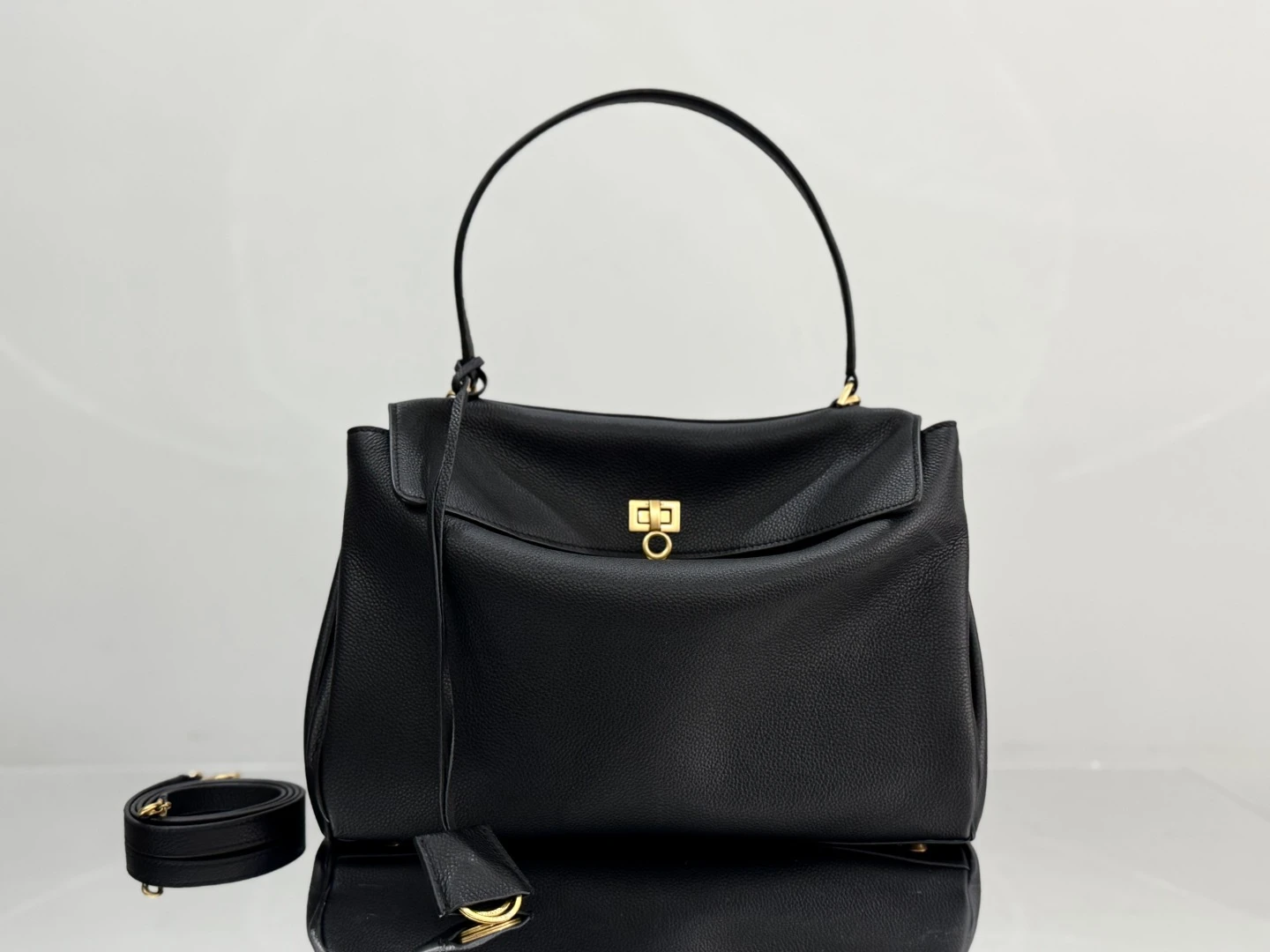 Дизайн Rodeo вдохновлён архивными мотивами эпохи родео, с отсылками к оригинальным моделям 90-х, но с обновлённым акцентом на минимализм и премиум-детали: мягкая, слегка трапециевидная форма с закруглёнными краями и плоским дном дарит стабильность и визуальную гармонию, подчёркивая фирменный силуэт BALENCIAGA с лёгким, обтекаемым рельефом. Центральный элемент — откидной клапан с фирменной золотой застёжкой в виде логотипа BB (Balenciaga), интегрированной с поворотным механизмом, предлагает надёжную фиксацию и быстрый доступ, становясь, который контрастирует с глубиной чёрной кожи.