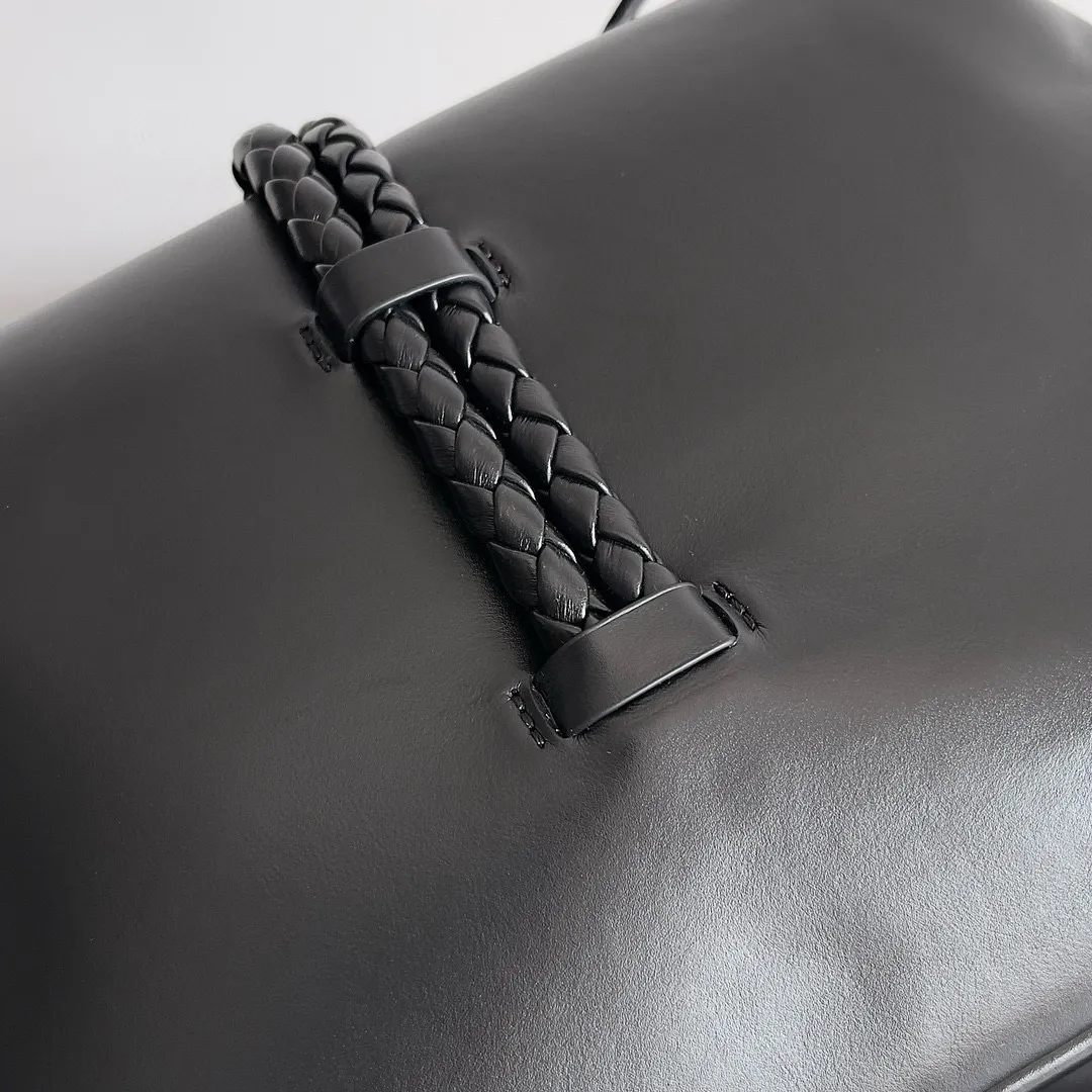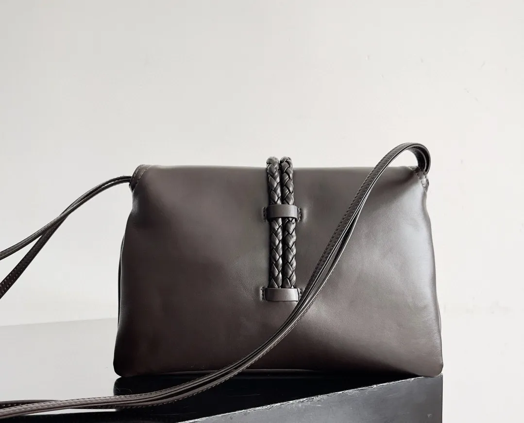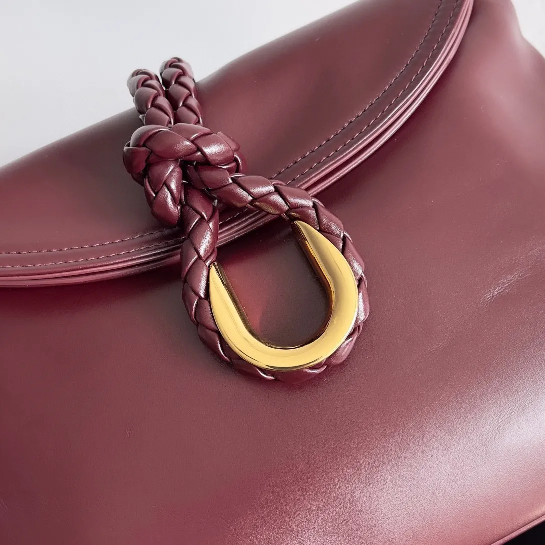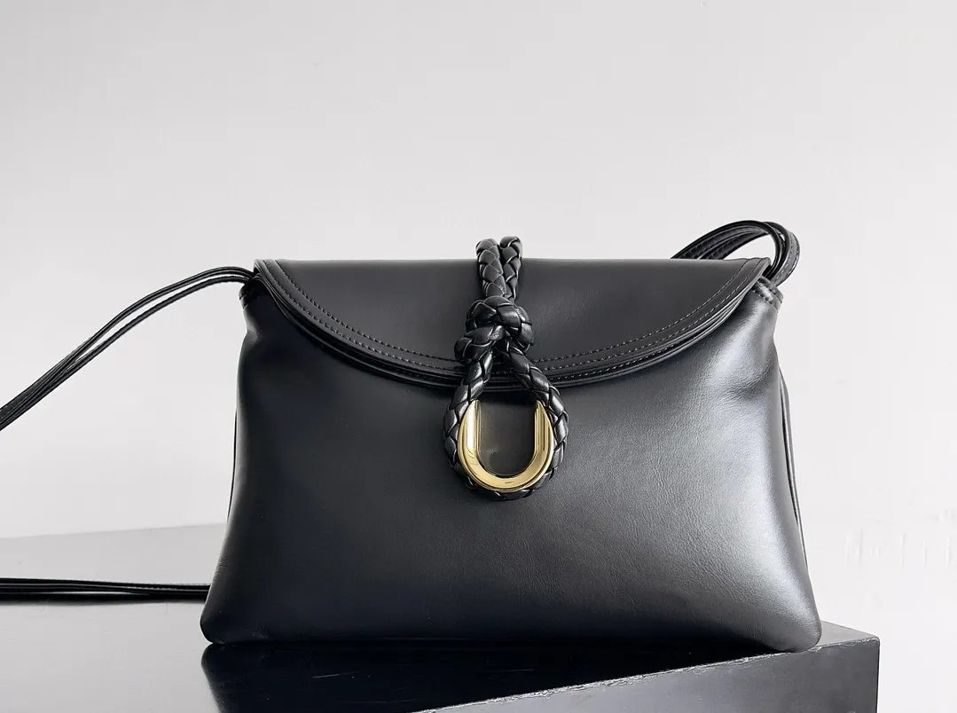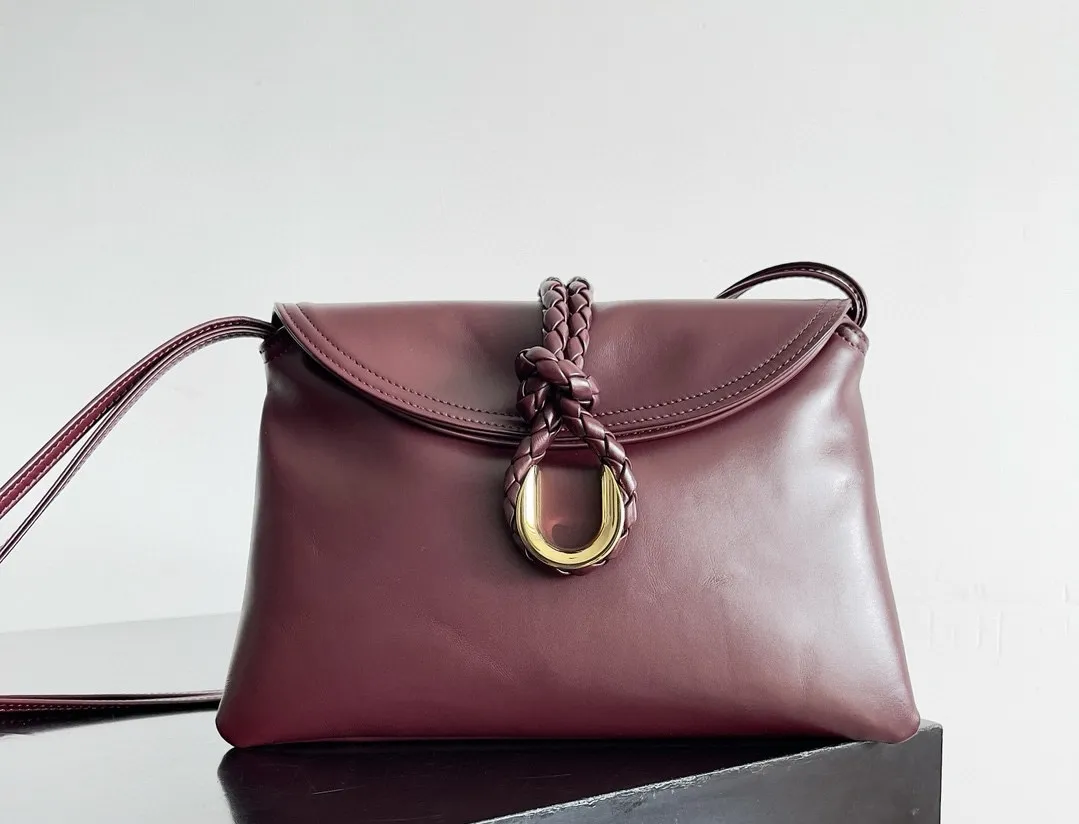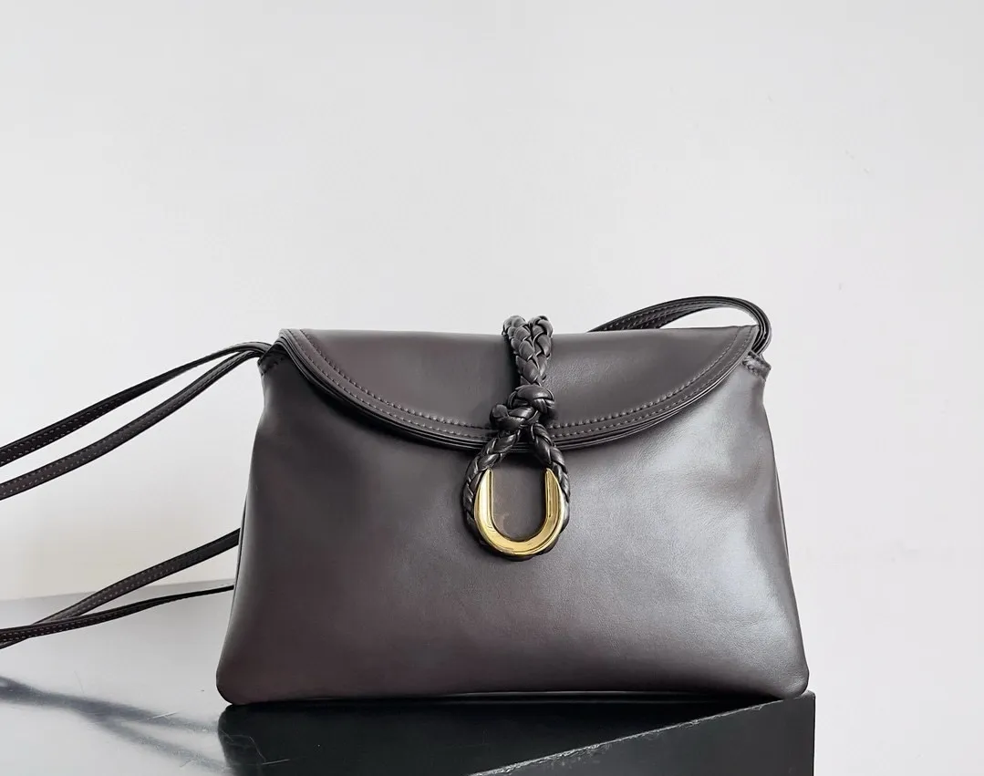 Изысканная сумка через плечо, выполненная из высококачественной гладкой телячьей кожи. Оригинальная застежка с металлической деталью и кожаным плетеным шнуром привлекает внимание.