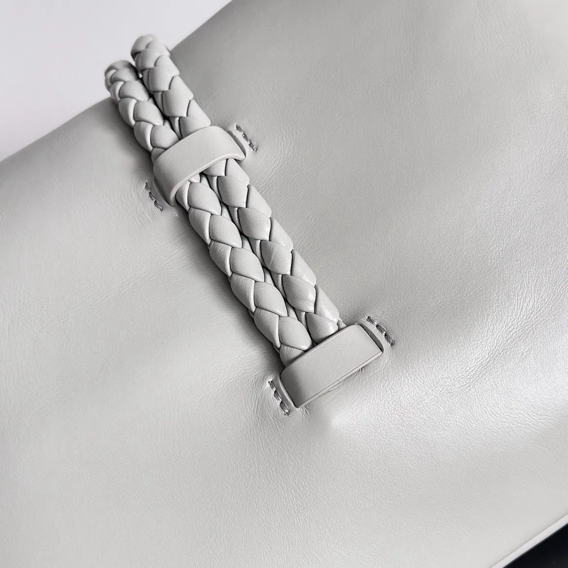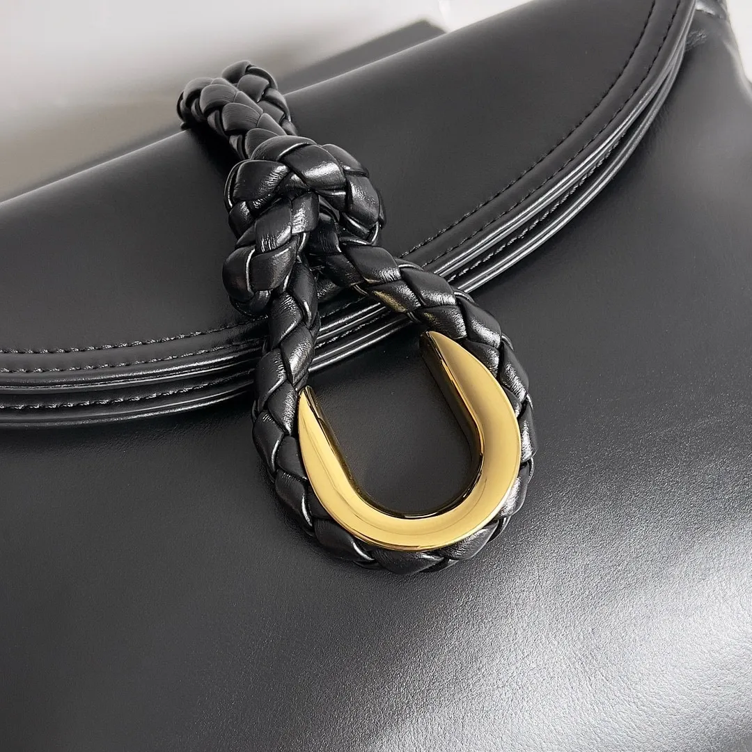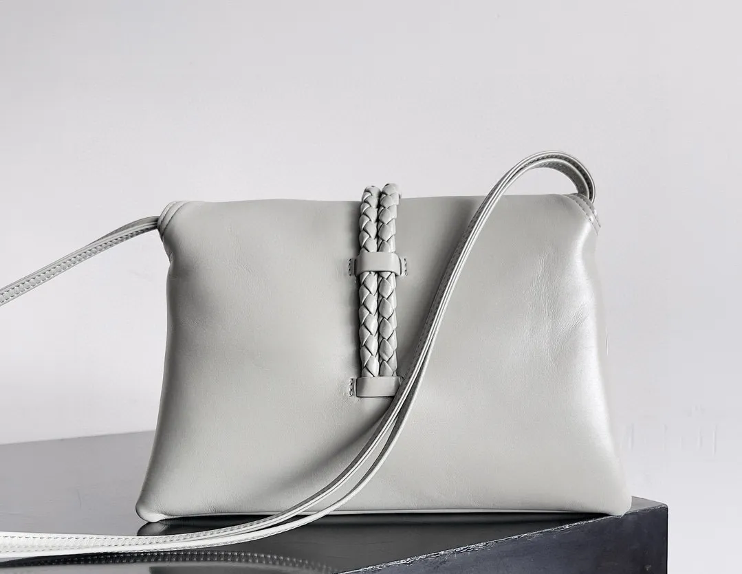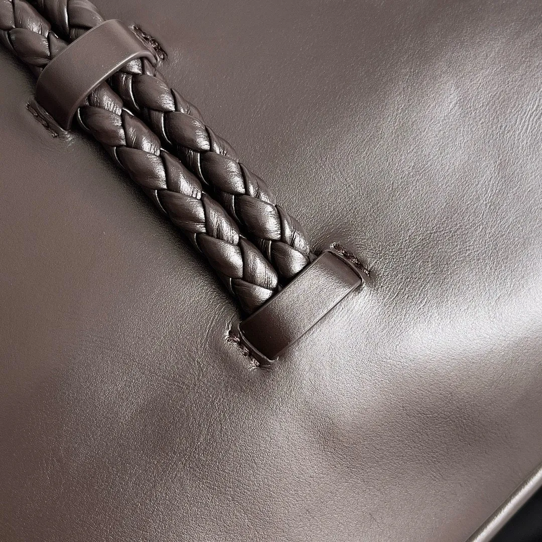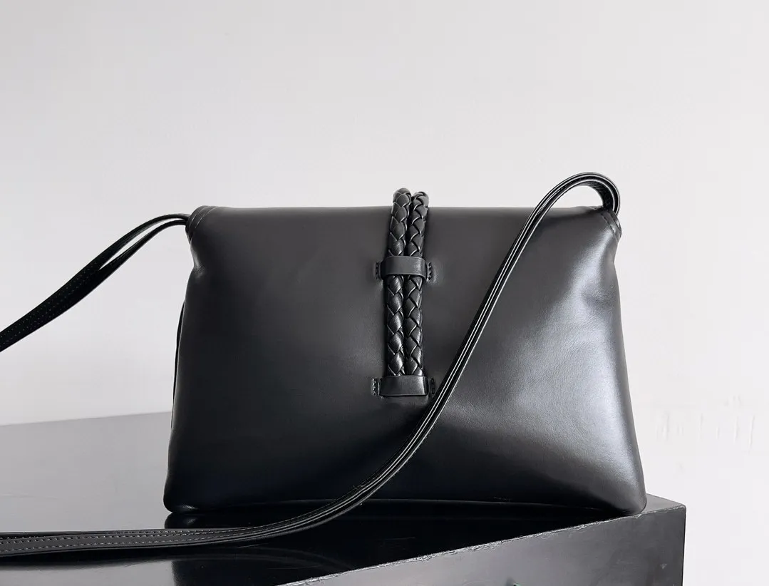 Изысканная сумка через плечо, выполненная из высококачественной гладкой телячьей кожи. Оригинальная застежка с металлической деталью и кожаным плетеным шнуром привлекает внимание.