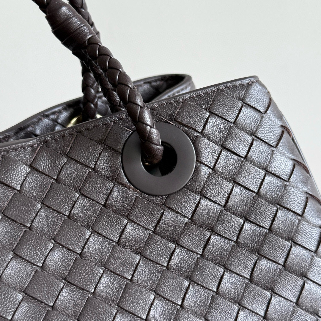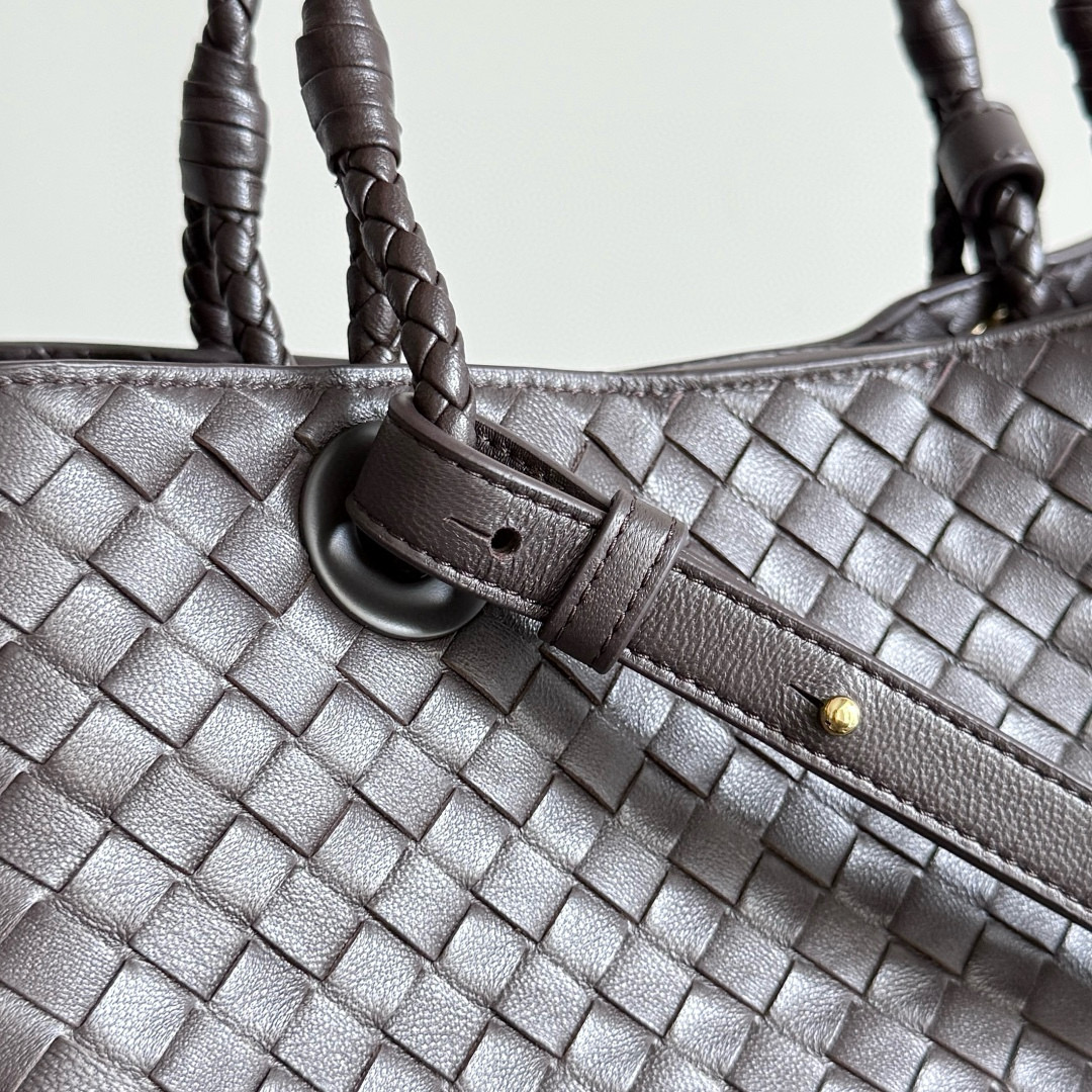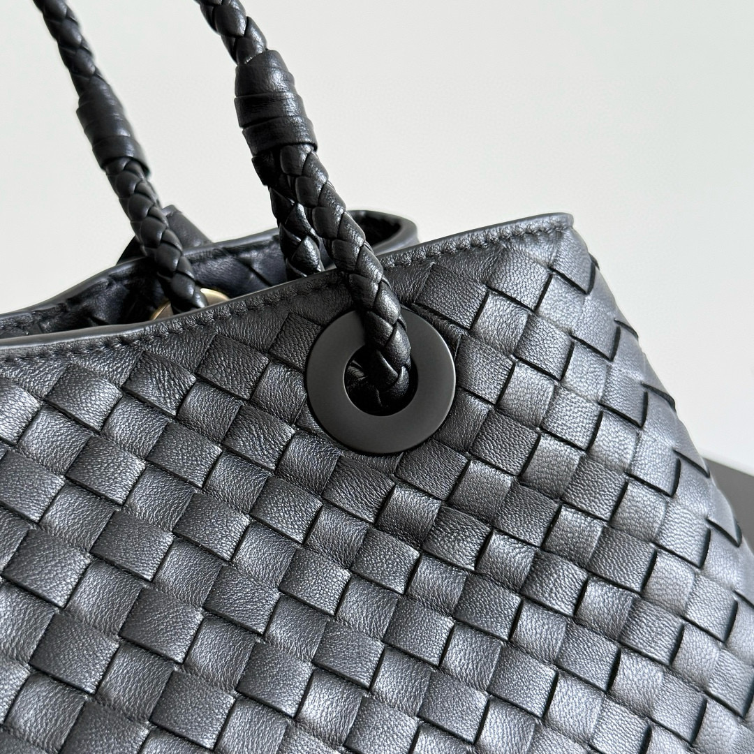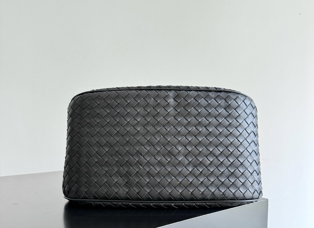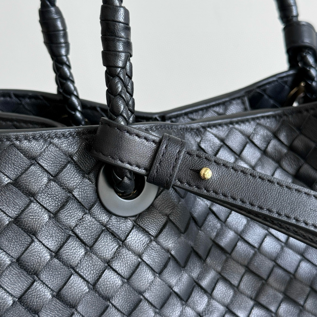 Функциональная форма в виде корзины дополнена двумя короткими плетёными ручками и длинным регулируемым ремнём для ношения на плече или через плечо. Внутри сумки — гравированная латунная пластина с указанием года выпуска сумки и предварительно присвоенным номером.