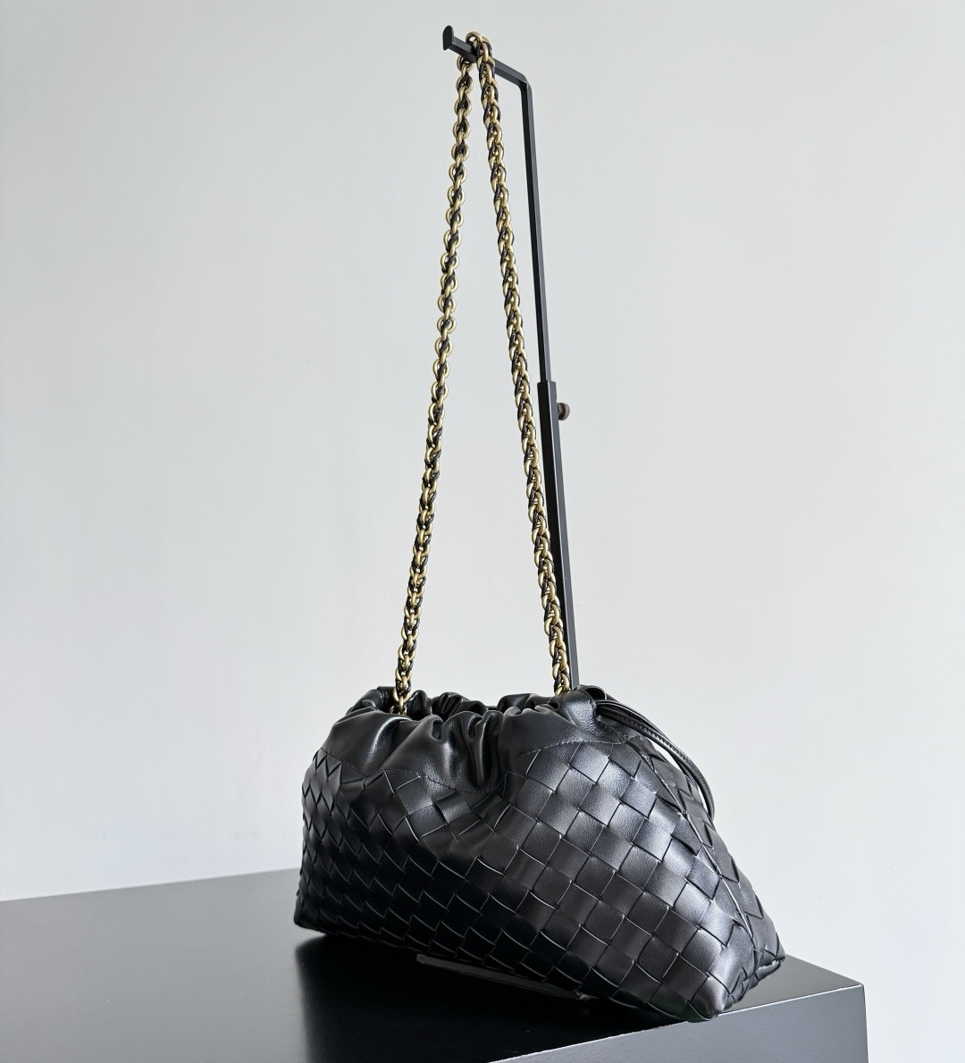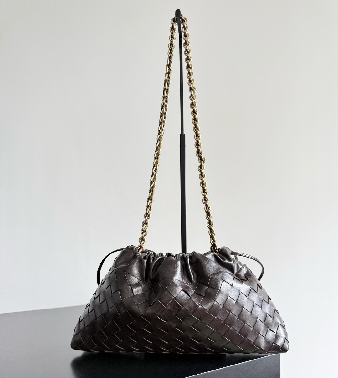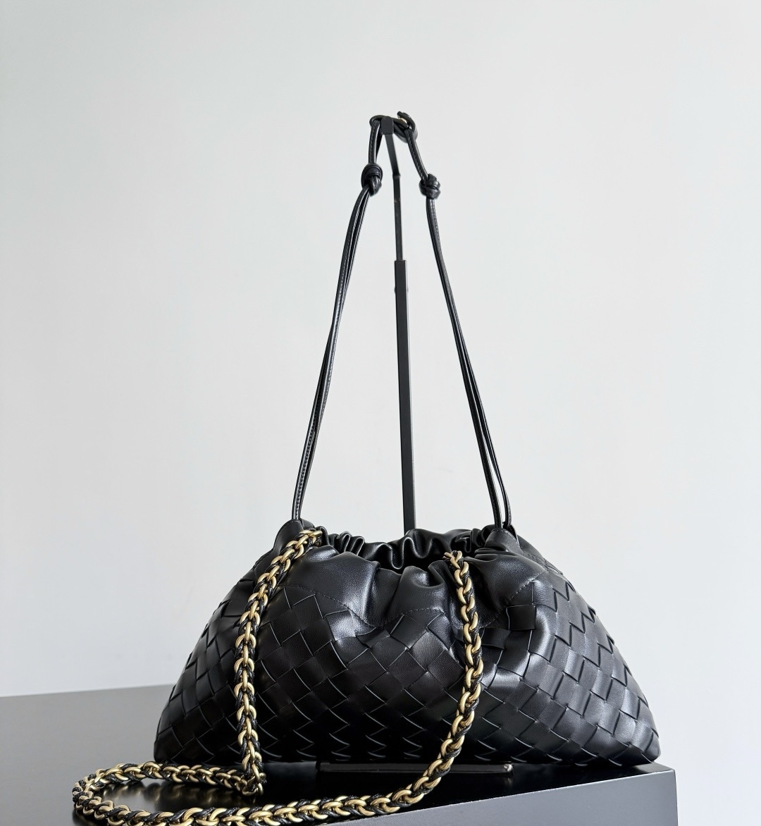 Элегантная женская сумка Dustbag от Bottega Veneta выполнена из натуральной коровьей кожи и украшена фирменным плетением Intrecciato. Золотистая цепочка-ремешок добавляет изысканности и современного шарма образу.