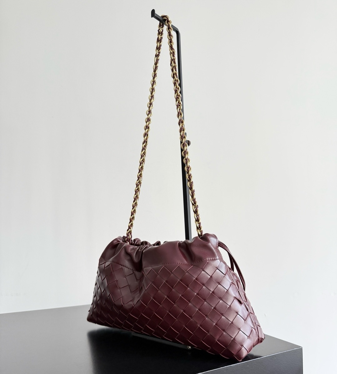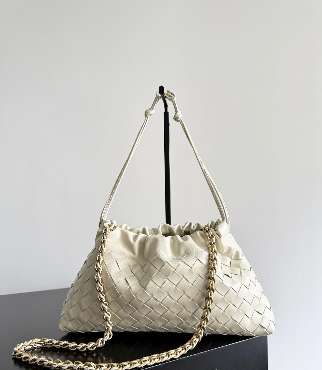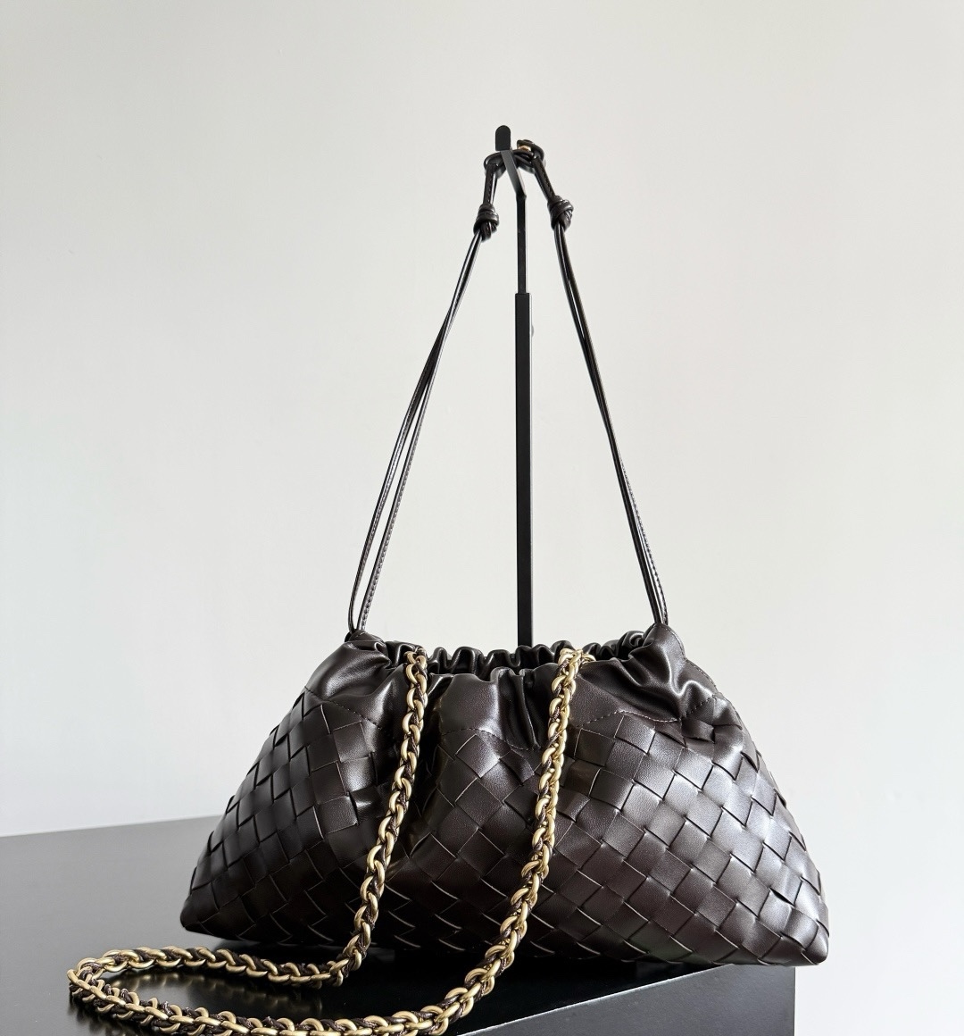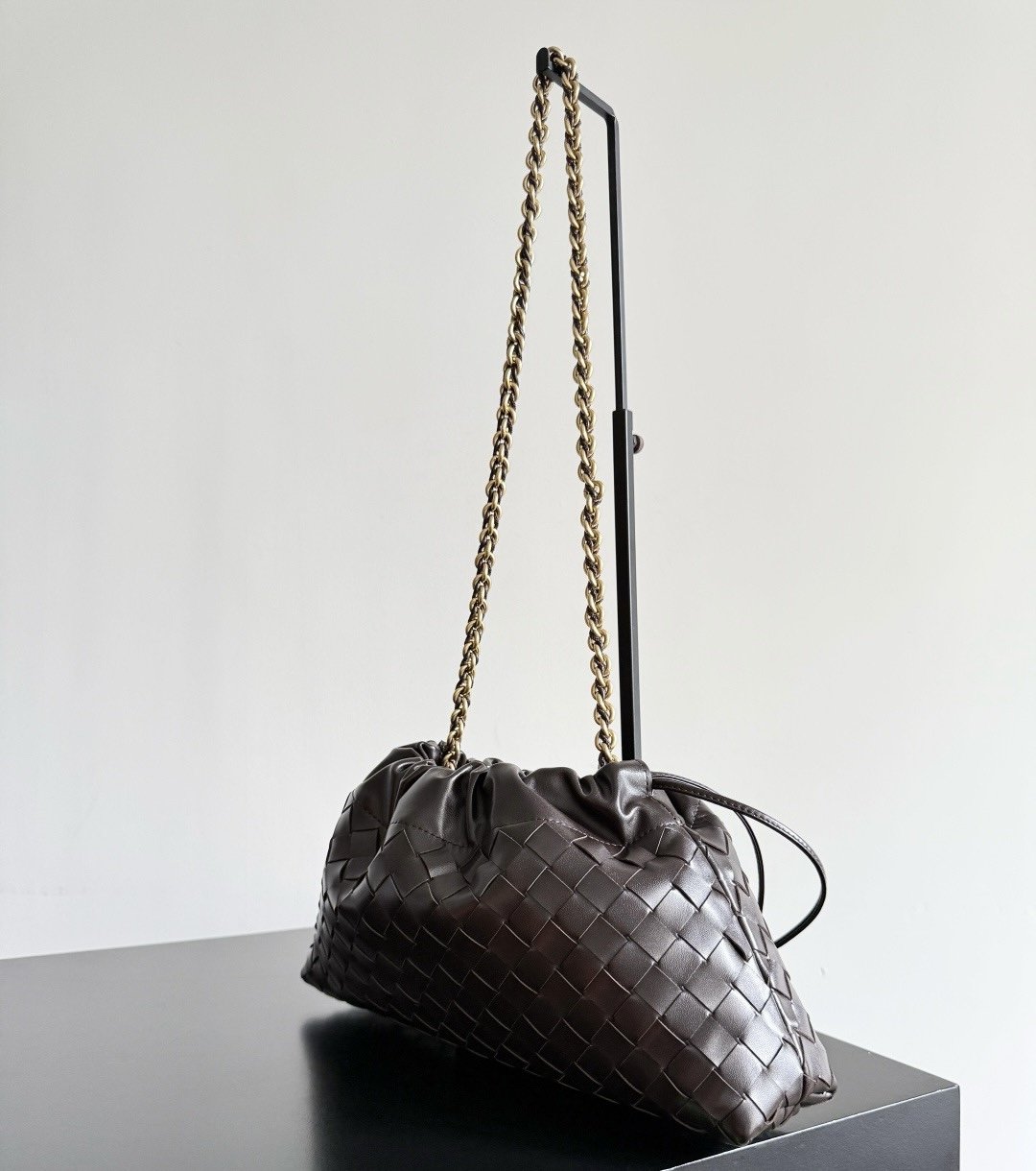 Элегантная женская сумка Dustbag от Bottega Veneta выполнена из натуральной коровьей кожи и украшена фирменным плетением Intrecciato. Золотистая цепочка-ремешок добавляет изысканности и современного шарма образу.