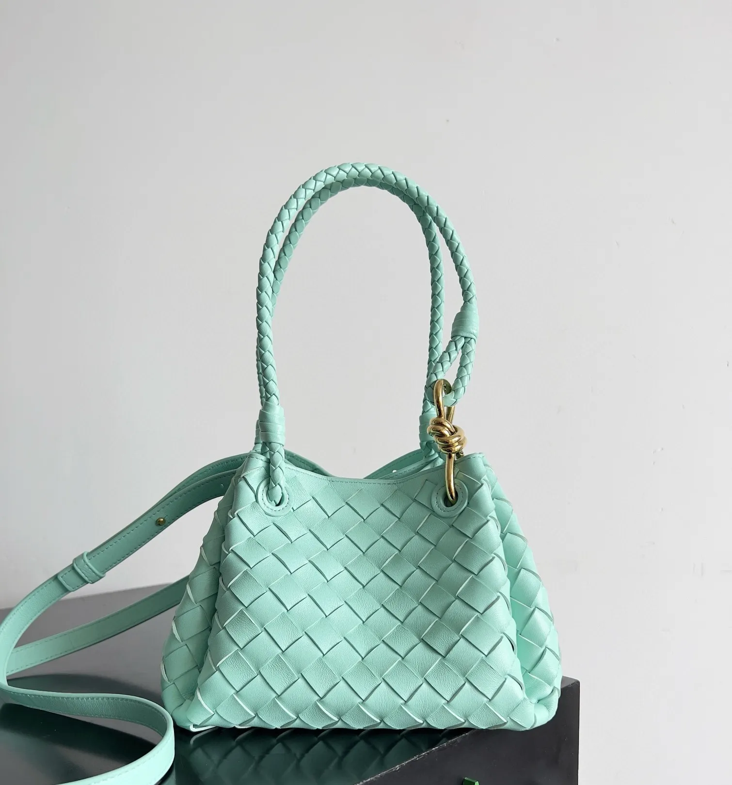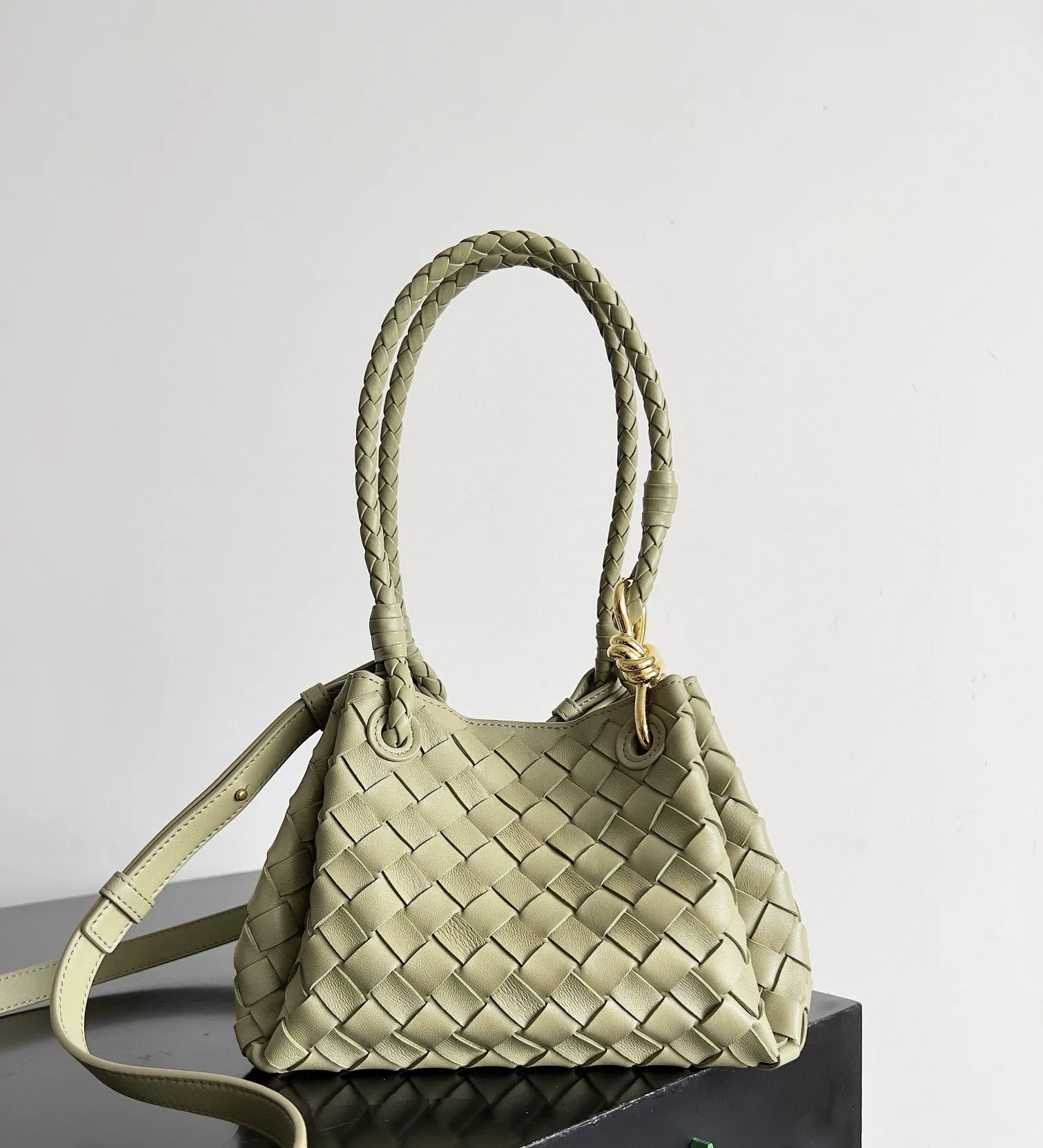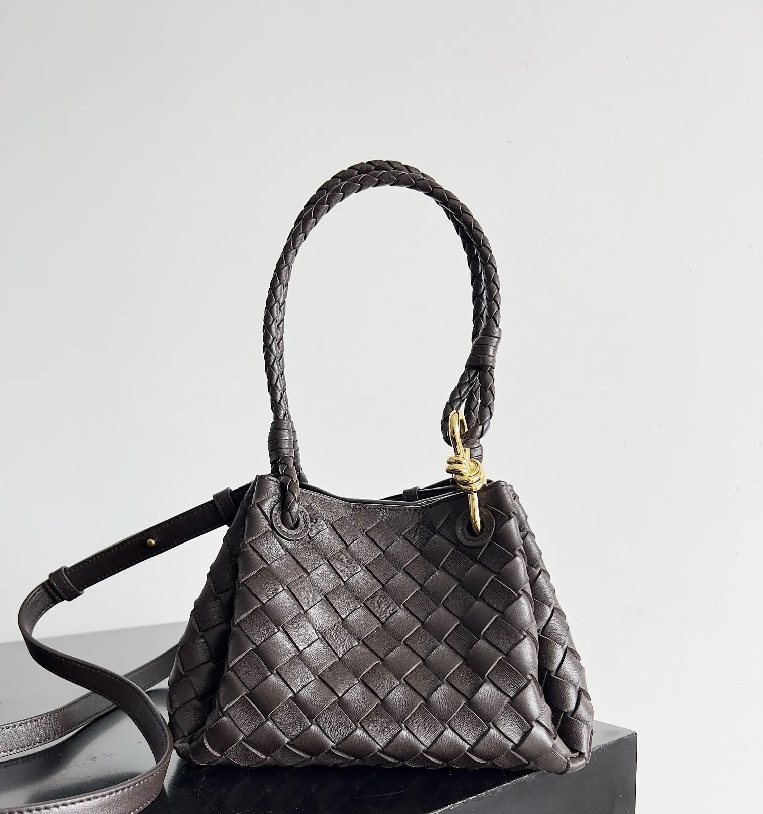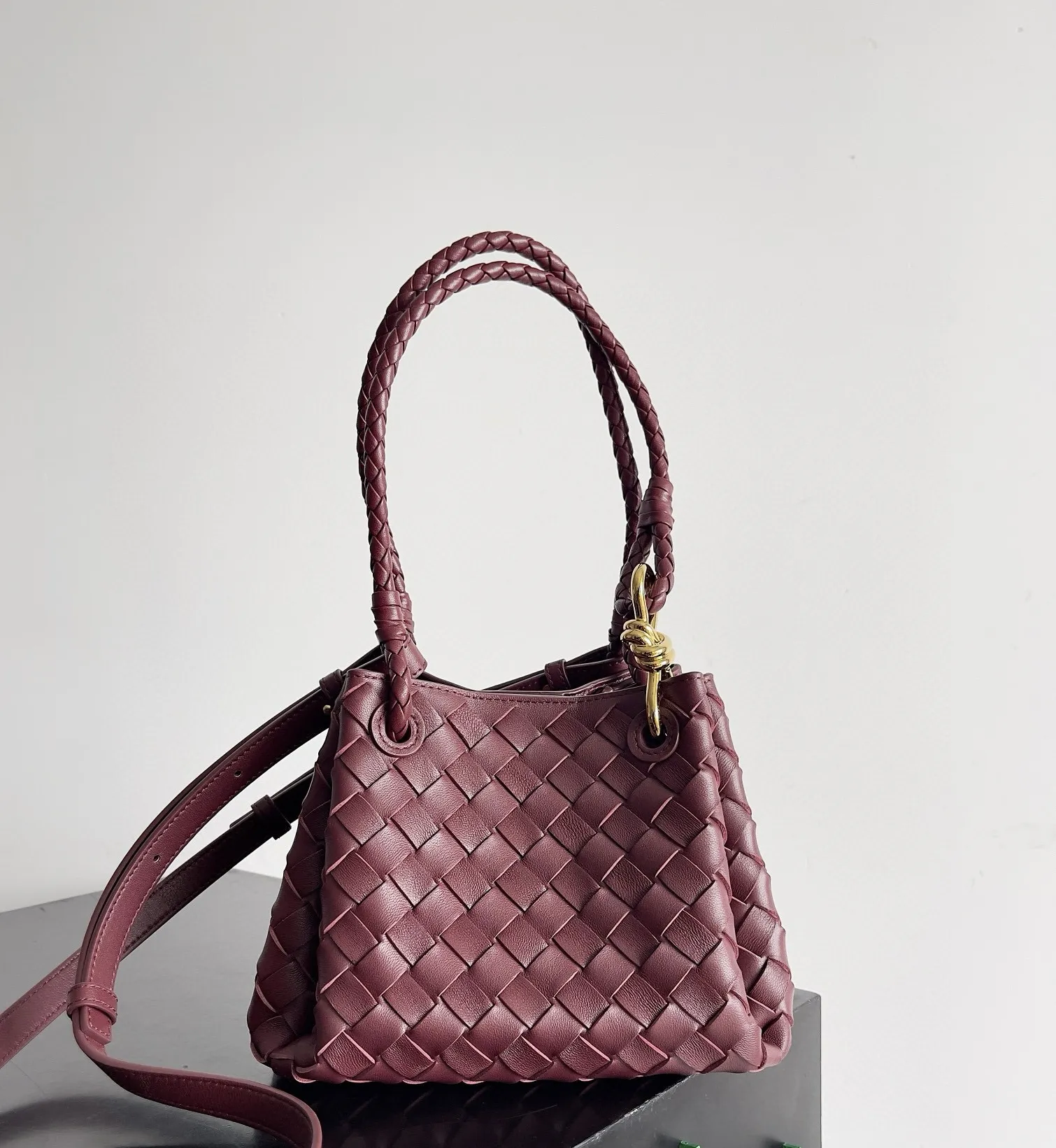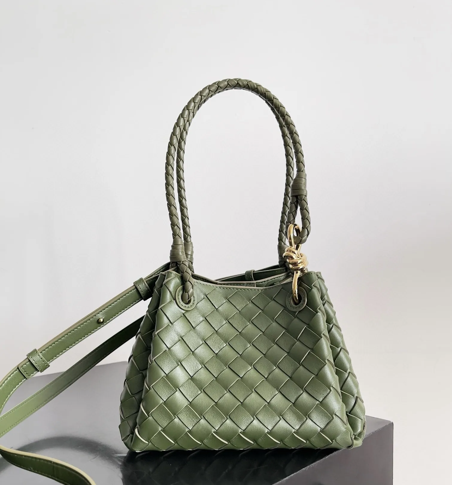 Сумка оснащена двумя плетёными ручками и съемным регулируемым плечевым ремнем, что делает её универсальной для разного стиля ношения. Просторный внутренний отсек удобно вмещает все необходимые вещи, а качественная латунная фурнитура гарантирует надёжность и долговечность изделия.