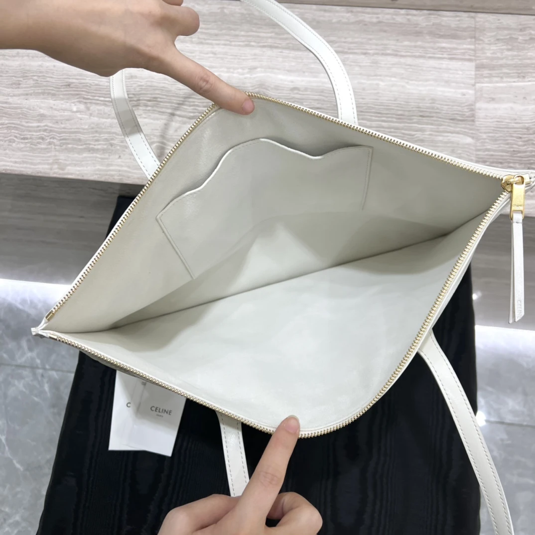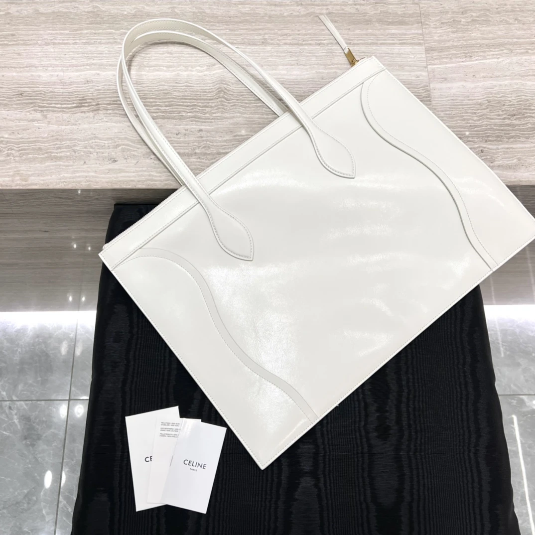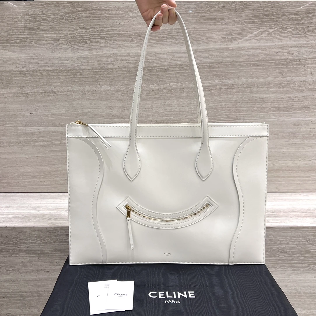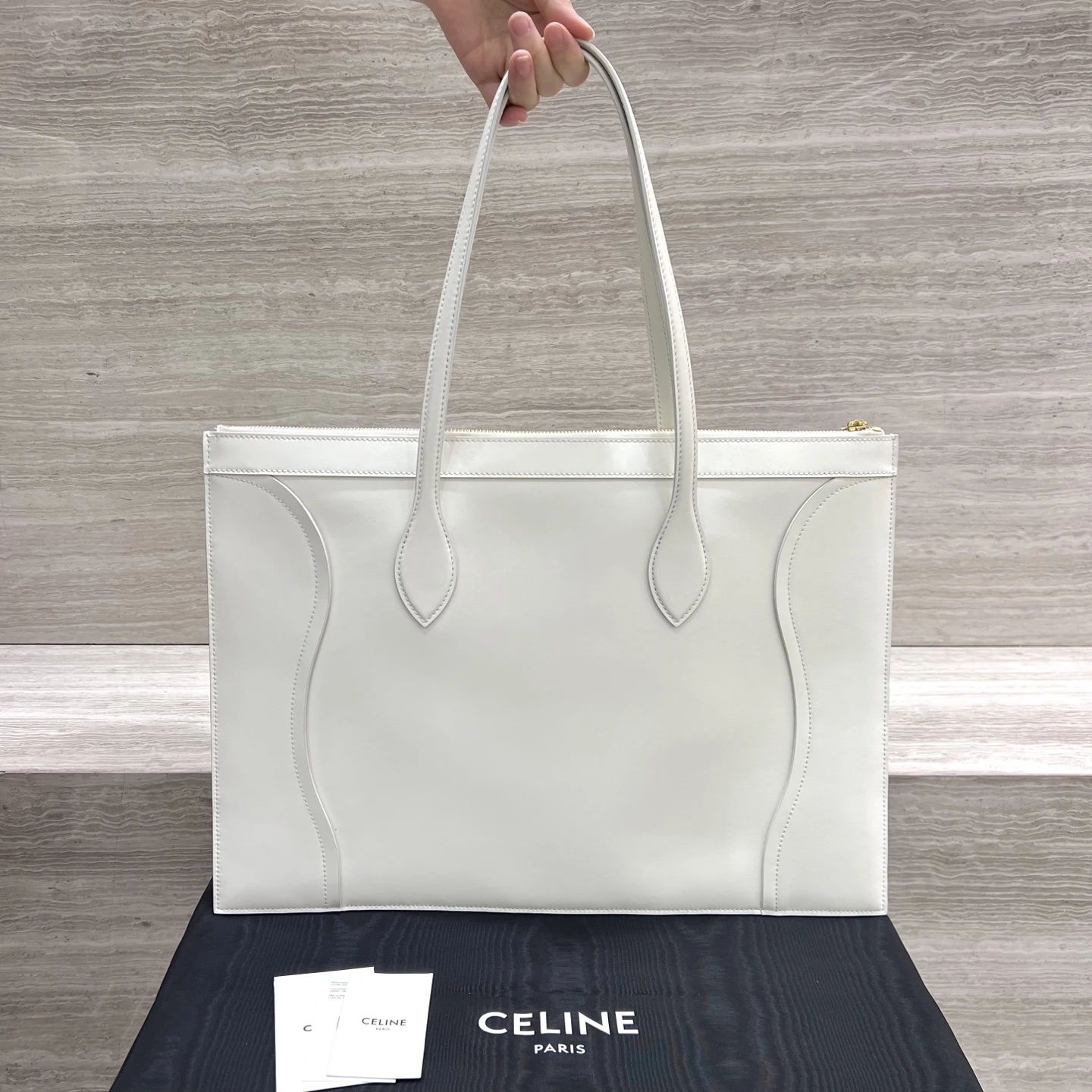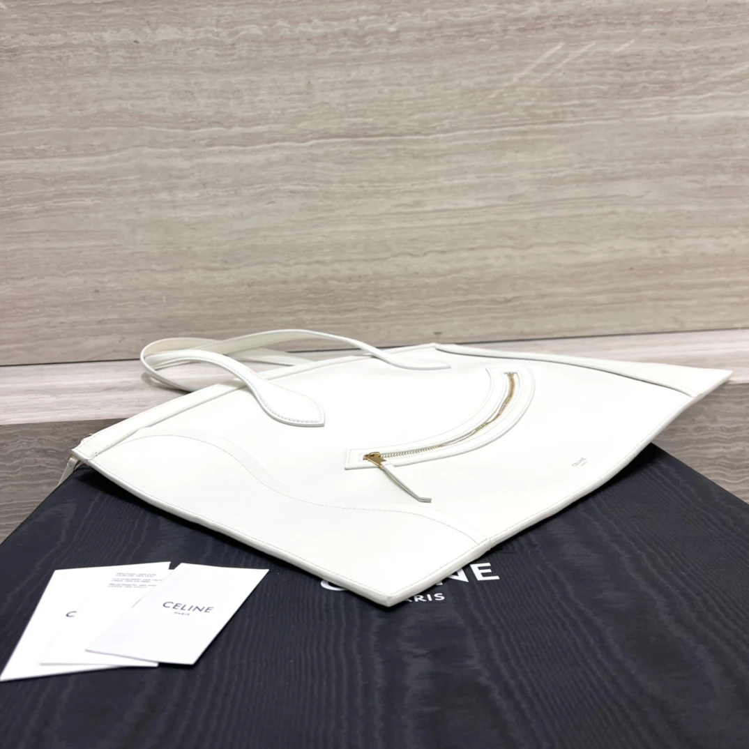 Двойные плоские ручки средней длины позволяют носить сумку в руках или на плече, сохраняя при этом аккуратную геометрию модели. Минималистичное тиснение CELINE Paris спереди подчёркивает премиальность изделия, а глянцевая золотистая фурнитура придаёт образу деликатный блеск. Структурная форма сумки держит силуэт и выглядит строго и современно.