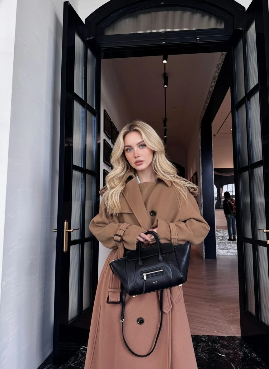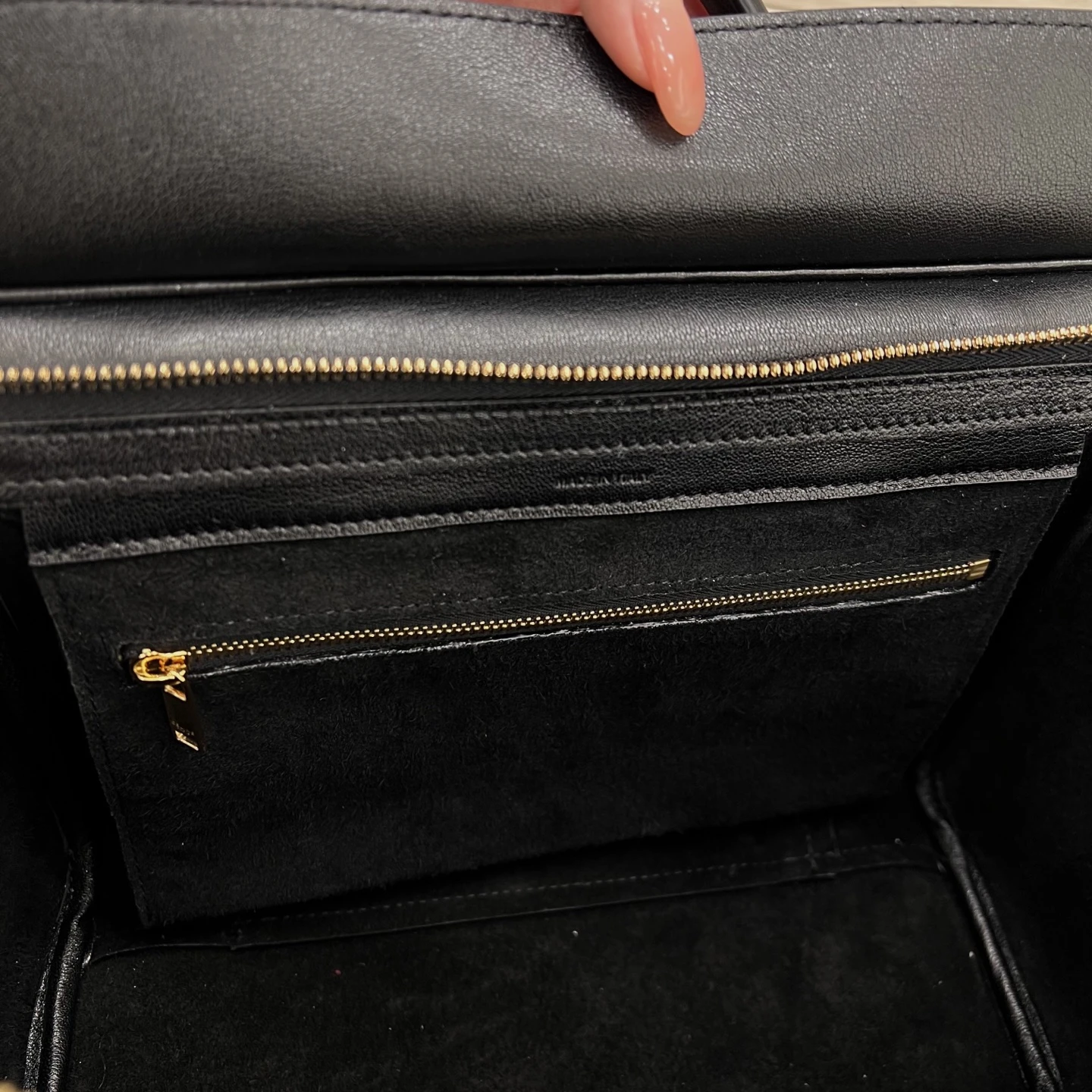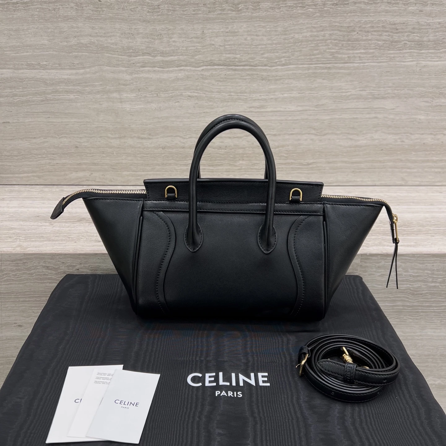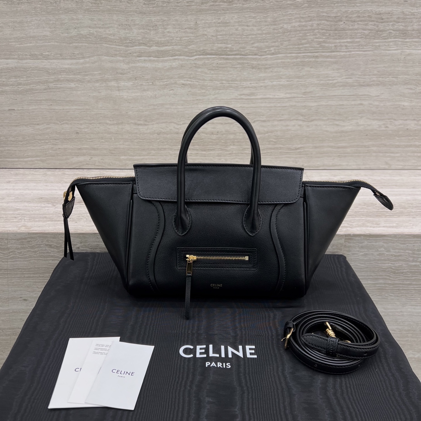 CELINE Luggage — женская сумка, черная кожа, золотая фурнитура. Элегантная сумка CELINE Luggage из черной кожи с узнаваемым «крылатым» силуэтом, золотистой фурнитурой и передним карманом на молнии. Практичная и стильная модель для повседневного ношения и городских образов.
