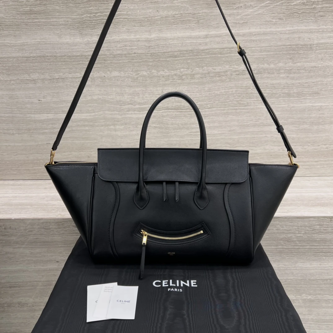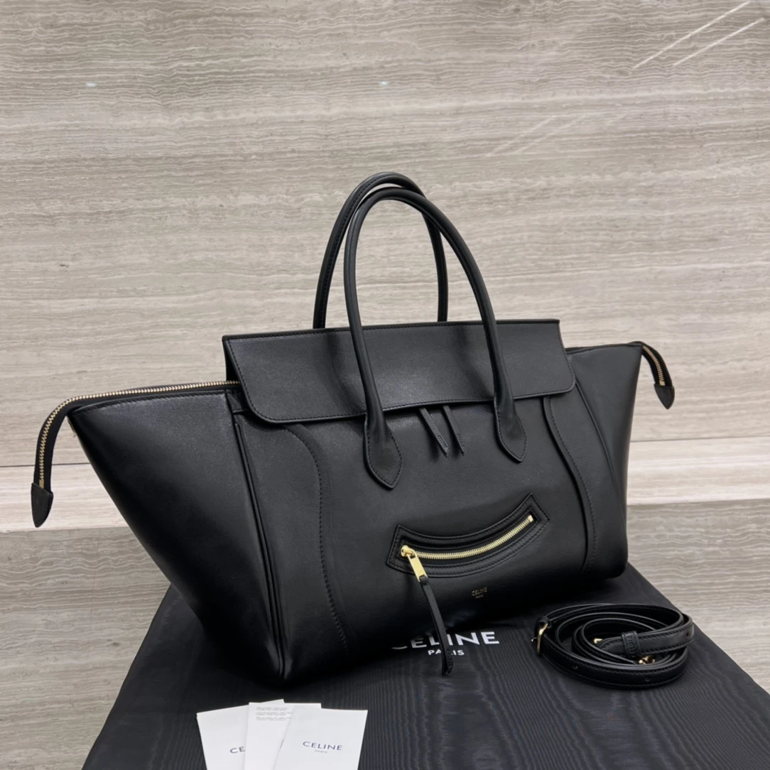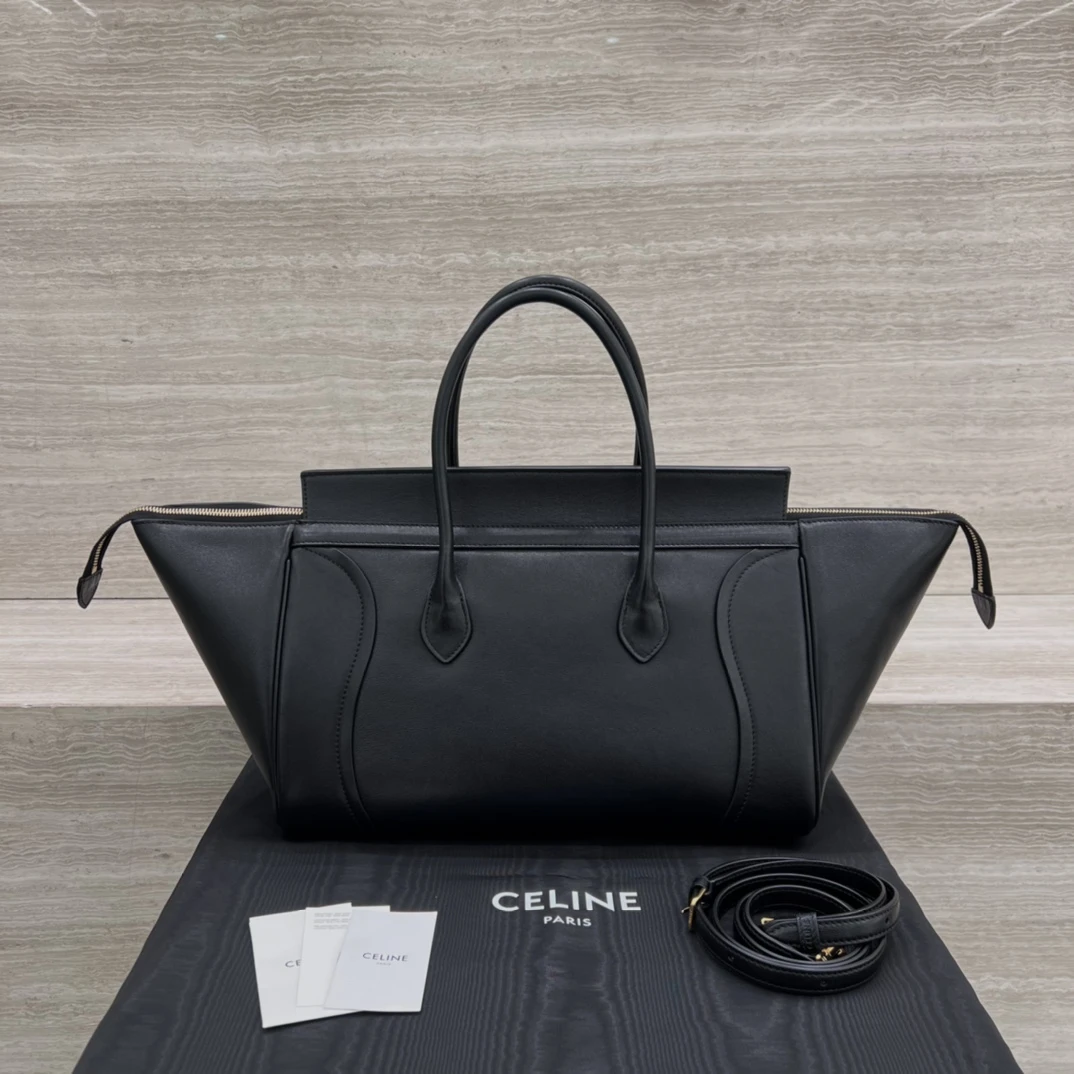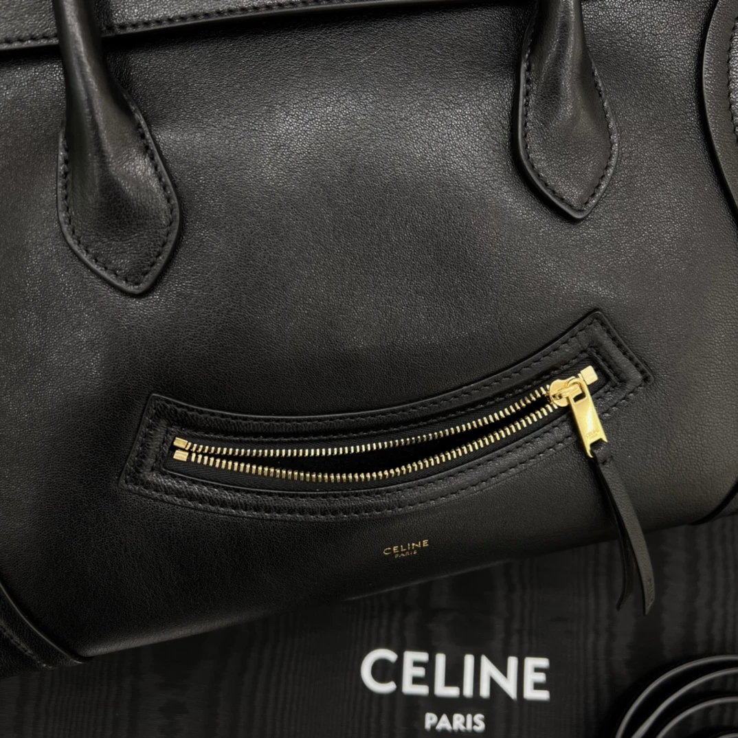 Иконическая сумка Luggage от CELINE в строгом черном исполнении — идеальный выбор для тех, кто ценит сочетание элегантности и практичности. Плавные линии, «крылья» по бокам и выразительный передний карман на молнии формируют узнаваемый силуэт, который легко адаптируется к деловому и повседневному образу.