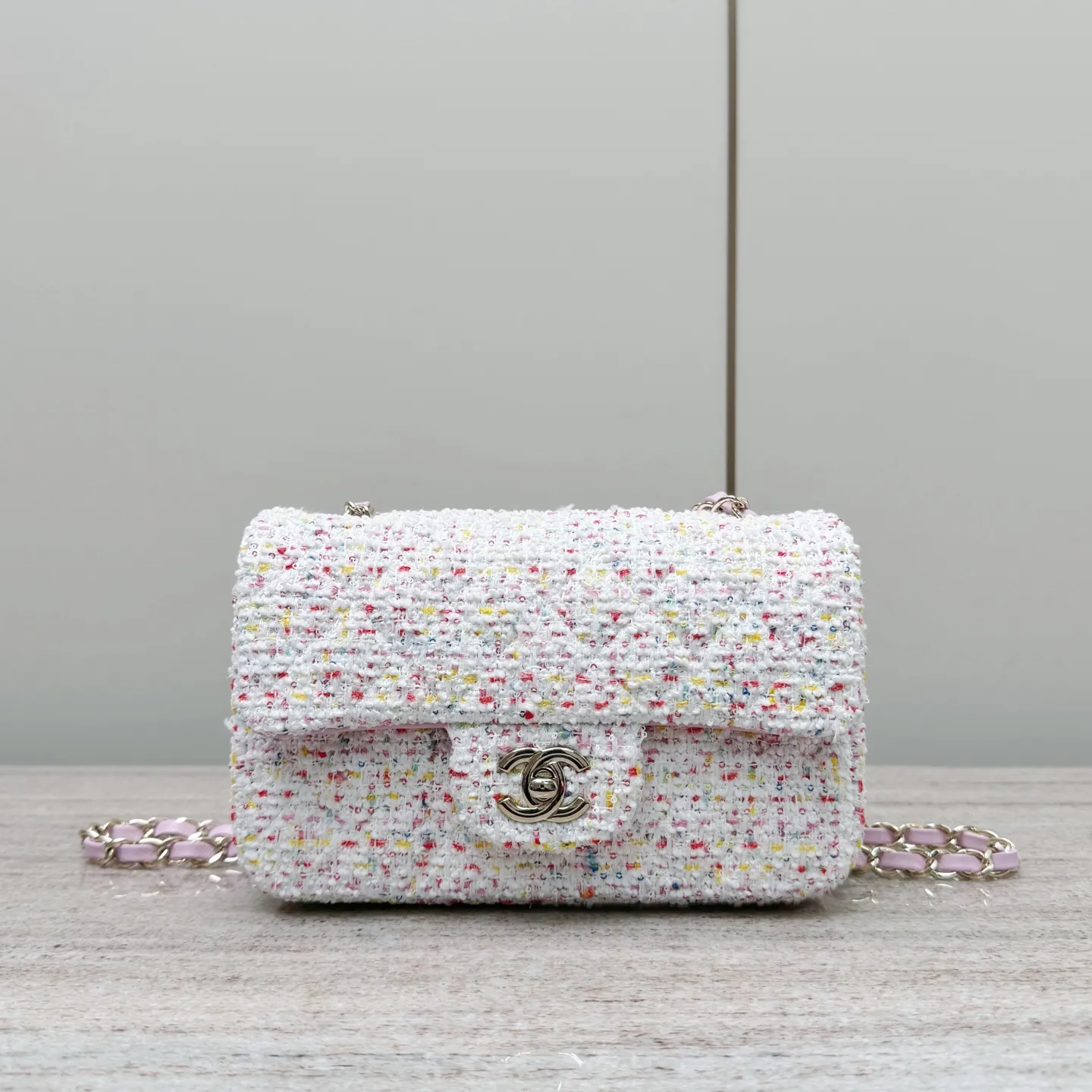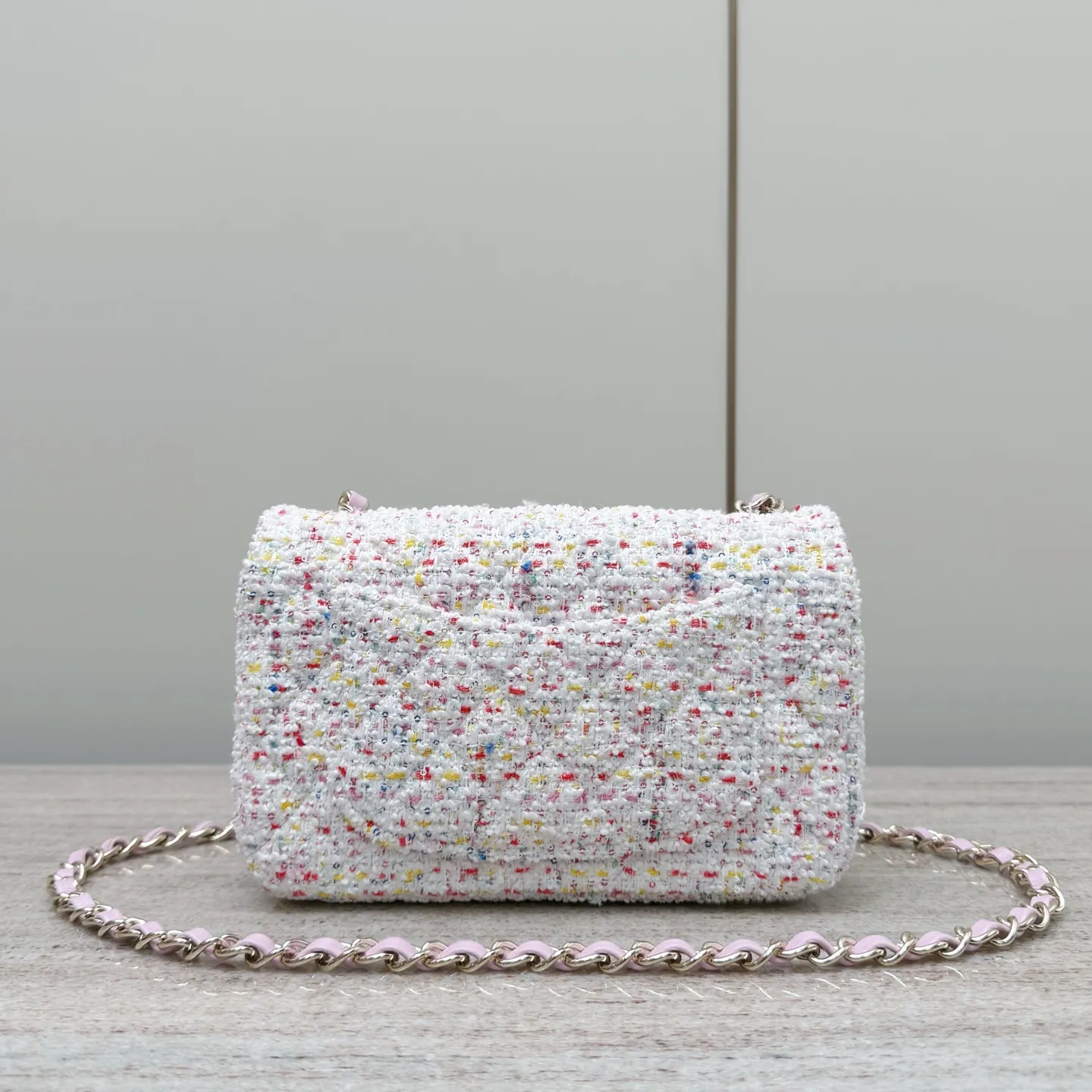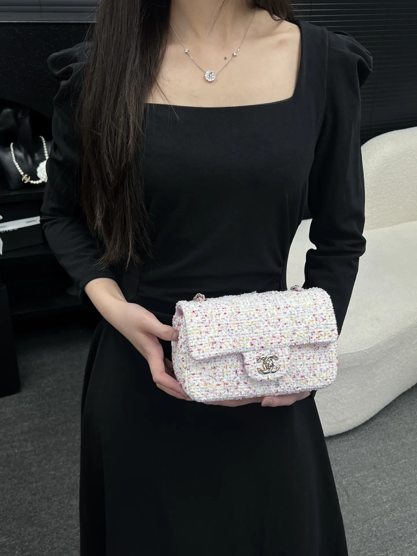Женская сумка Chanel CF20 из твида — воплощение элегантности и фирменного стиля французского дома моды. Модель выполнена из эксклюзивного твида, который гармонично сочетает пастельные оттенки, создавая утончённый образ. Компактный размер делает этот аксессуар идеальным выбором как для дневных, так и для вечерних образов.