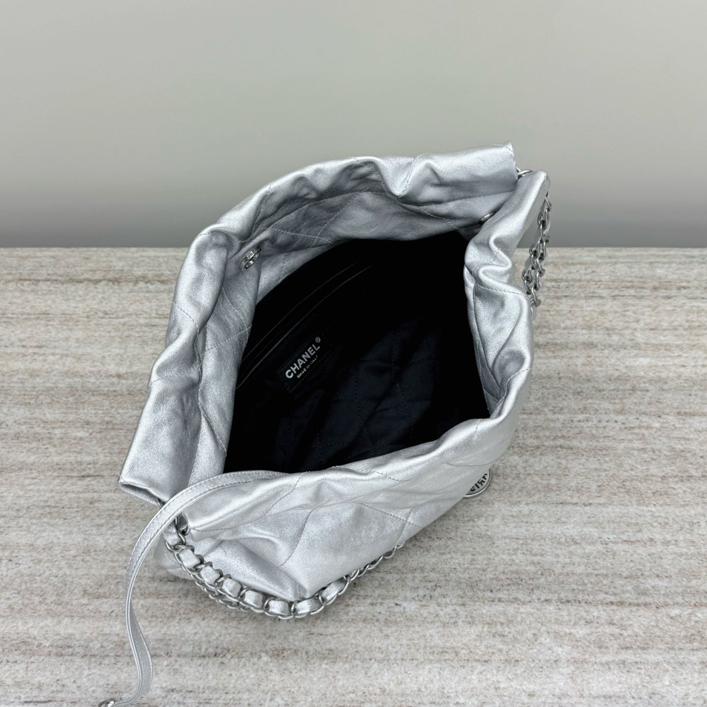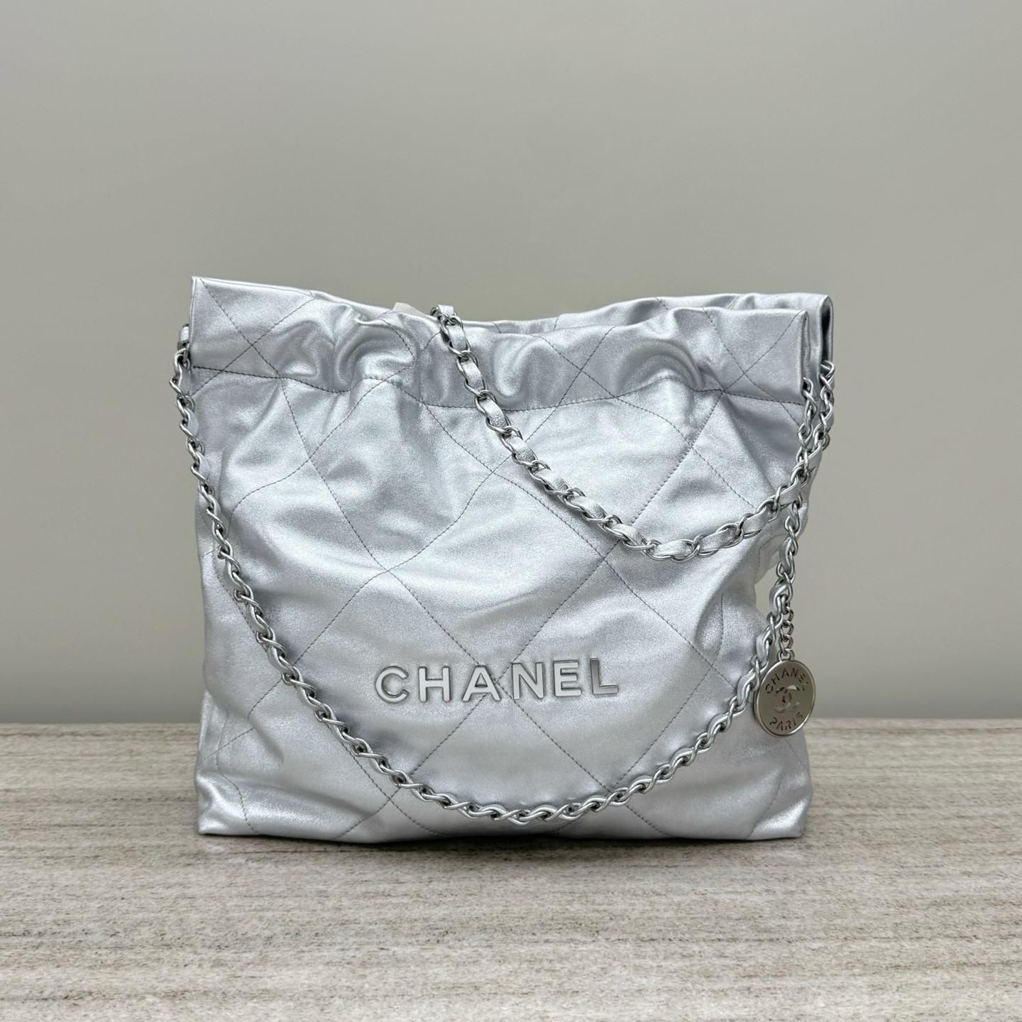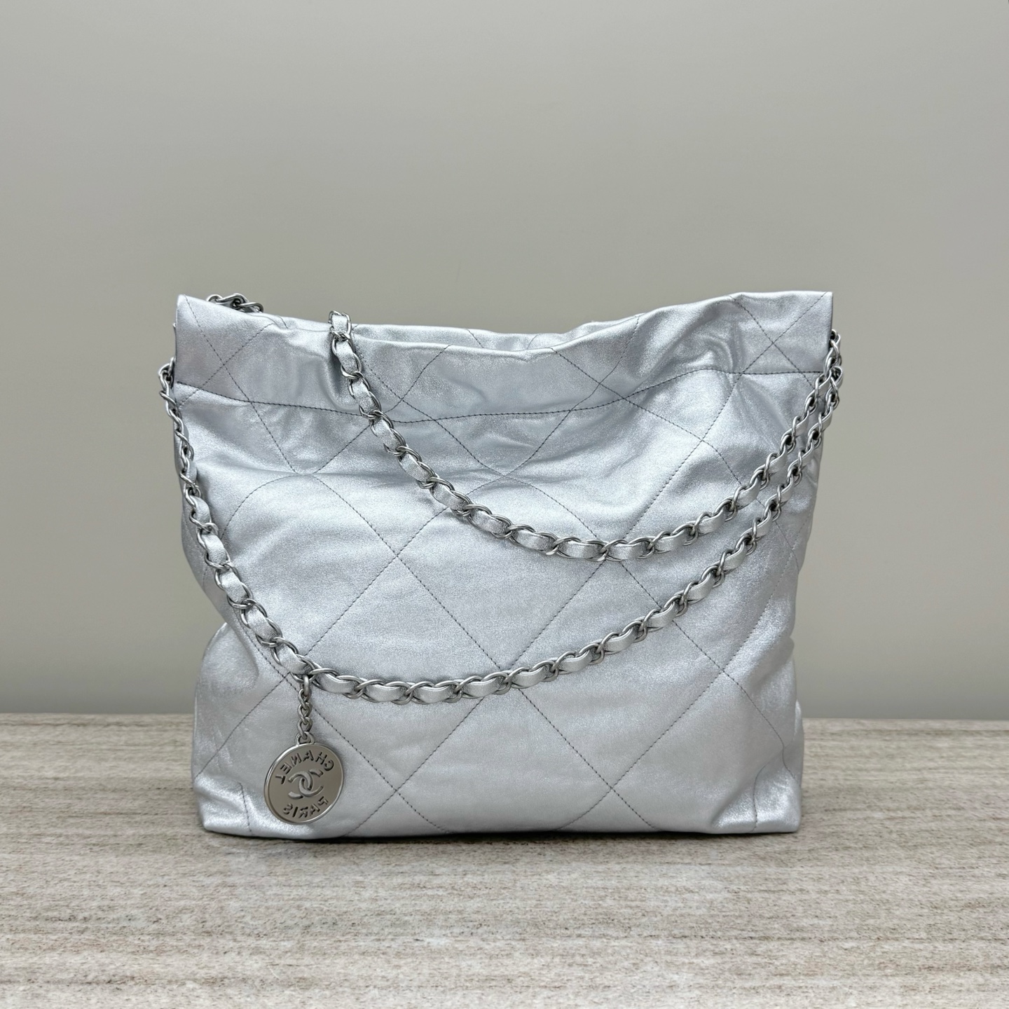 Сумка Chanel 22 из гладкой металлизированной кожи — стильный и современный аксессуар, который отражает новаторский подход модного дома Chanel к дизайну. Эта модель сочетает в себе непринуждённую элегантность и практичность, что делает её идеальным выбором для тех, кто ценит комфорт и роскошь в одном изделии.