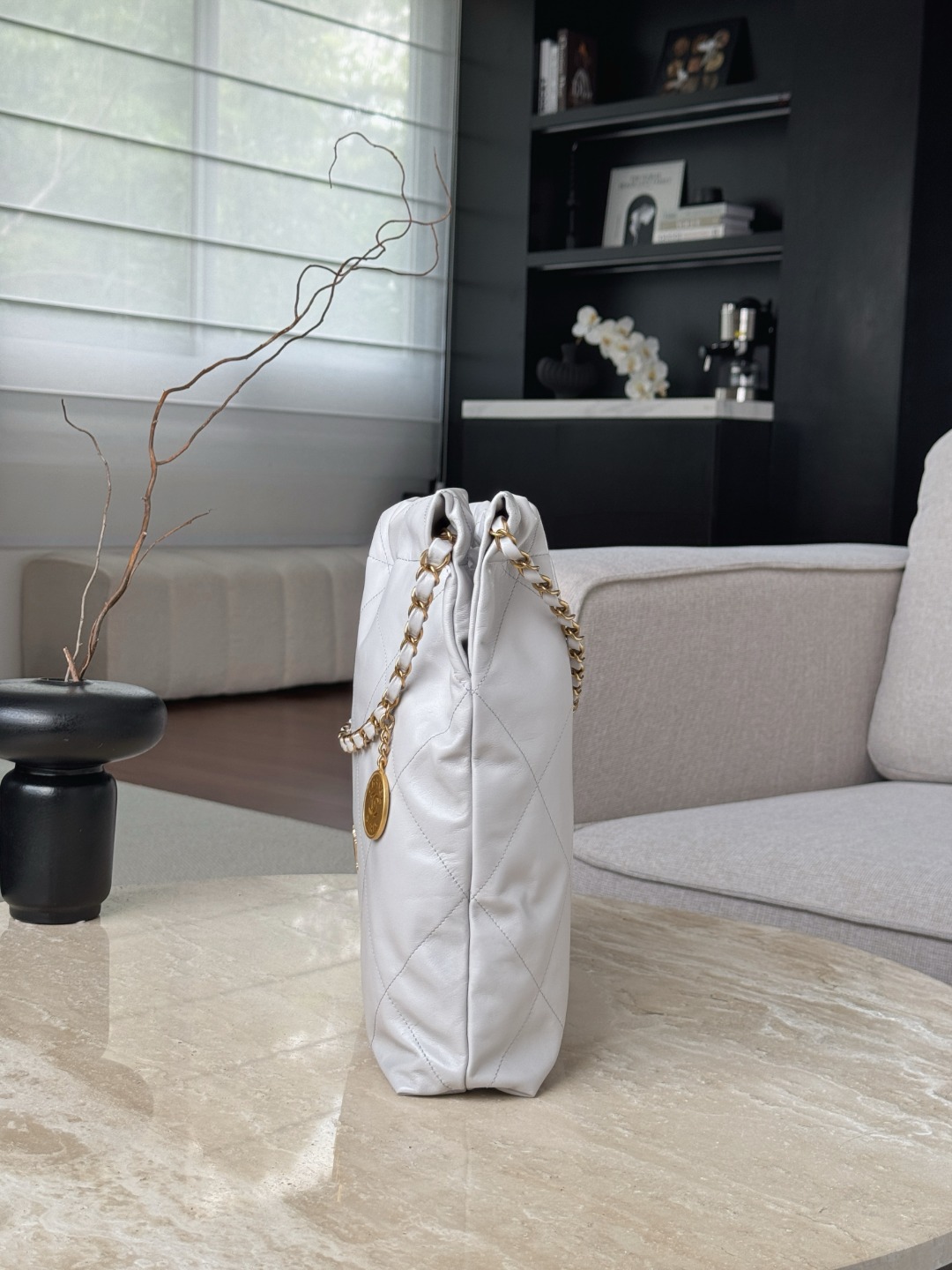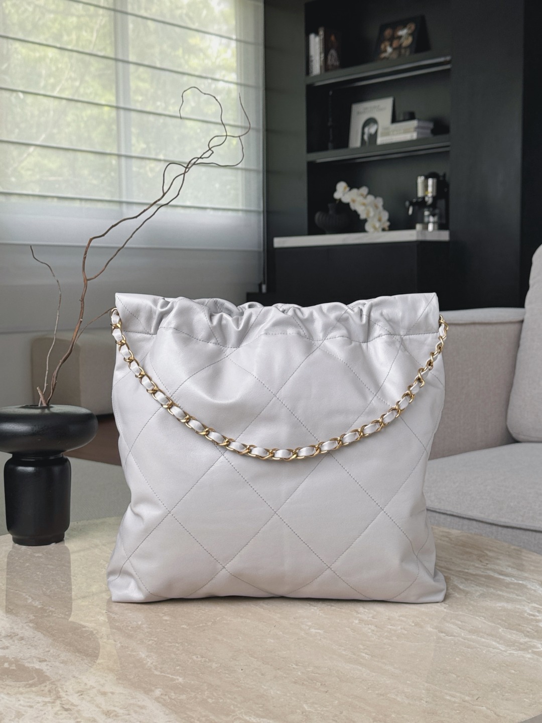 Сумка Chanel 22 из гладкой металлизированной кожи — стильный и современный аксессуар, который отражает новаторский подход модного дома Chanel к дизайну. Эта модель сочетает в себе непринуждённую элегантность и практичность, что делает её идеальным выбором для тех, кто ценит комфорт и роскошь в одном изделии.