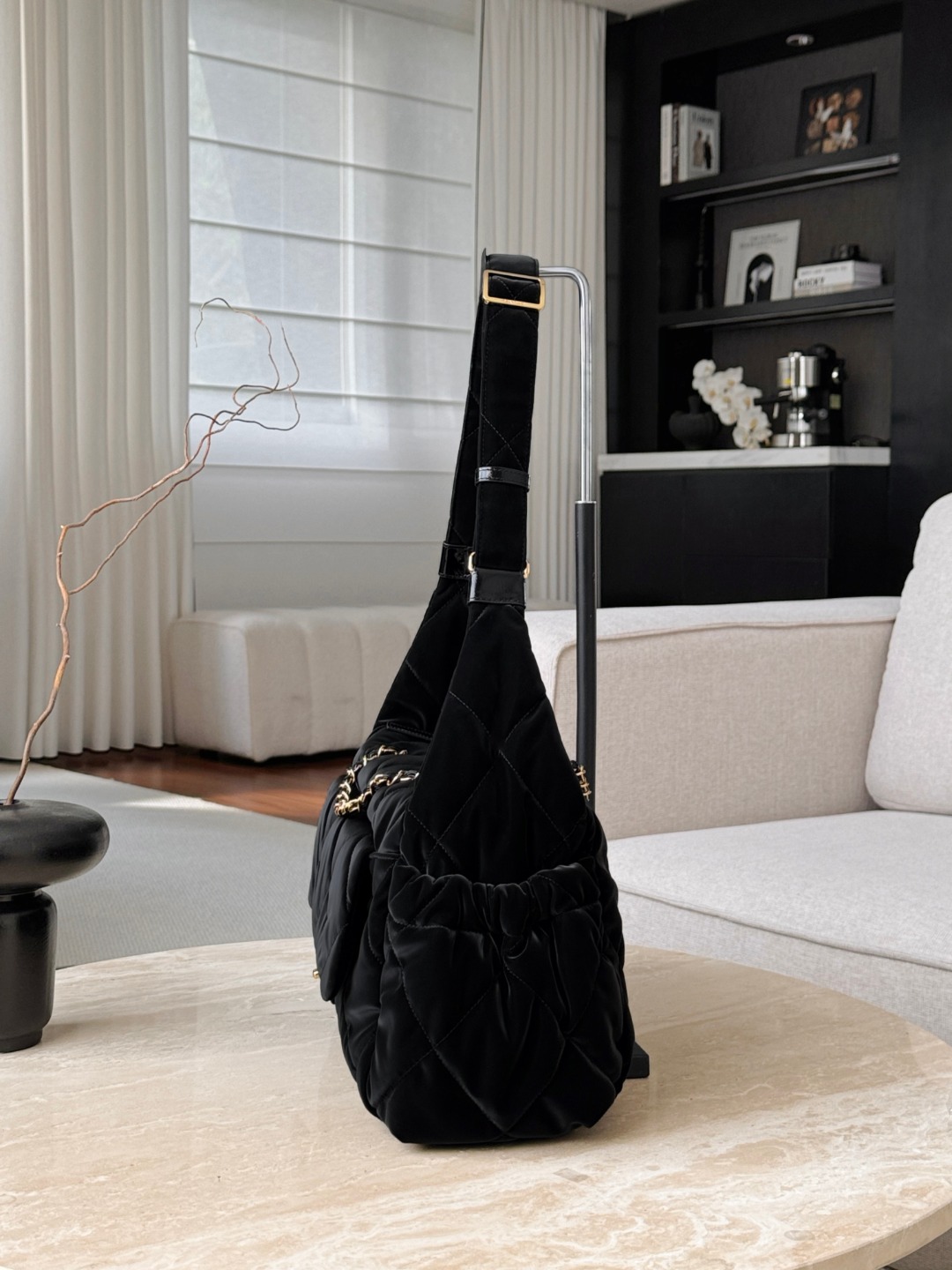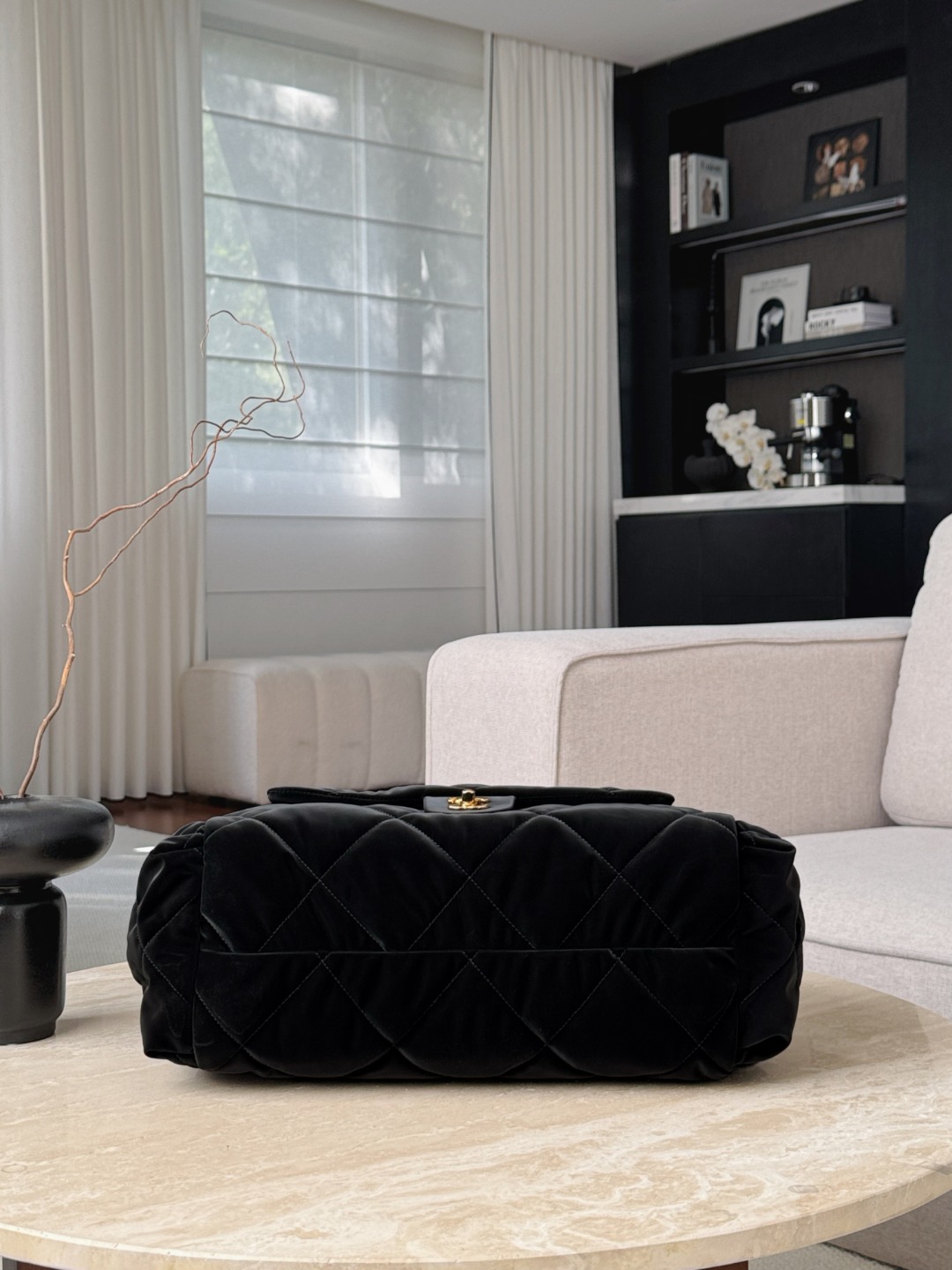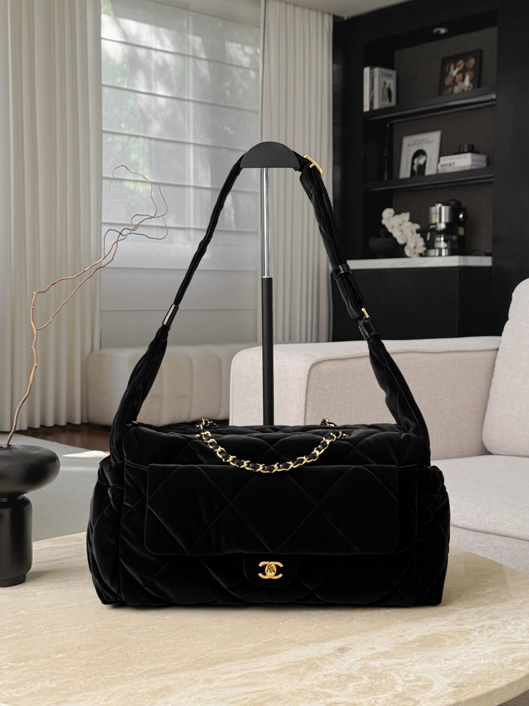 Версия модели 24N изготовлена из мягкого стеганого бархата насыщенного чёрного оттенка. Фирменная стёжка «ромб» придаёт объёму и текстуру, а благородный матовый блеск бархата создаёт глубокий, насыщенный эффект. Передняя клапанная секция украшена золотистой застёжкой с эмблемой CC — узнаваемый акцент бренда. Короткая декоративная цепочка золотистого тона на клапане гармонирует с более функциональным регулируемым плечевым ремнём, выполненным из мягкого текстиля с возможностью регулировки длины и эффектом набивки для удобства ношения на плече.