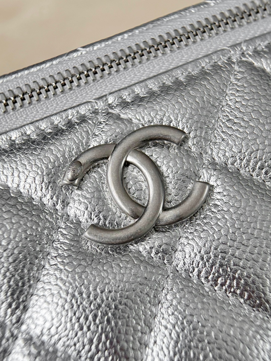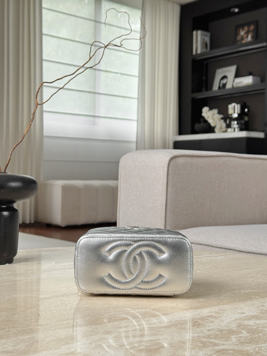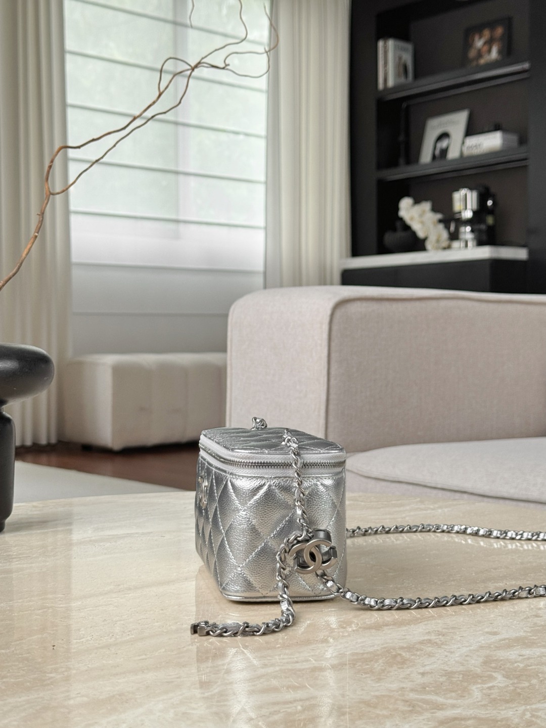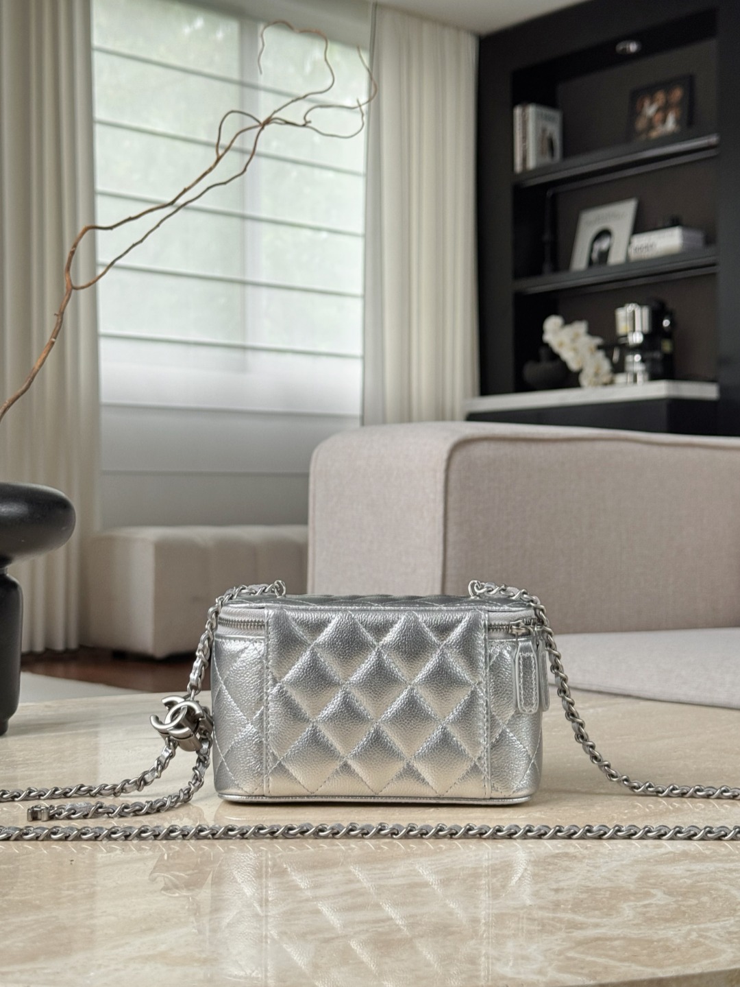 Элегантная компактная сумка CHANEL 25b в серебристом металлизированном оттенке. Жесткая прямоугольная форма в стиле vanity-case, фирменная ромбовая стежка, металлический логотип CC спереди и тонкая цепочная лямка — идеальный аксессуар для вечерних образов и городских выходов.