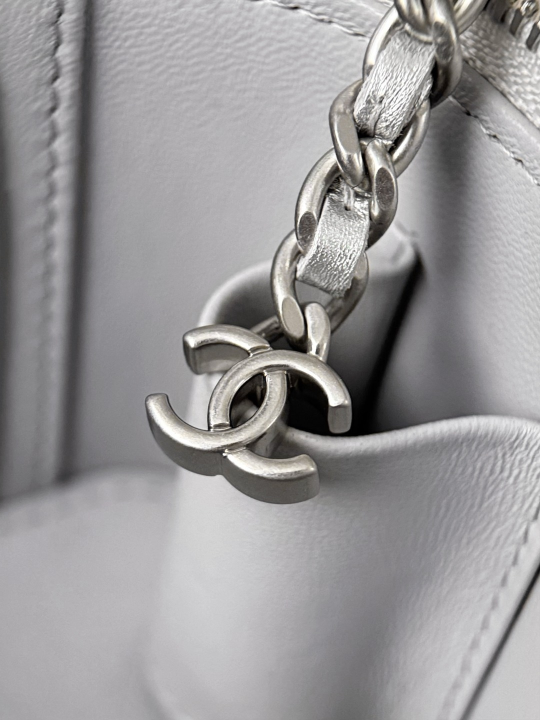 • Фурнитура: матово‑серебристый металлический логотип CC спереди и цепочная лямка в тон фурнитуры. На одной стороне видна декоративная подвеска с фирменным символом.