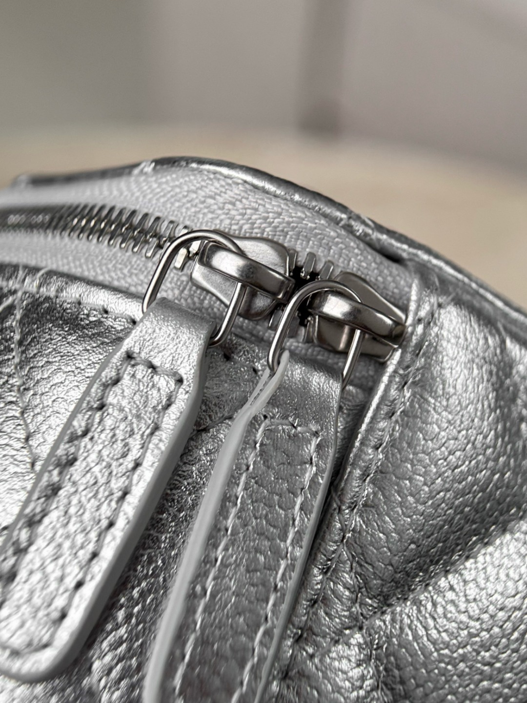 • Материал: серебристая металлизированная зернистая кожа с характерной фактурой, которая красиво отражает свет и создает благородный блеск.