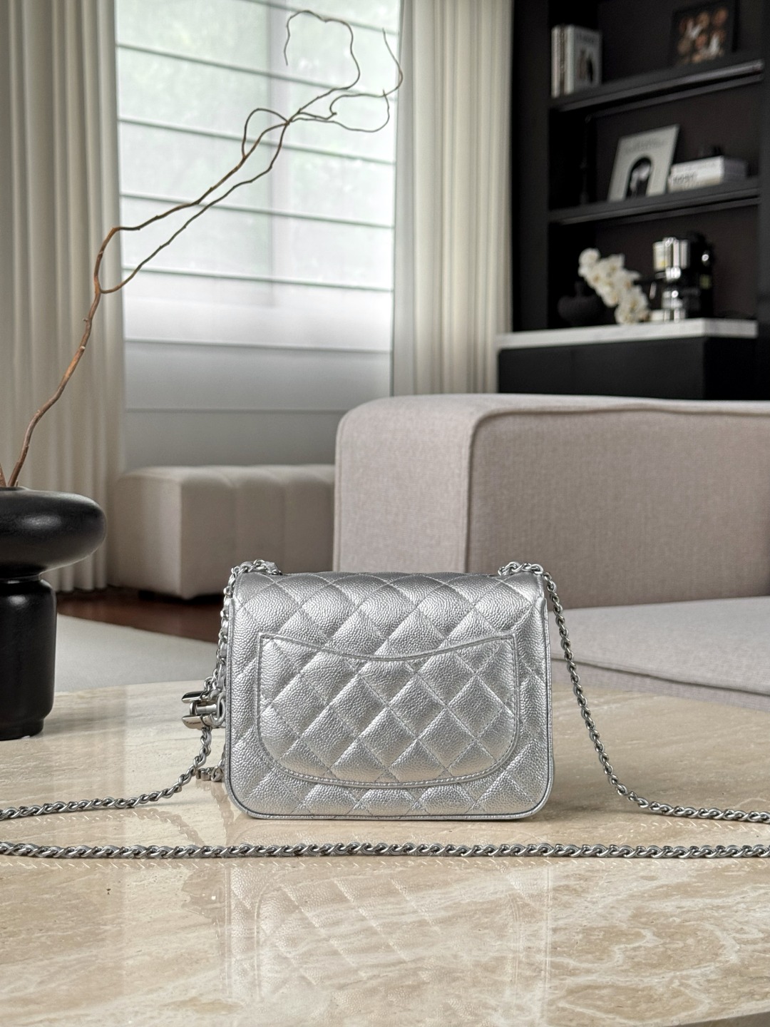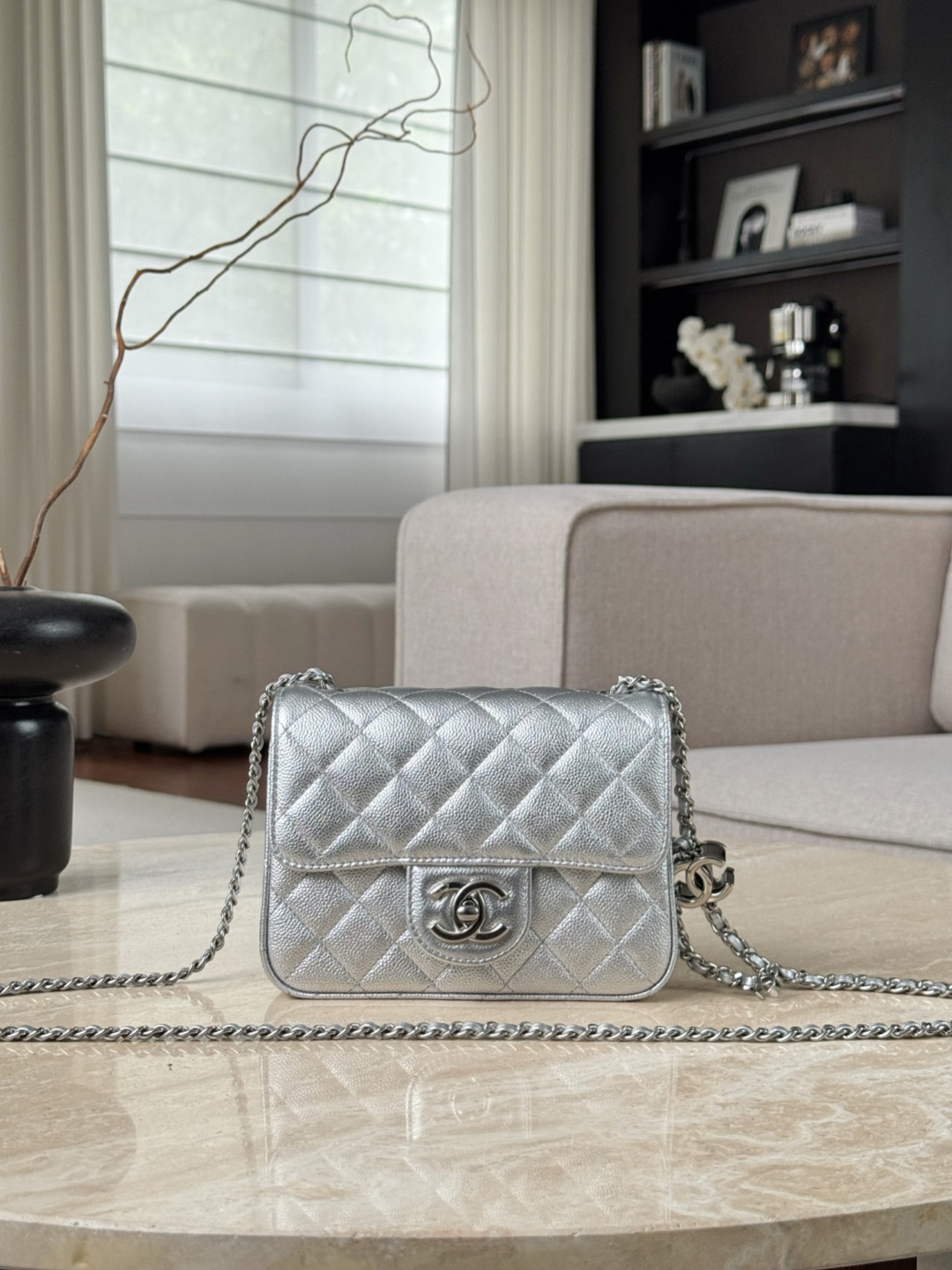 Элегантная компактная сумка CHANEL 25b в металлическом серебристом исполнении с фирменной ромбовой прострочкой и классической застёжкой-логотипом CC. Универсальная модель — идеально смотрится как в вечерних образах, так и в стильном дневном гардеробе.