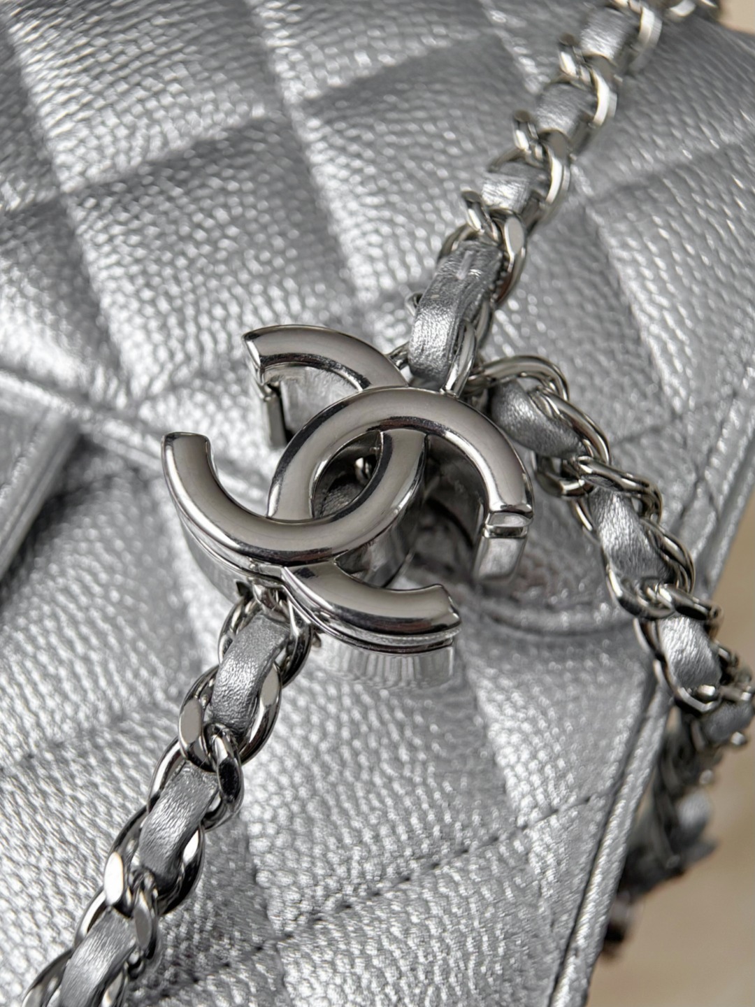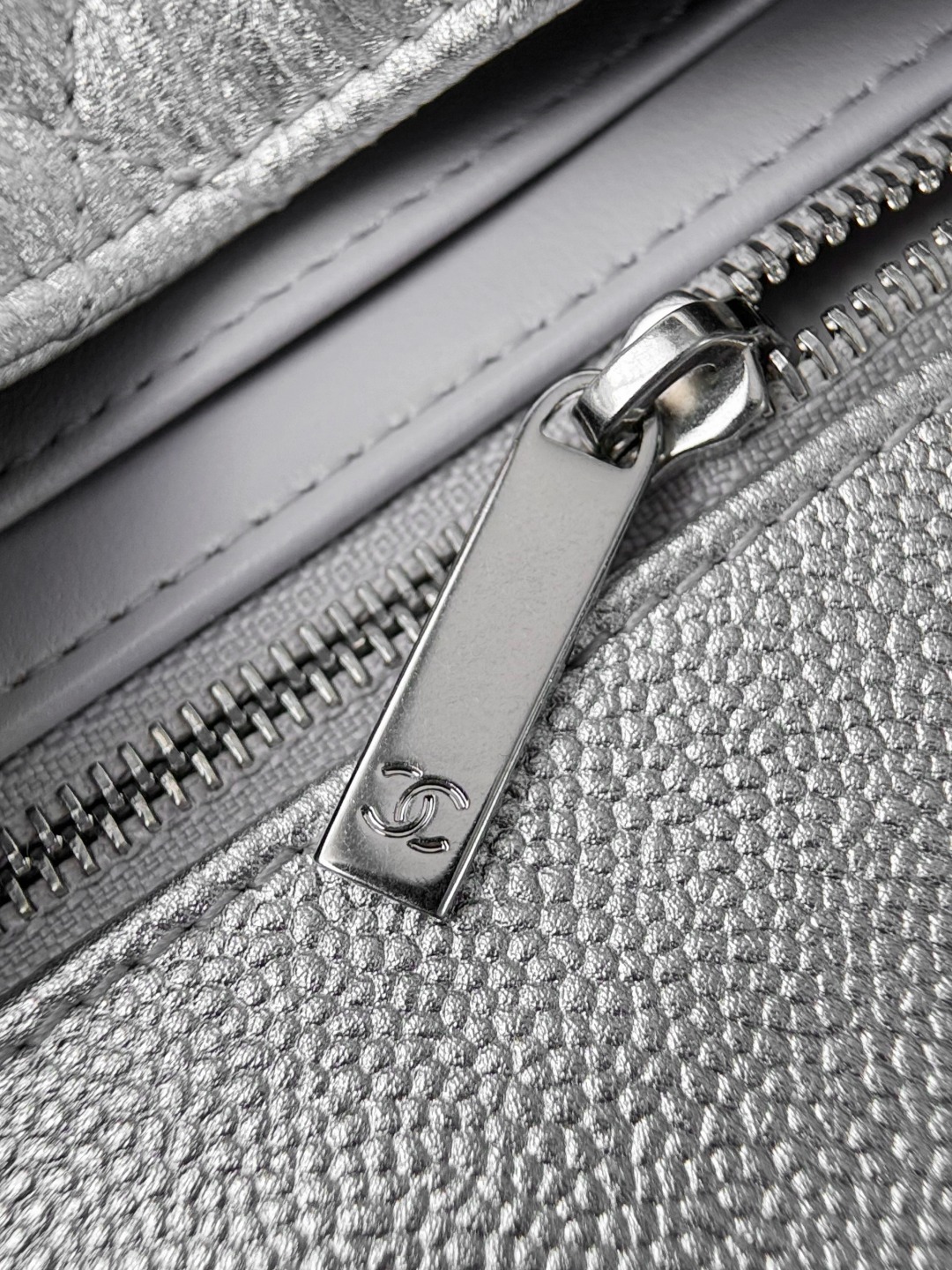 • Внешний вид: прямоугольный силуэт с закруглёнными углами, стеганая ромбовая прострочка, металлизированная серебристая поверхность с лёгкой зернистой фактурой. Передняя клапанная кромка украшена культовой застёжкой в виде переплетённых букв CC в серебристом тоне.