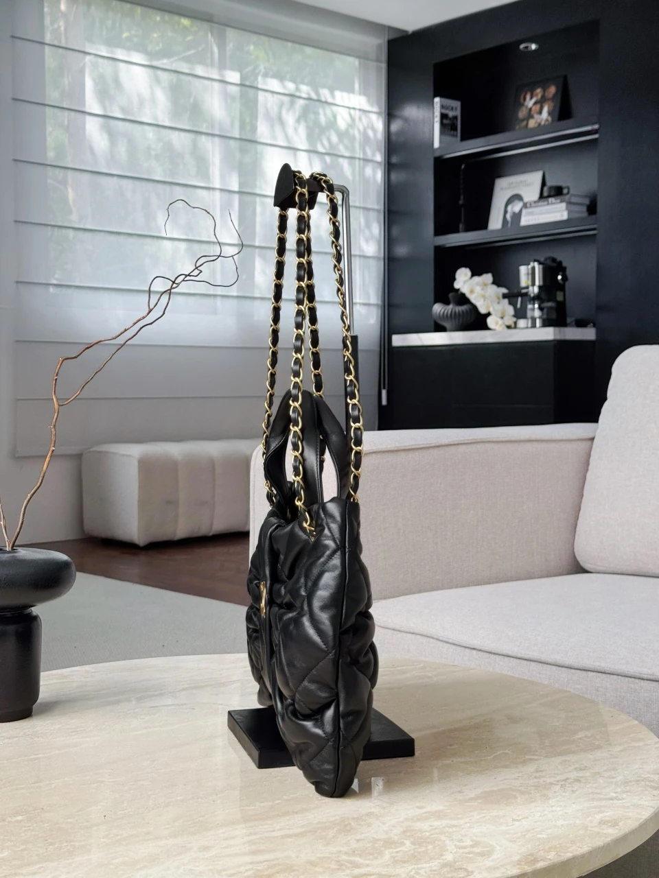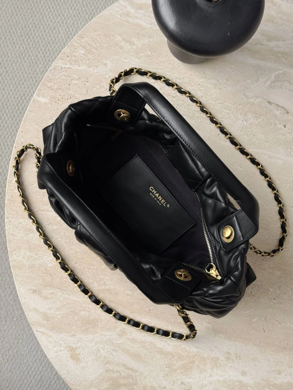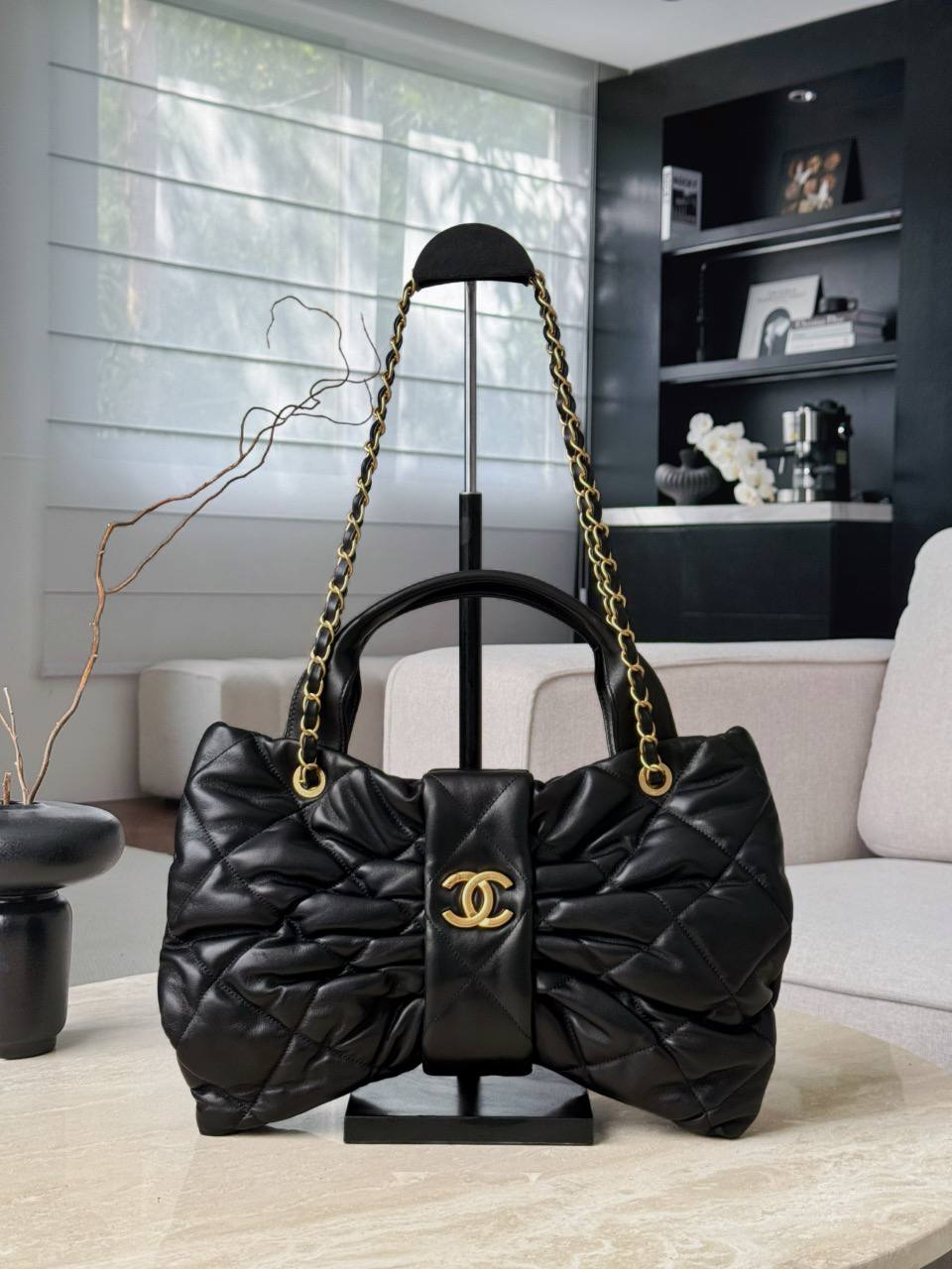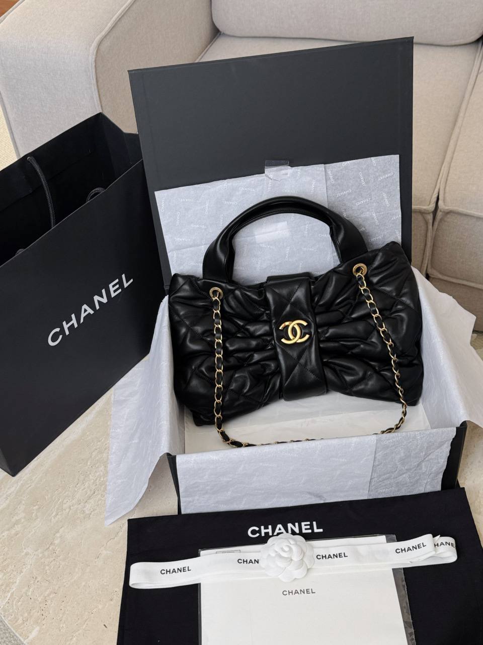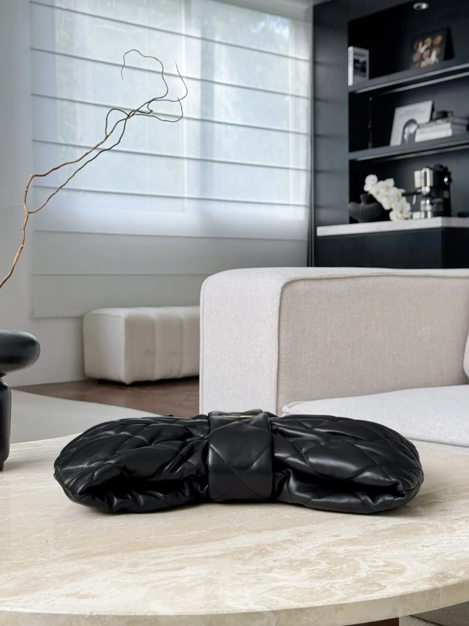 Изысканная сумка CHANEL 25K в глубокo‑черном цвете сочетает в себе фирменную элегантность и современную романтичность. Мягкая стеганая кожа с выразительными складками формирует декоративный «бант» спереди, подчёркнутый центральным ремнём с золотистым логотипом CC — идеальный акцент для вечернего образа и стильной повседневной элегантности.