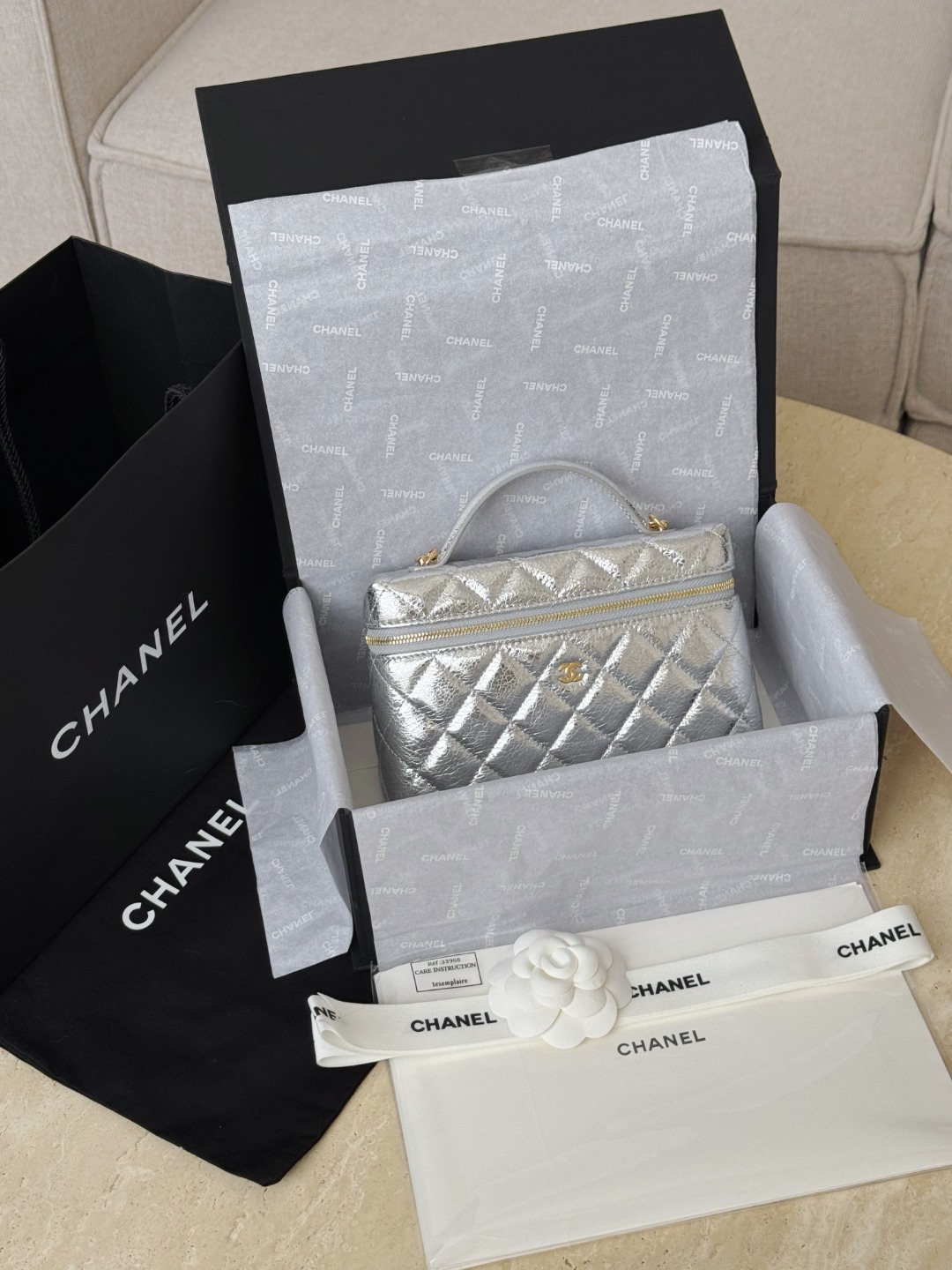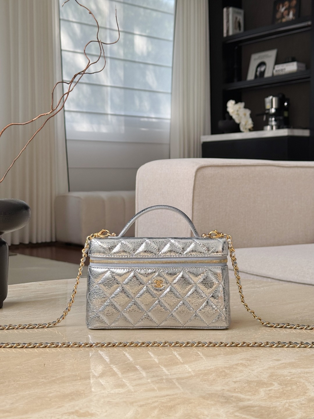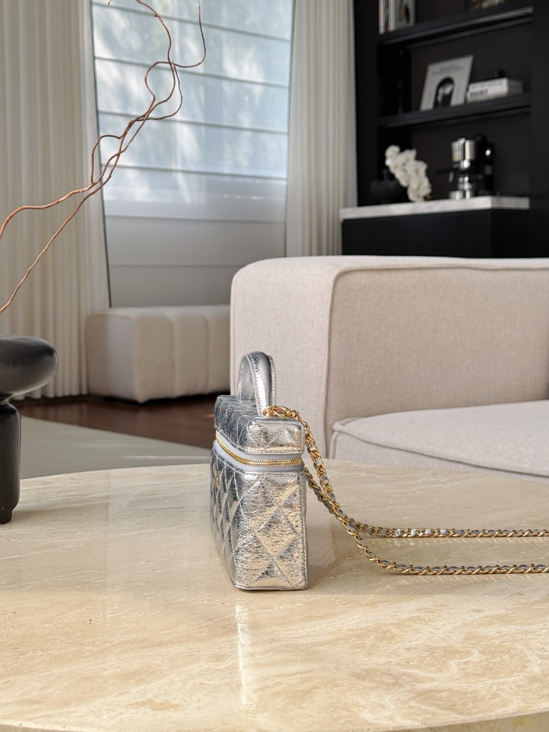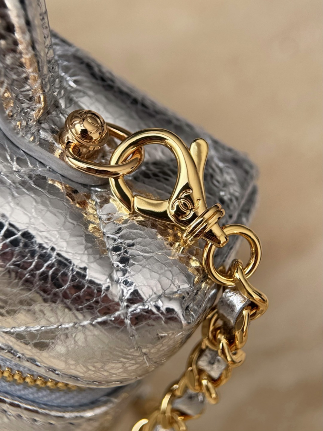 Эта мини-сумка Chanel 26x lp сочетает в себе изысканную классическую стёжку и современный металлизированный блеск. Удобная застёжка-молния по верхнему периметру, наружный карман и компактный внутренний отсек позволяют хранить телефон, кошелёк, ключи и косметику, не перегружая образ. Золотистая цепочка с кожаной вставкой и короткая ручка дают варианты ношения: на плече, через плечо или в руке как маленький клатч.