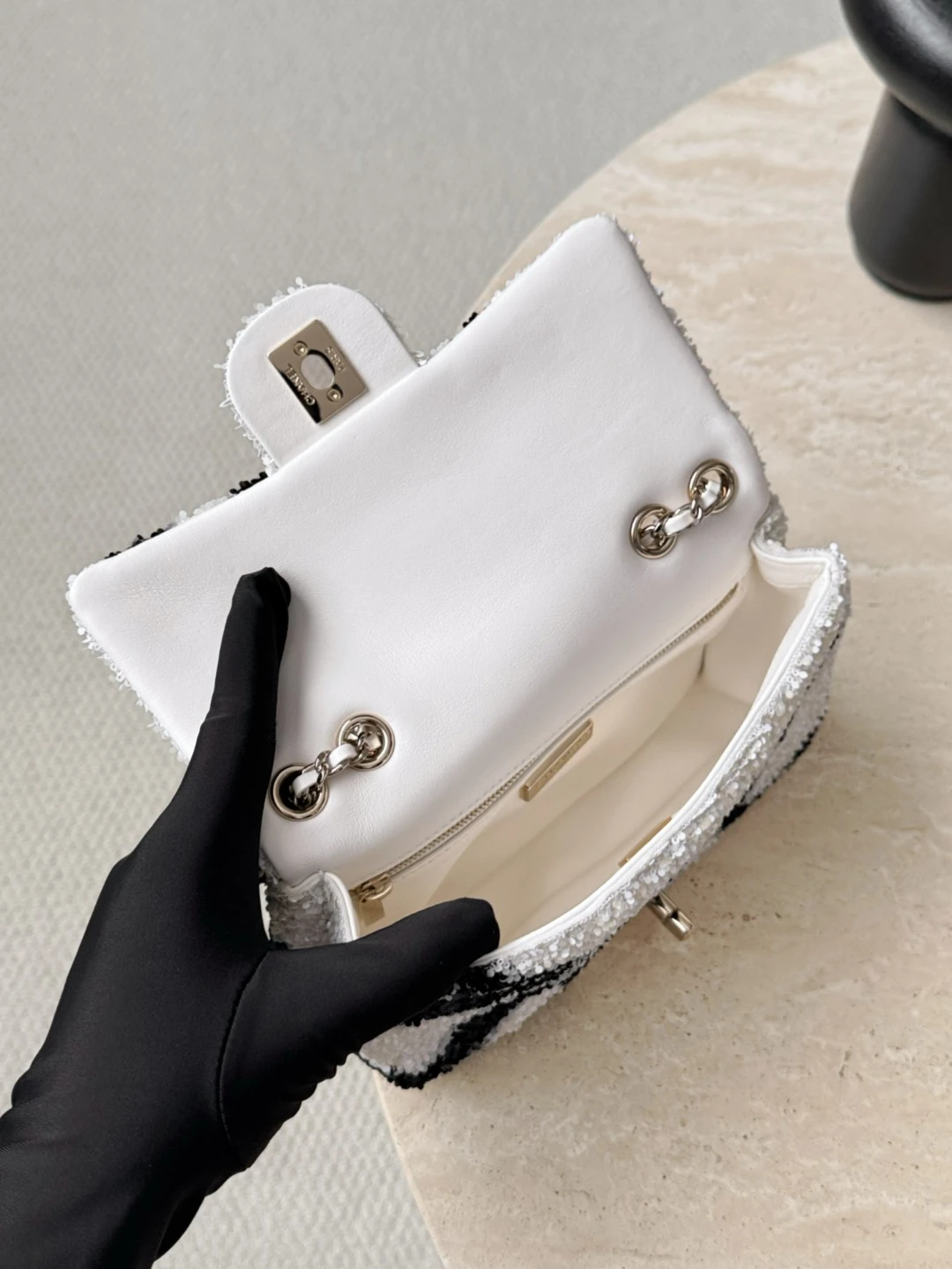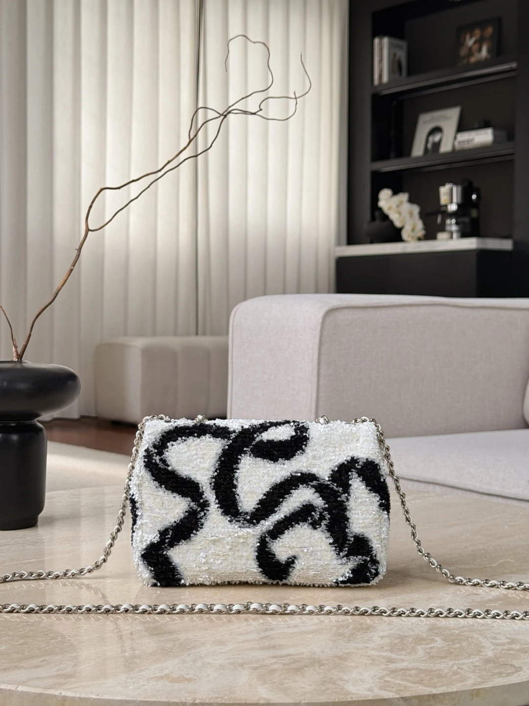 Модель сочетает традиционную эстетику CHANEL с современным графическим акцентом. Корпус выполнен из плотного bouclé‑твидa белого цвета с выразительными чёрными мотивами, которые придают аксессуару характер и визуальную динамику. Клапан фиксируется культовой поворотной застёжкой CC в серебристом тоне; фурнитура и цепочная лямка выдержаны в едином холодном металлическом оттенке, что подчёркивает лаконичность и благородство изделия. Ремень позволяет носить сумку как на плече, так и через плечо для более свободного образа.