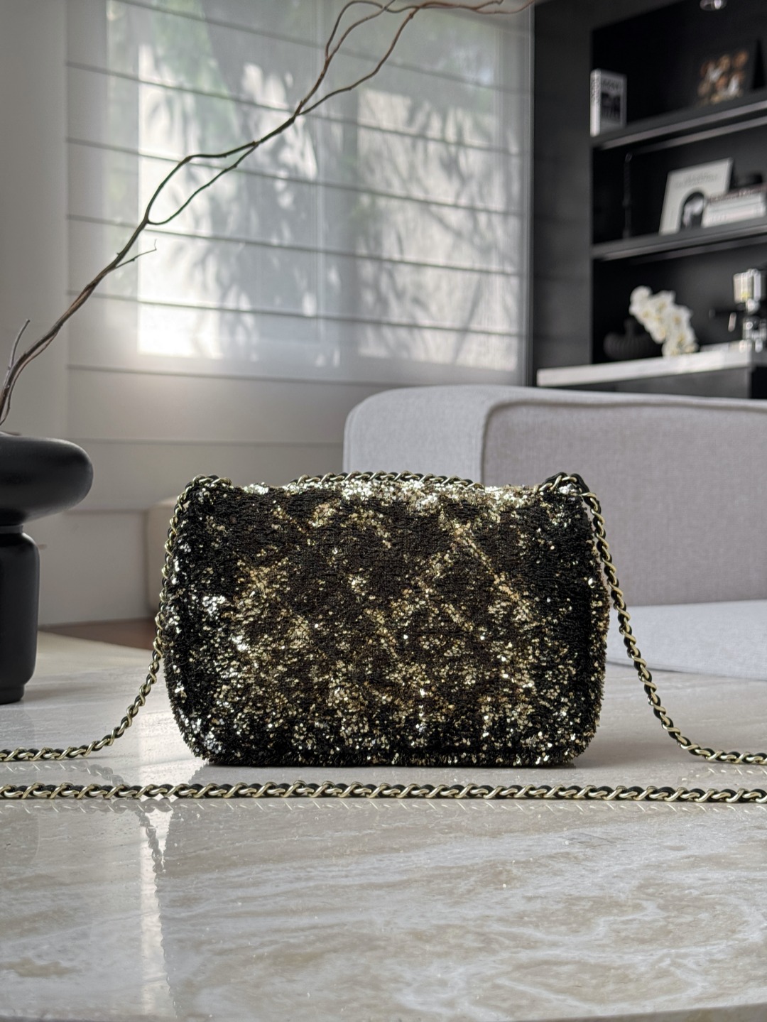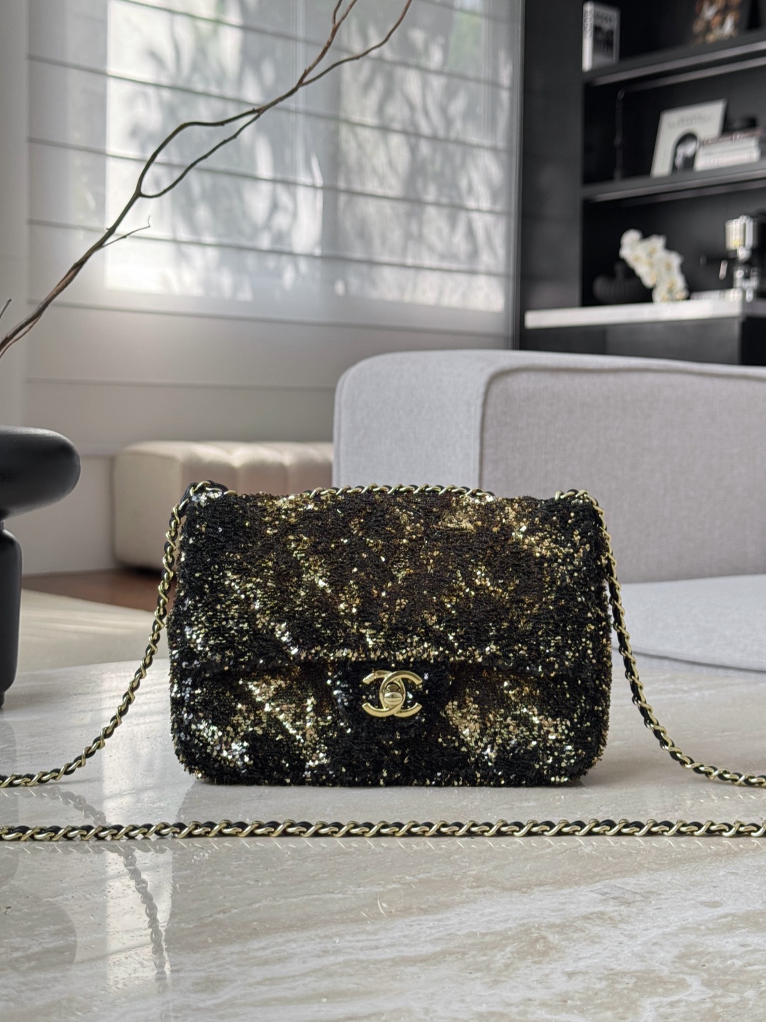 Элегантная маленькая сумка‑флап CHANEL CF20, полностью декорированная пайетками черного и золотого оттенков. Заметный блеск и фирменная золотистая фурнитура с замком‑логотипом CC делают модель идеальной для вечерних образов и особых случаев.