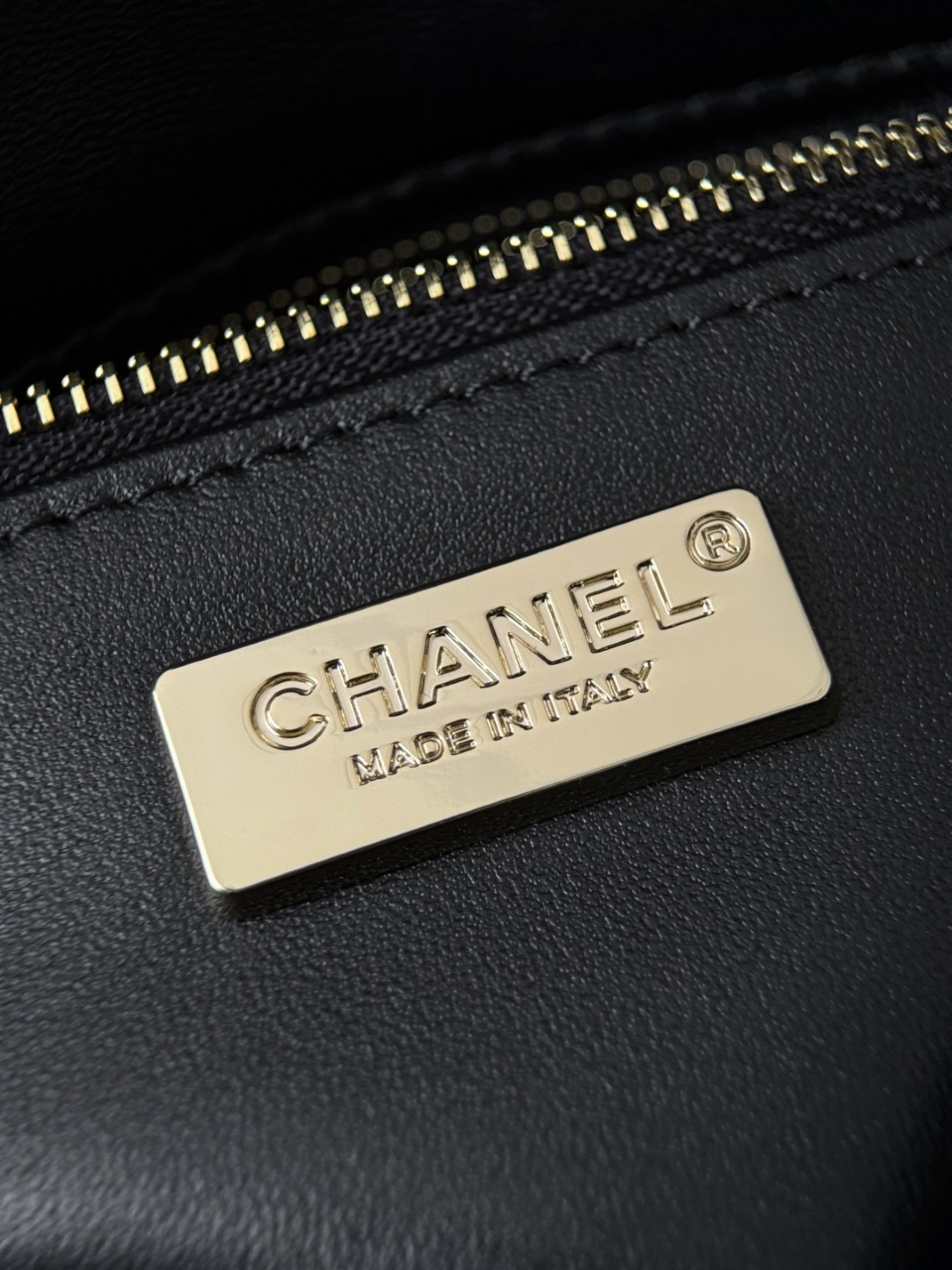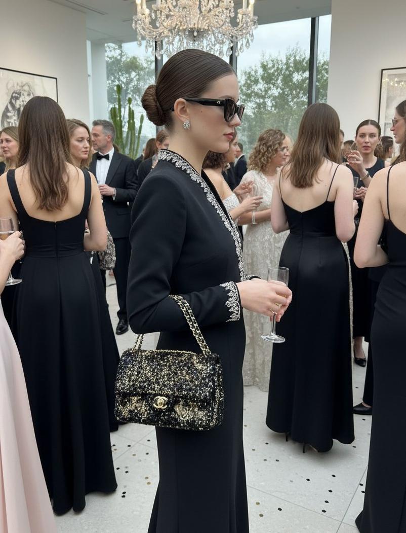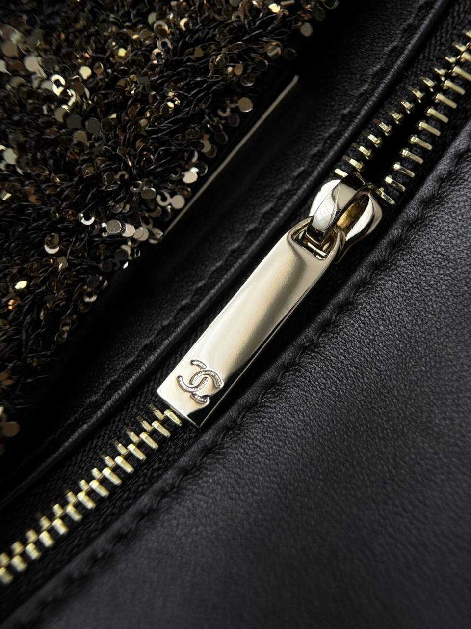 • Внешний вид: корпус сумки выполнен в плотной форме с цельным клапаном‑флапом, поверхность украшена мельчайшими пайетками, которые создают эффект мерцания и легкой игры цвета — преимущественно черный с переливами золотого. Контрастная золотистая фурнитура привлекает внимание: центральный замок в виде переплетённых букв CC и цепочка‑ремень с переплетённой кожей придают модели роскошный законченный вид.