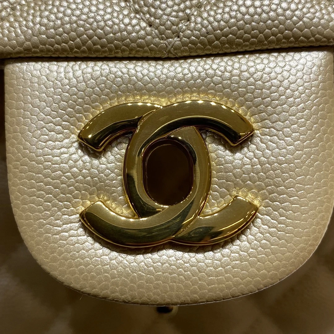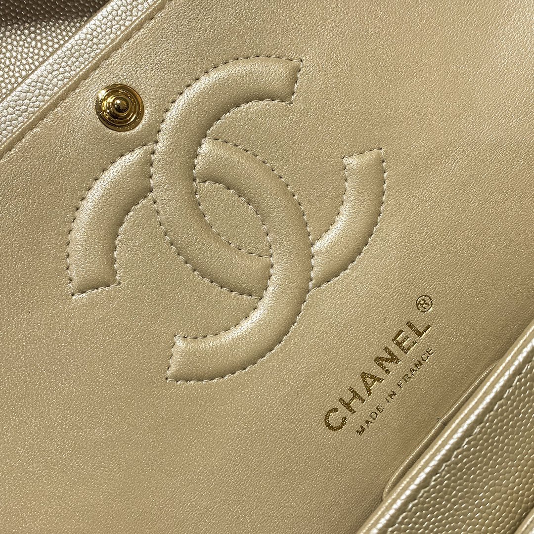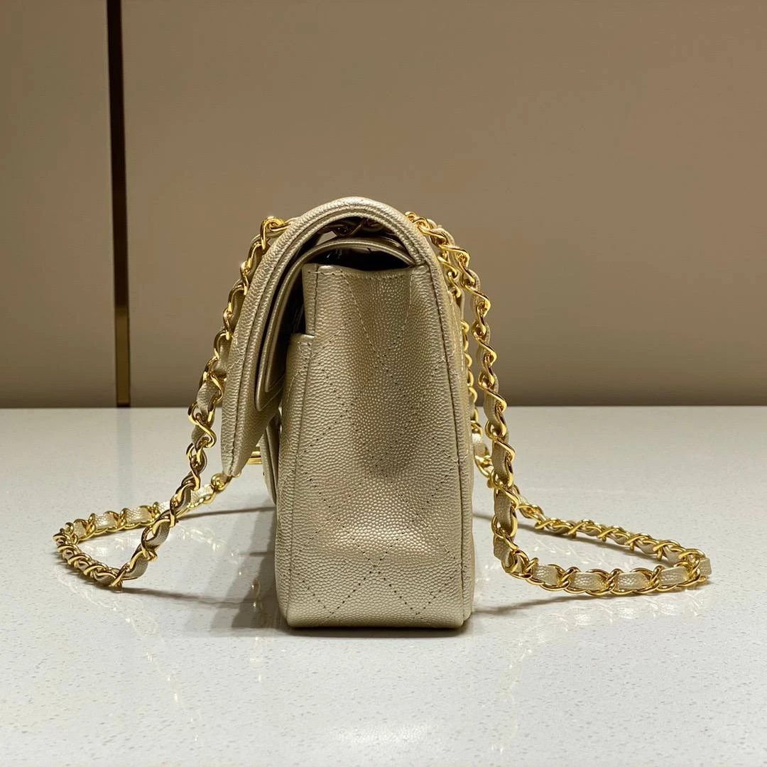 Элегантная сумка CHANEL CF25 — идеальное воплощение классики дома моды: лаконичный прямоугольный силуэт с фирменной ромбовой стежкой, утончённой перламутрово‑золотистой отделкой и золотистой фурнитурой.