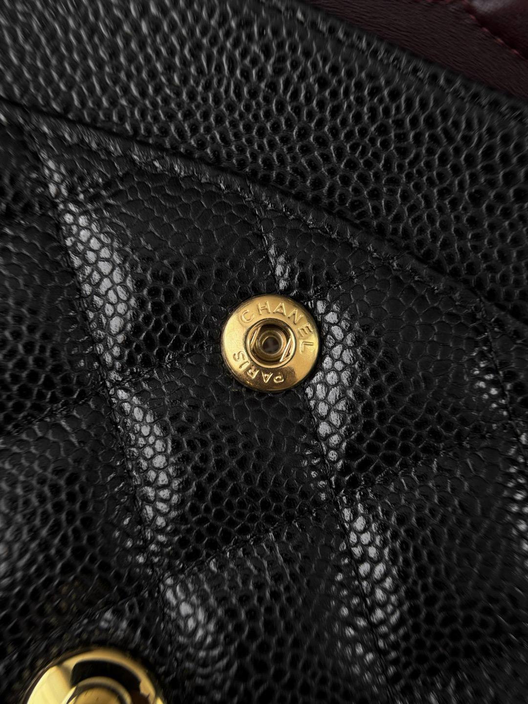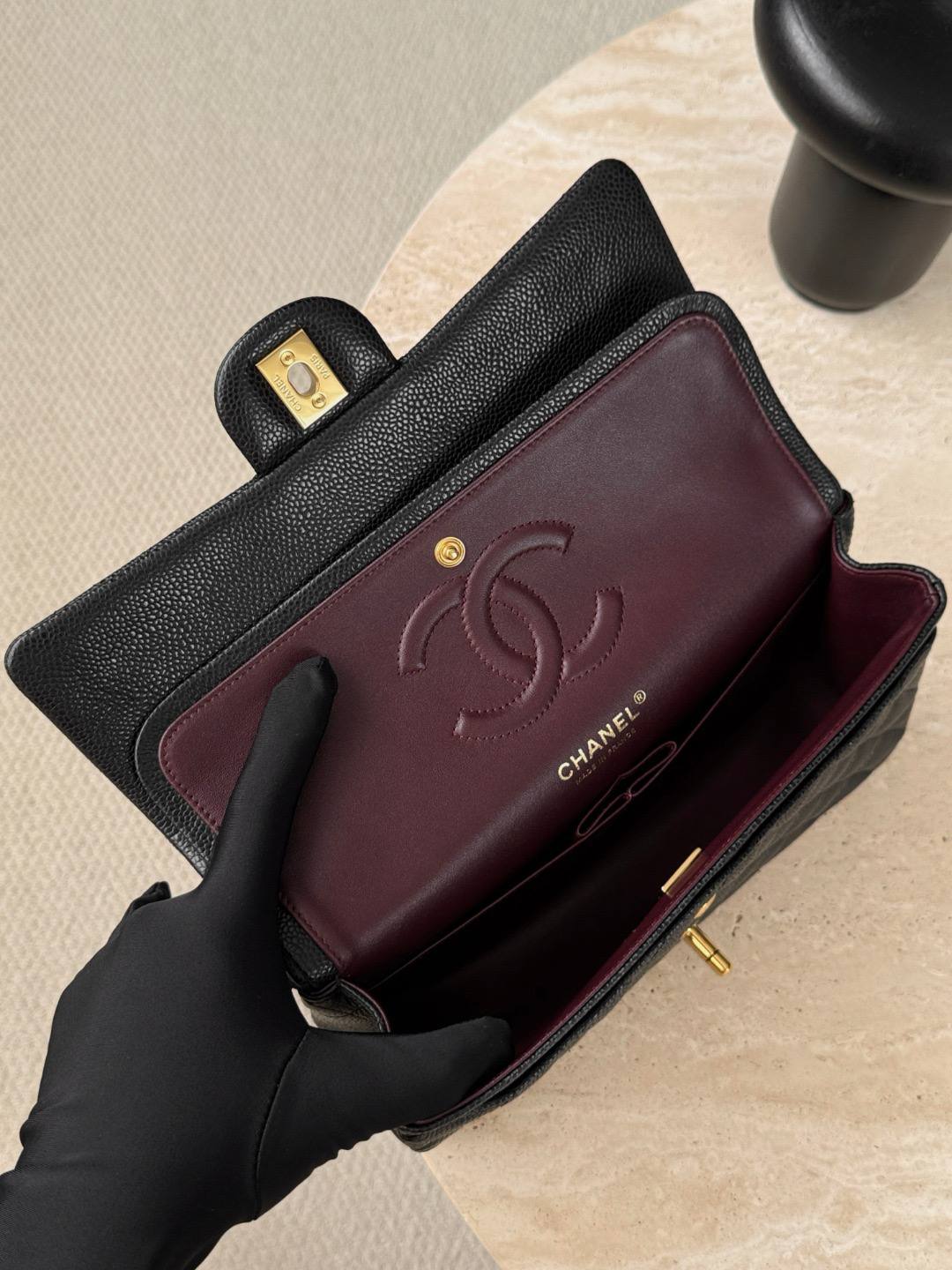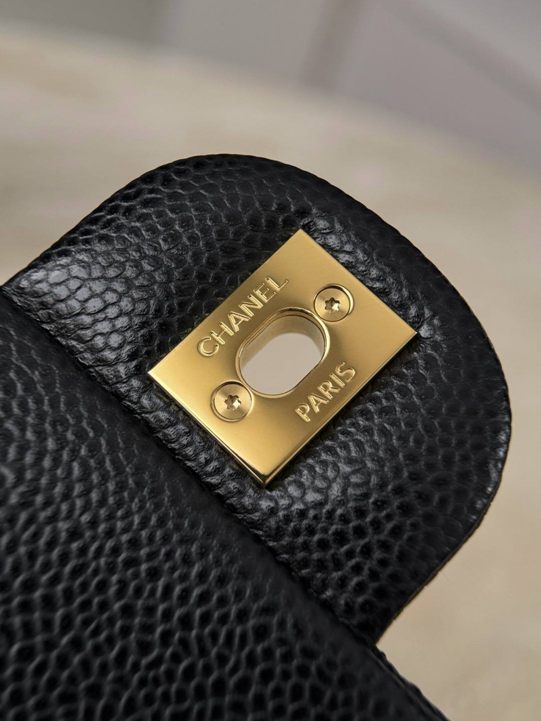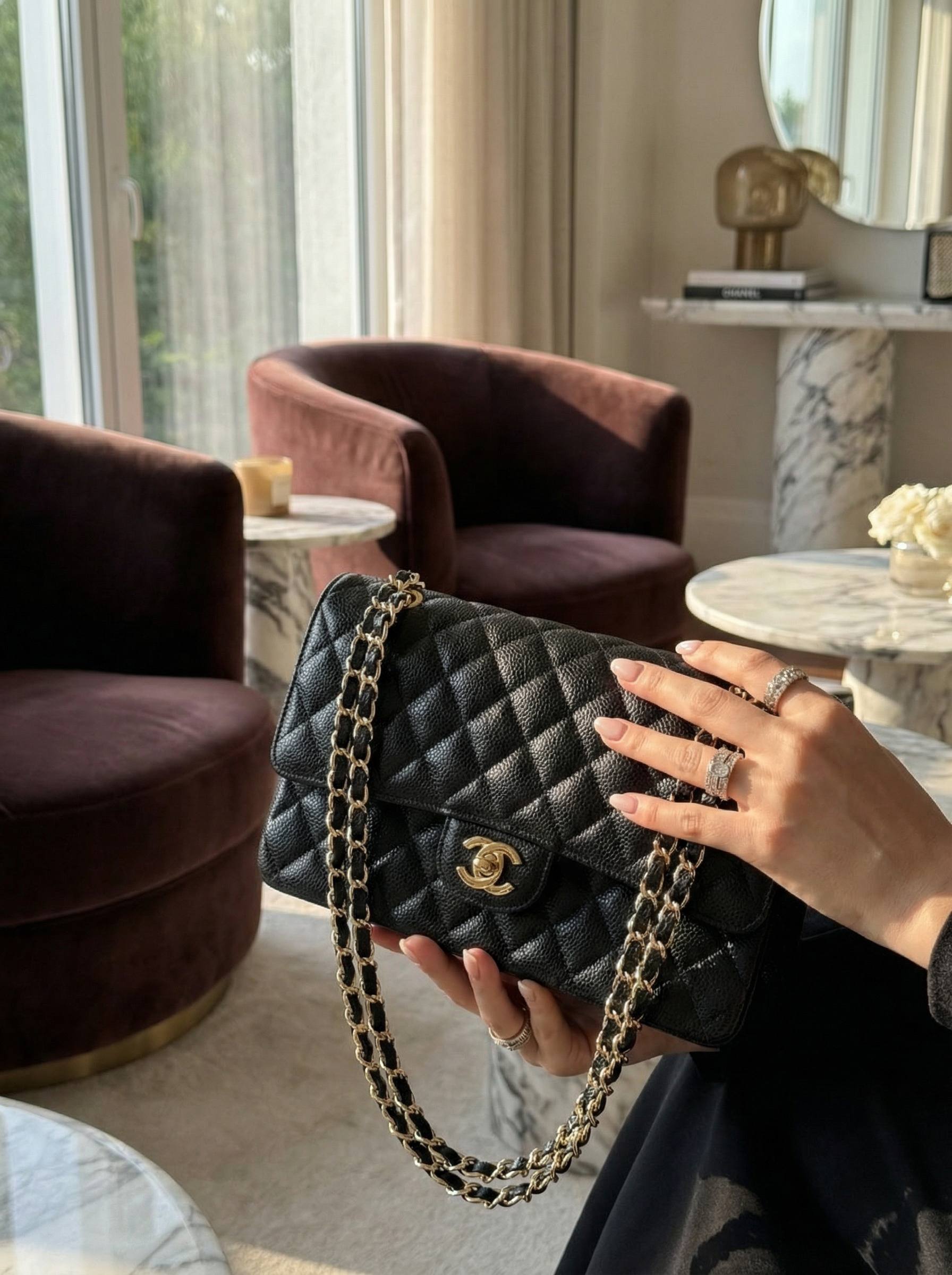 • Дизайн: классический клапан с ромбовидной стежкой, центральная застёжка-твист с логотипом CC в золоте, аккуратные округлые формы и строгая, но женственная геометрия.